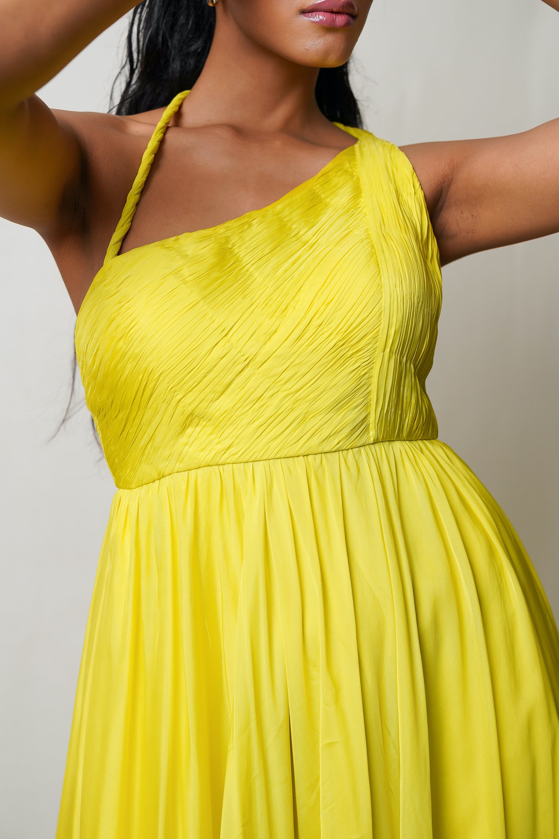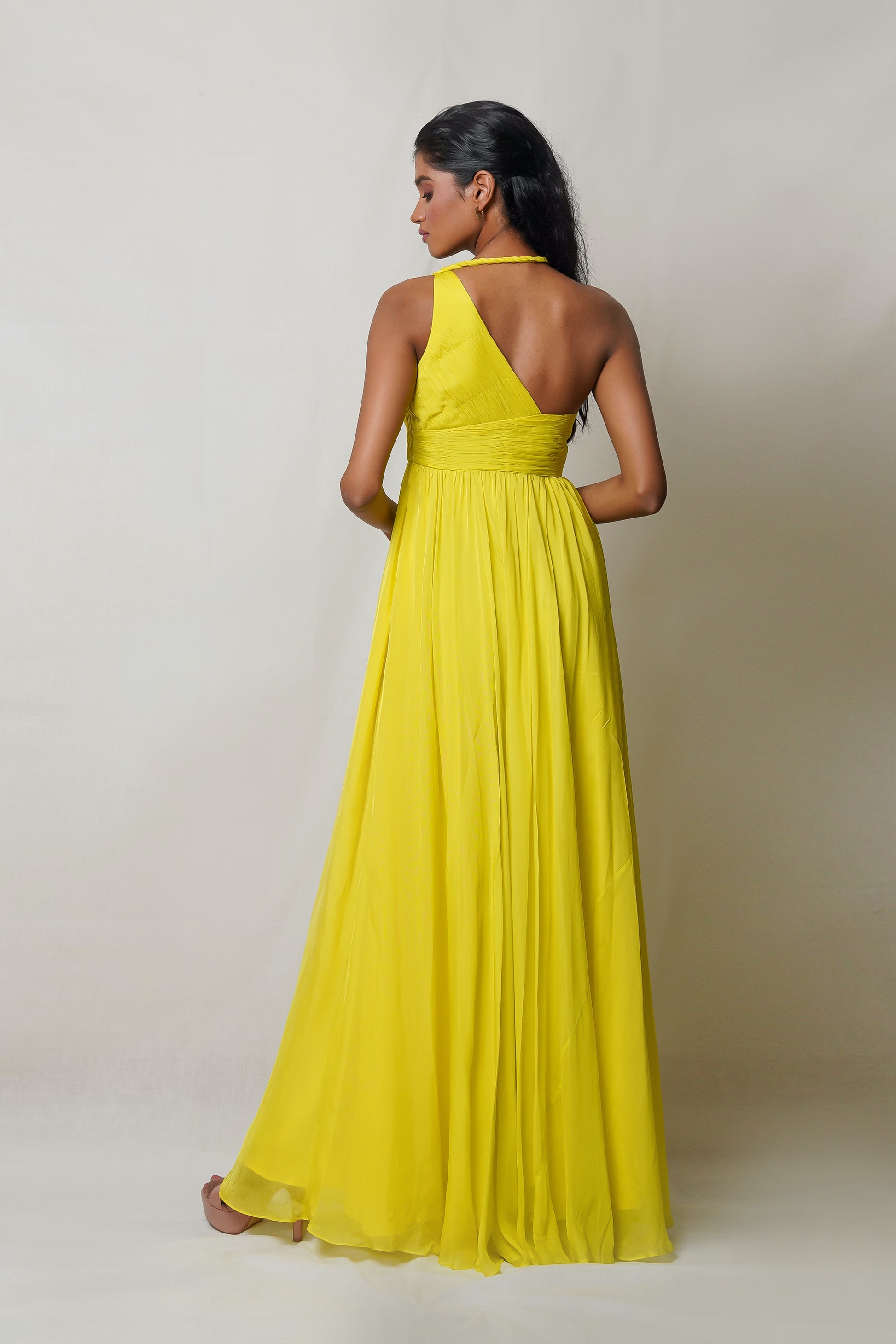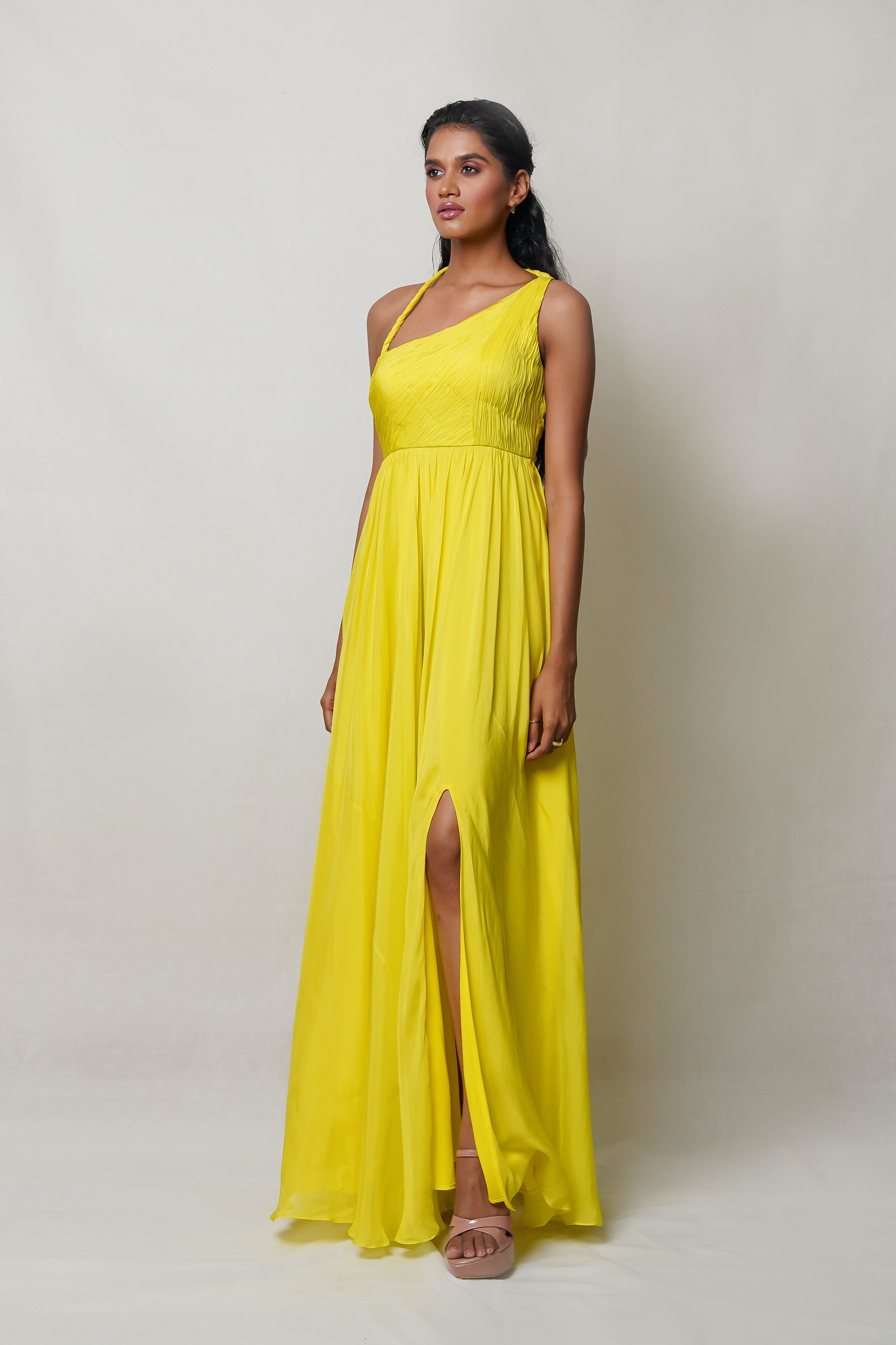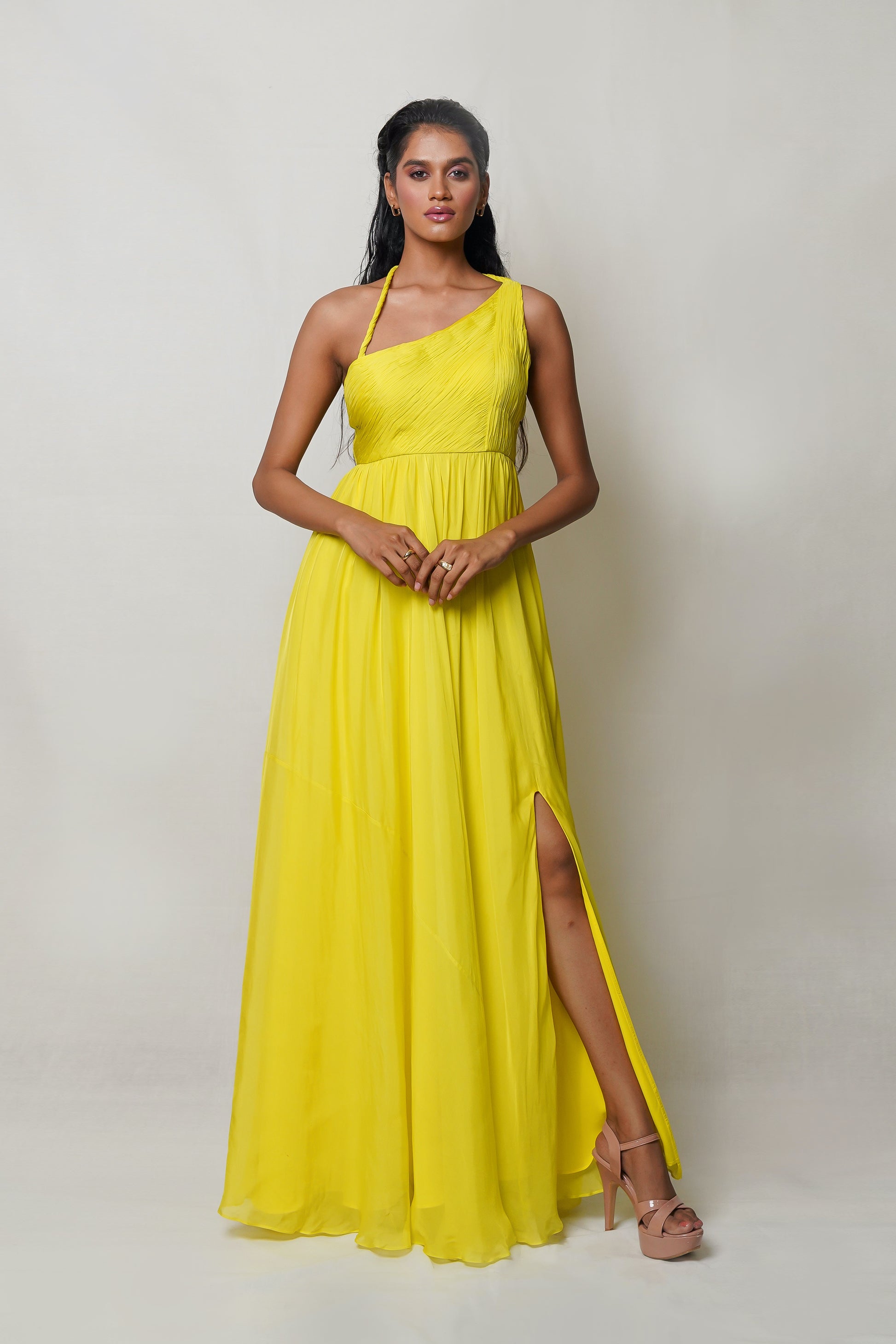 Indulge in luxury and elegance with our Yellow One Shoulder Gown. The twisted braid around the neck and hand pleating on the bodice create a stunning silhouette, while the flared skirt with a slit adds a touch of drama. Perfect for pre-wedding celebrations, weddings, and special occasions. Elevate your style and make a statement.