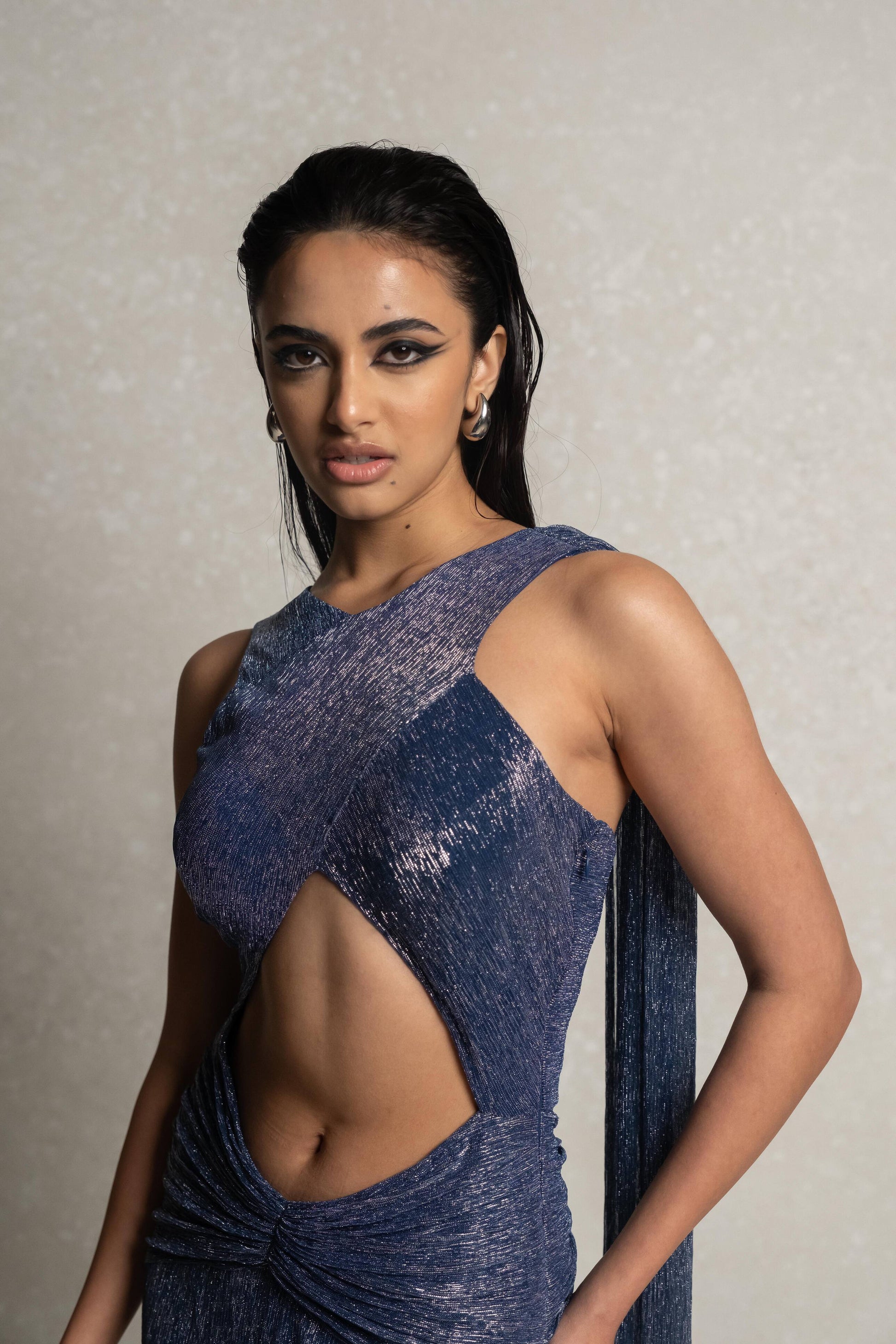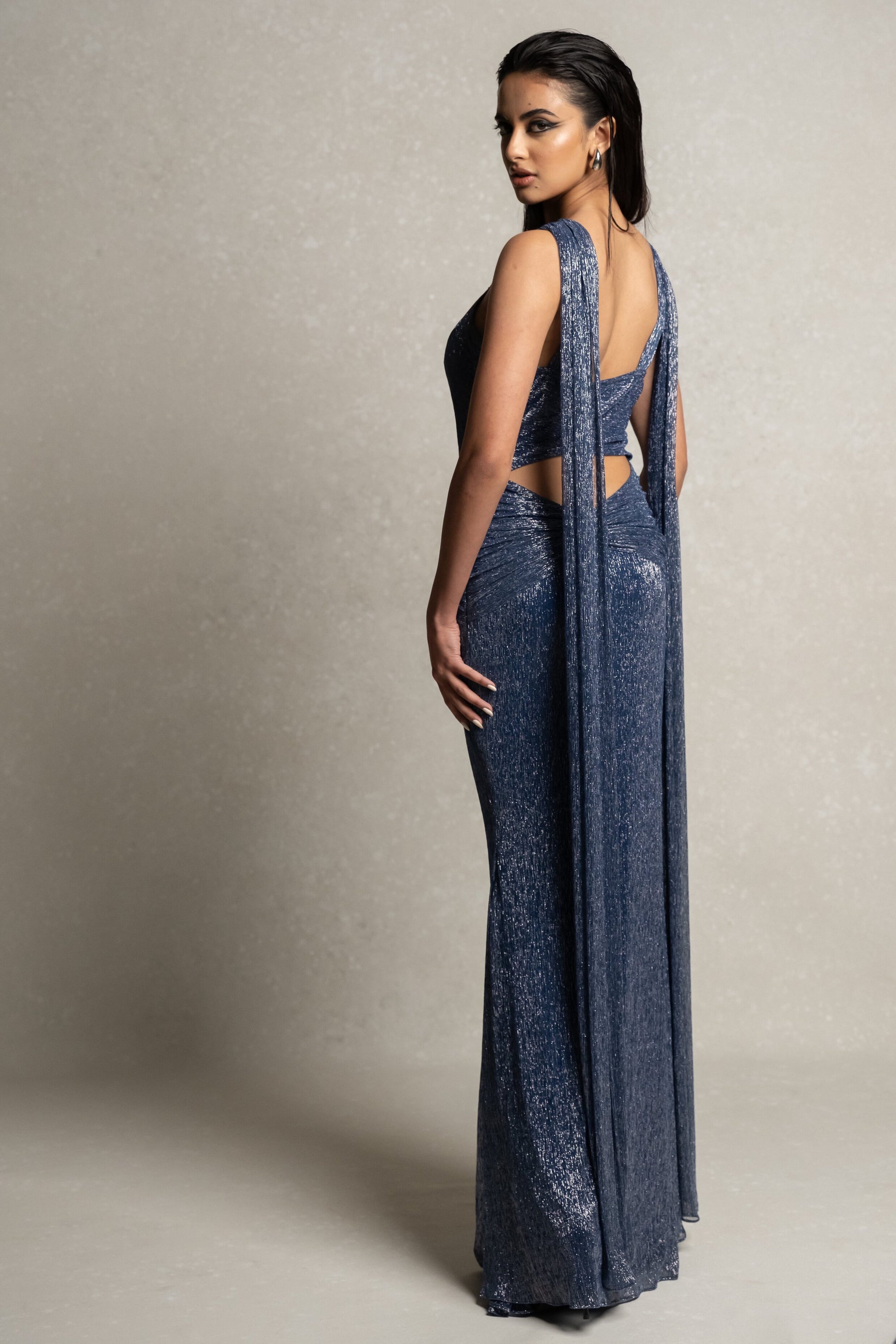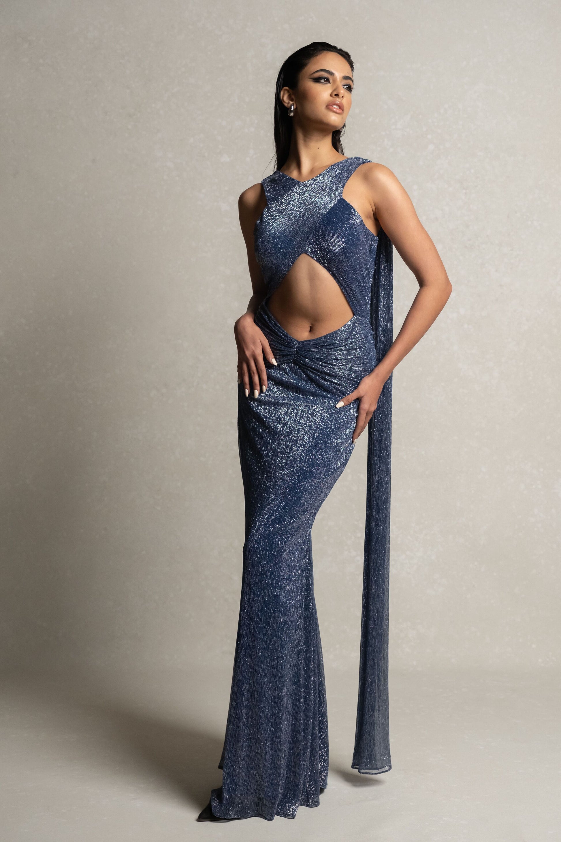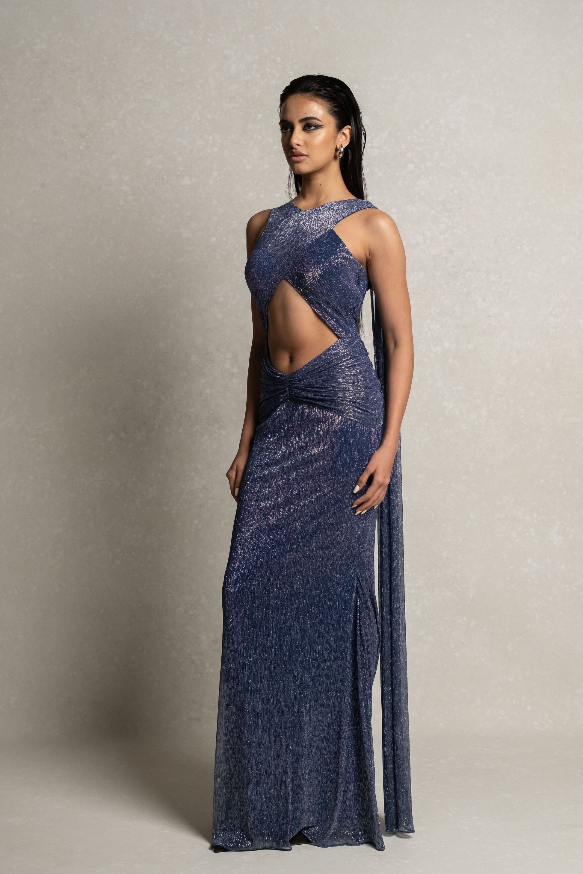 Introducing ARIEN, a luxurious and exclusive metallic blue gown. The front features a draped cross design with elegant trailing shoulders and a fabric waist draping. With a front cut that enhances the mid torso, this gown exudes sophistication and artistry. Elevate your wardrobe with ARIEN.