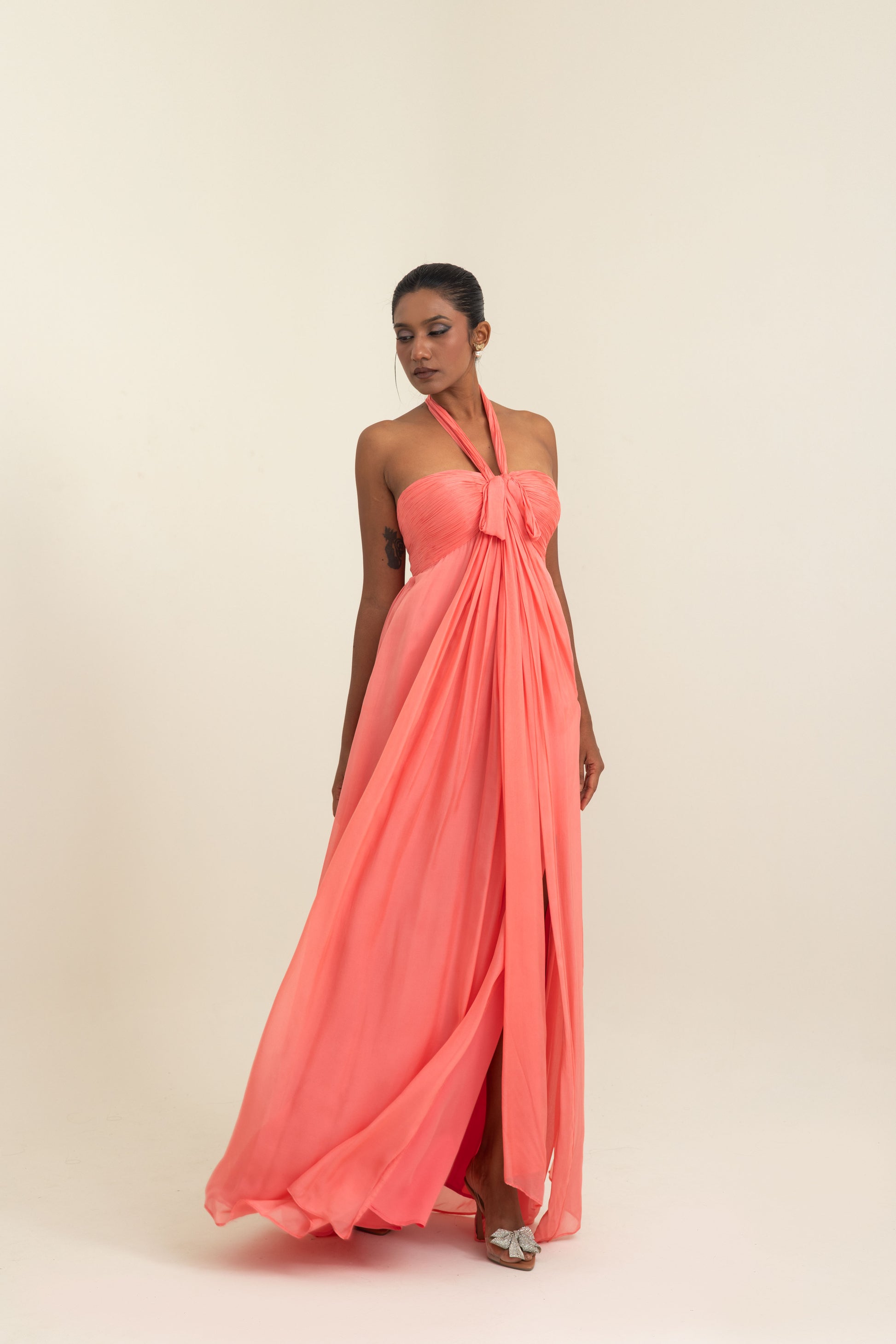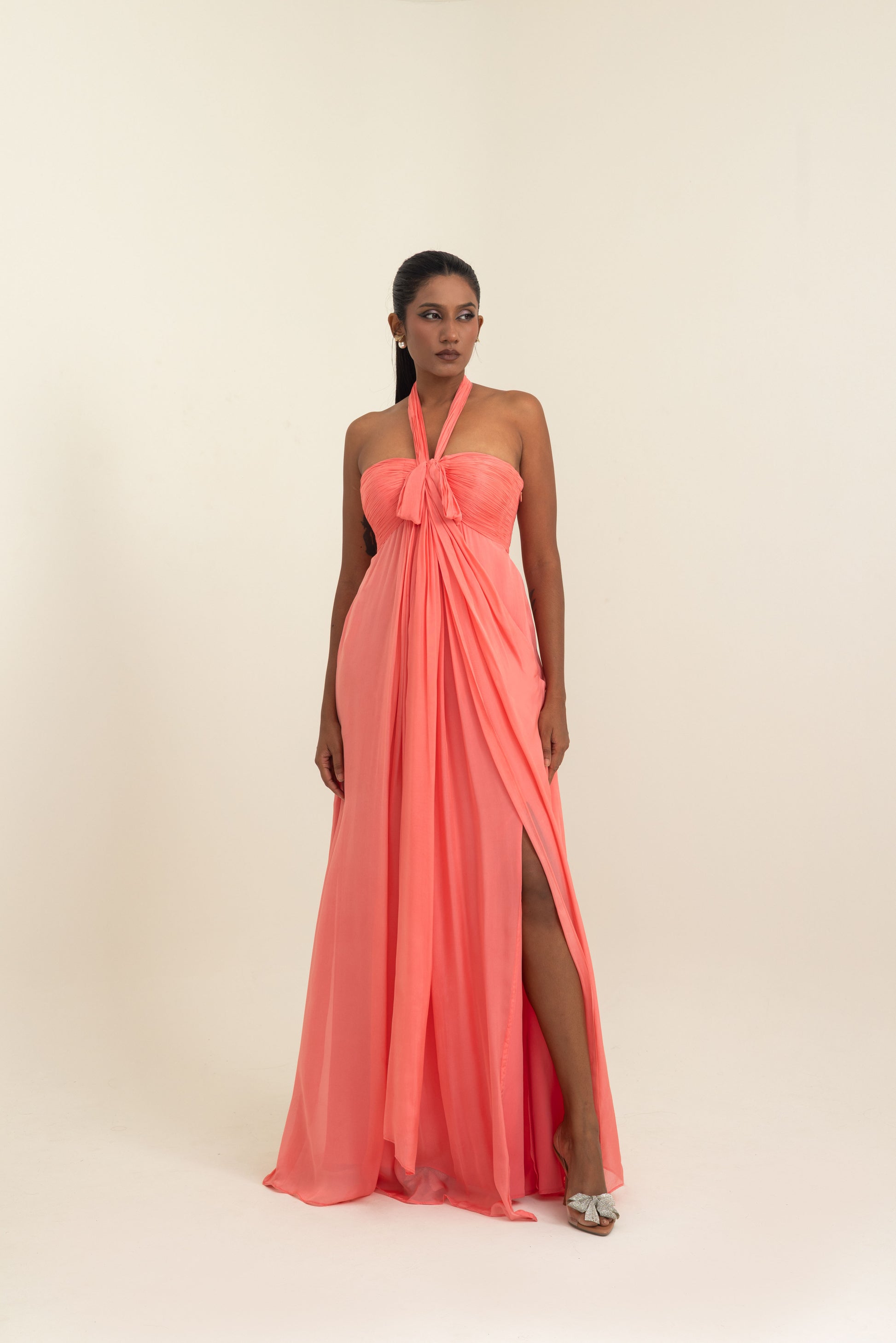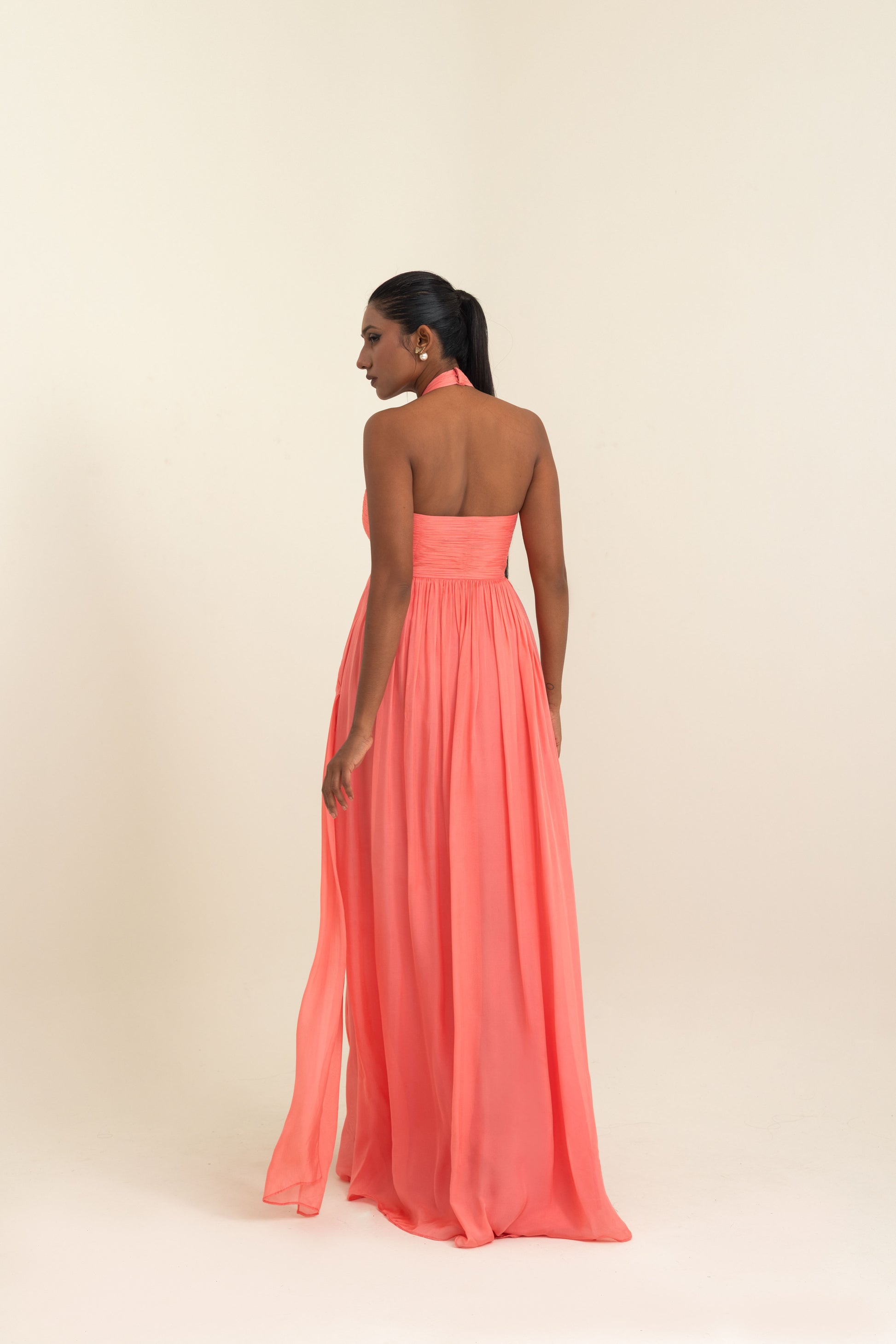 Bathed in the warmth of coral, this gown is crafted from fluid flat chiffon that drapes with effortless ease. The halter neckline, finished with a soft tie-knot, frames the shoulders with grace, while the gown’s free-flowing silhouette cascades into airy layers that move like a gentle breeze. A subtle front slit adds a touch of allure, balancing playfulness with sophistication.