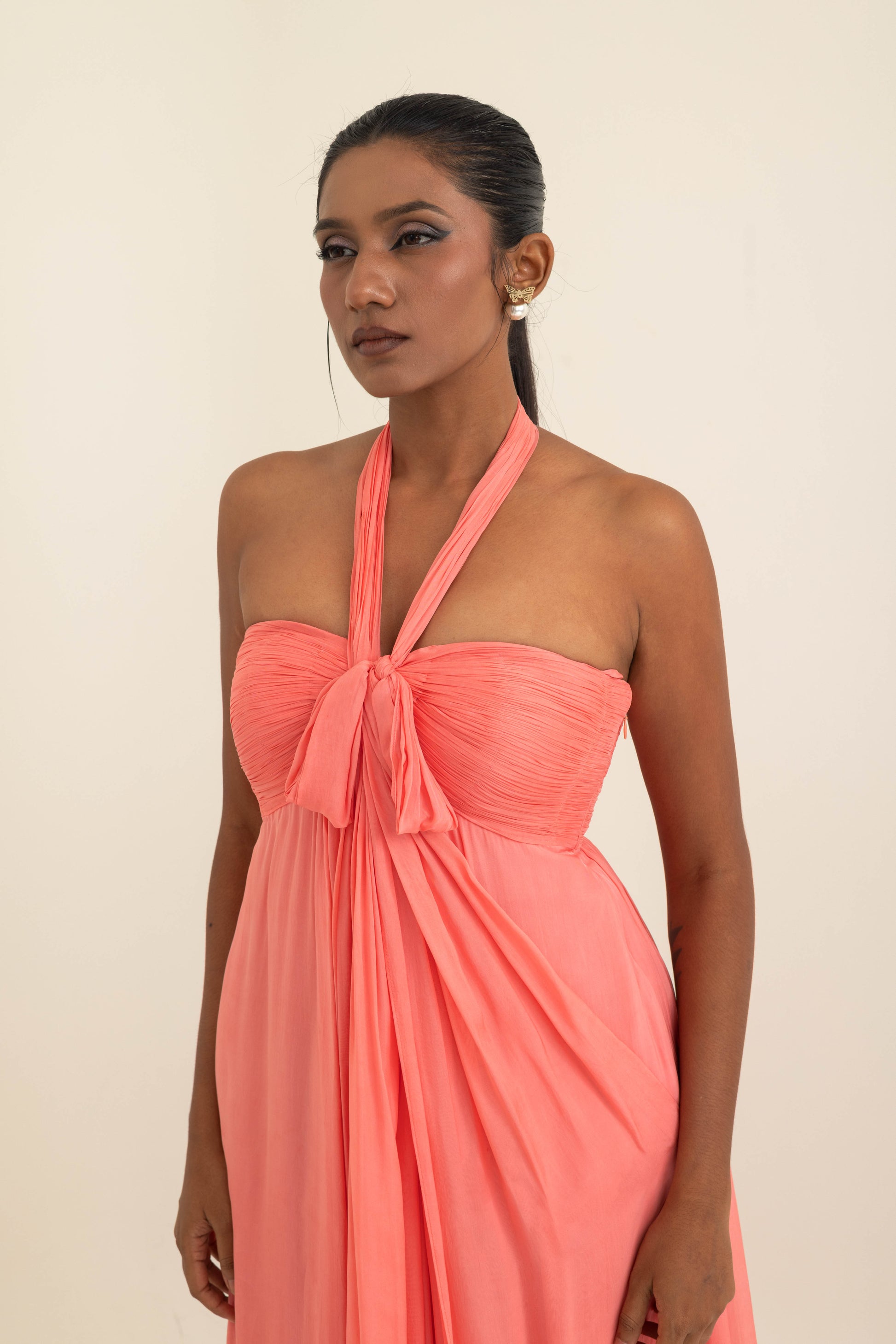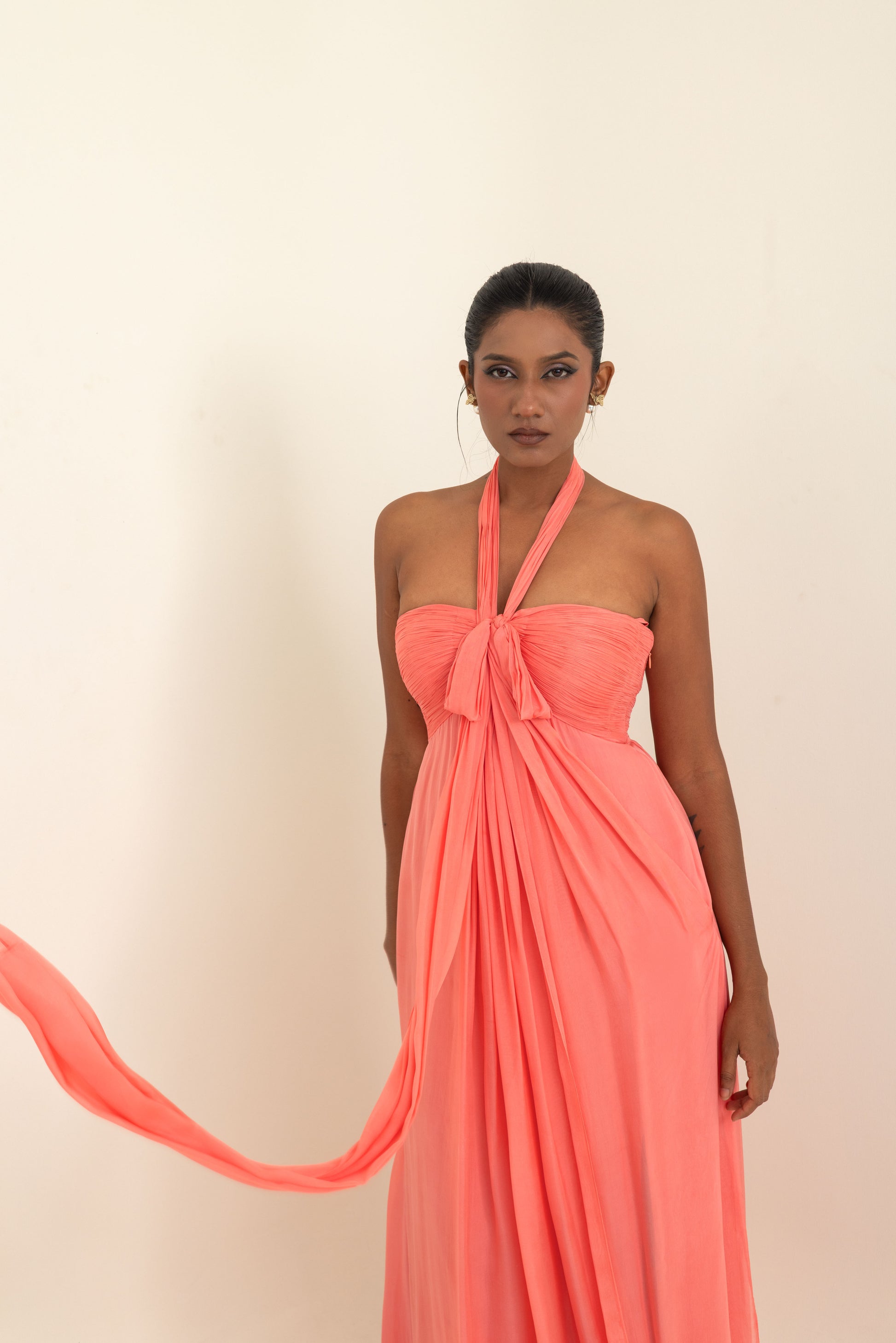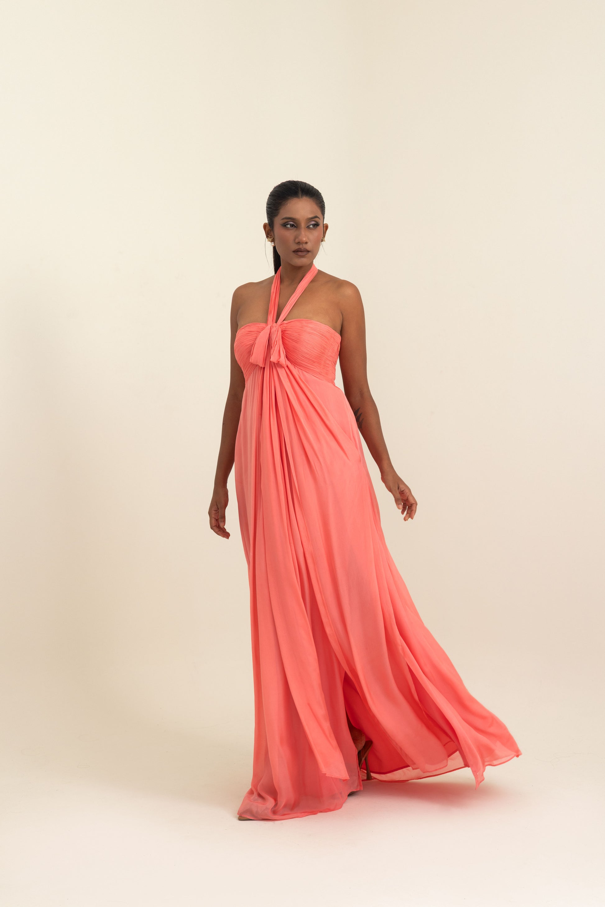 Bathed in the warmth of coral, this gown is crafted from fluid flat chiffon that drapes with effortless ease. The halter neckline, finished with a soft tie-knot, frames the shoulders with grace, while the gown’s free-flowing silhouette cascades into airy layers that move like a gentle breeze. A subtle front slit adds a touch of allure, balancing playfulness with sophistication.