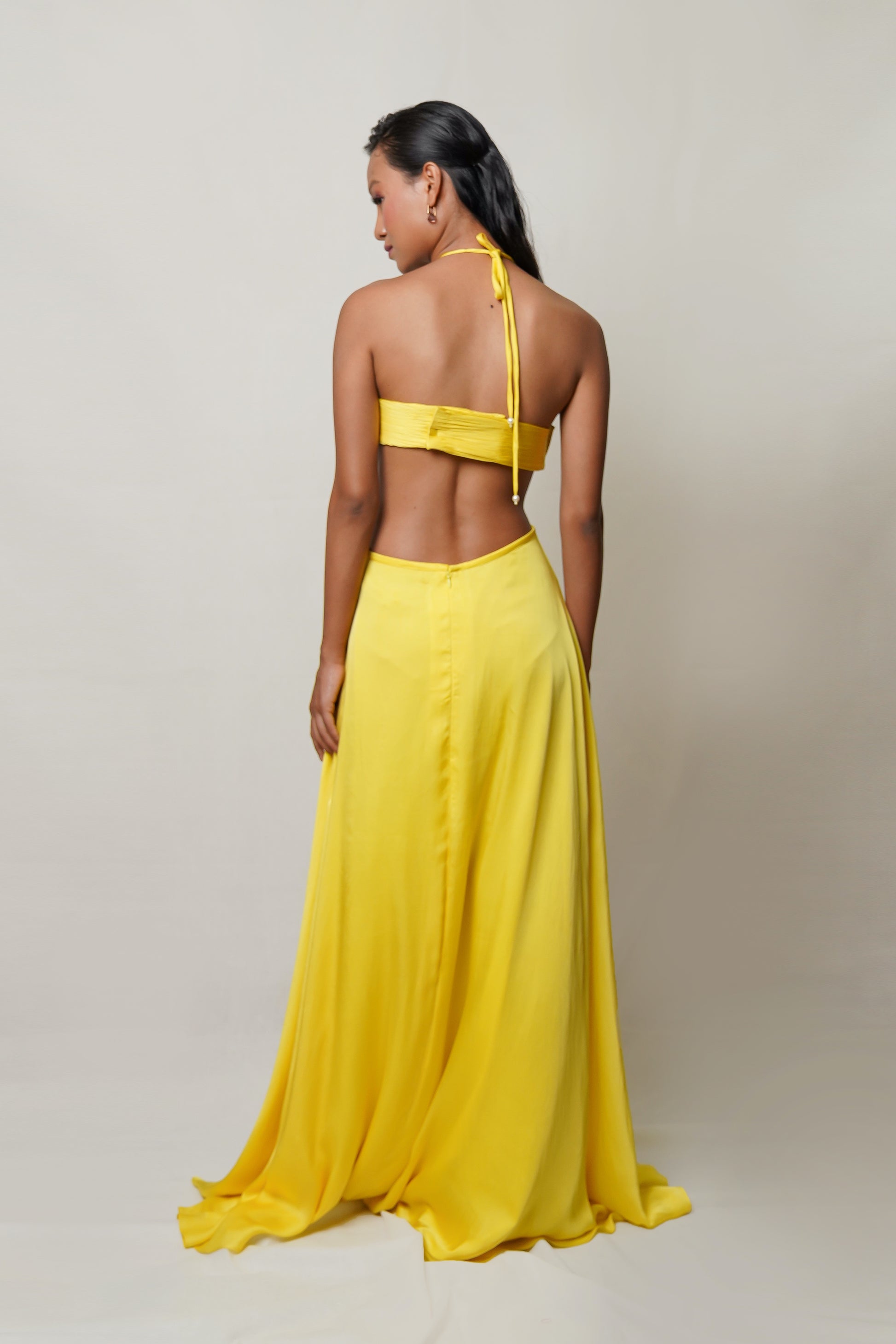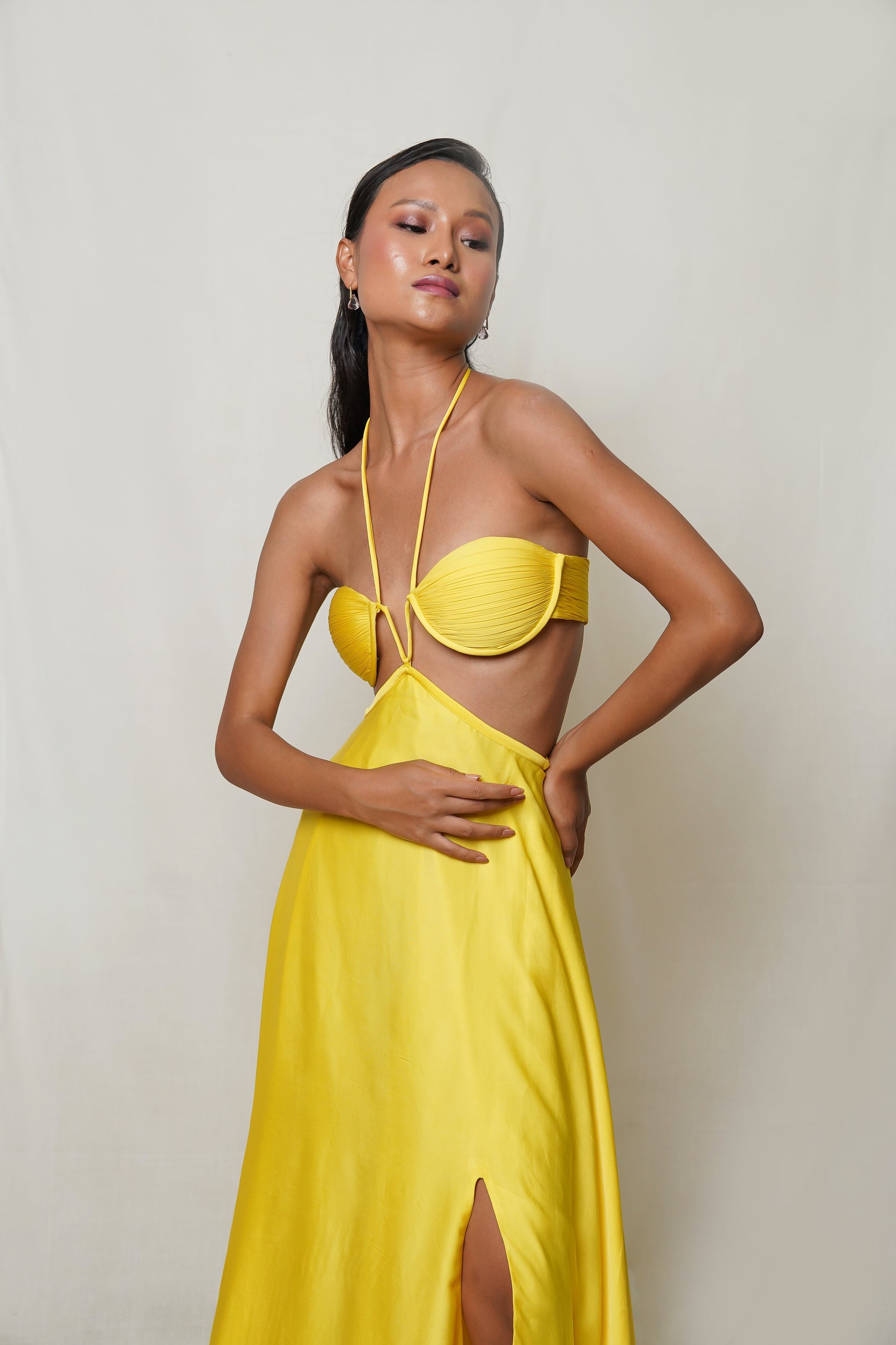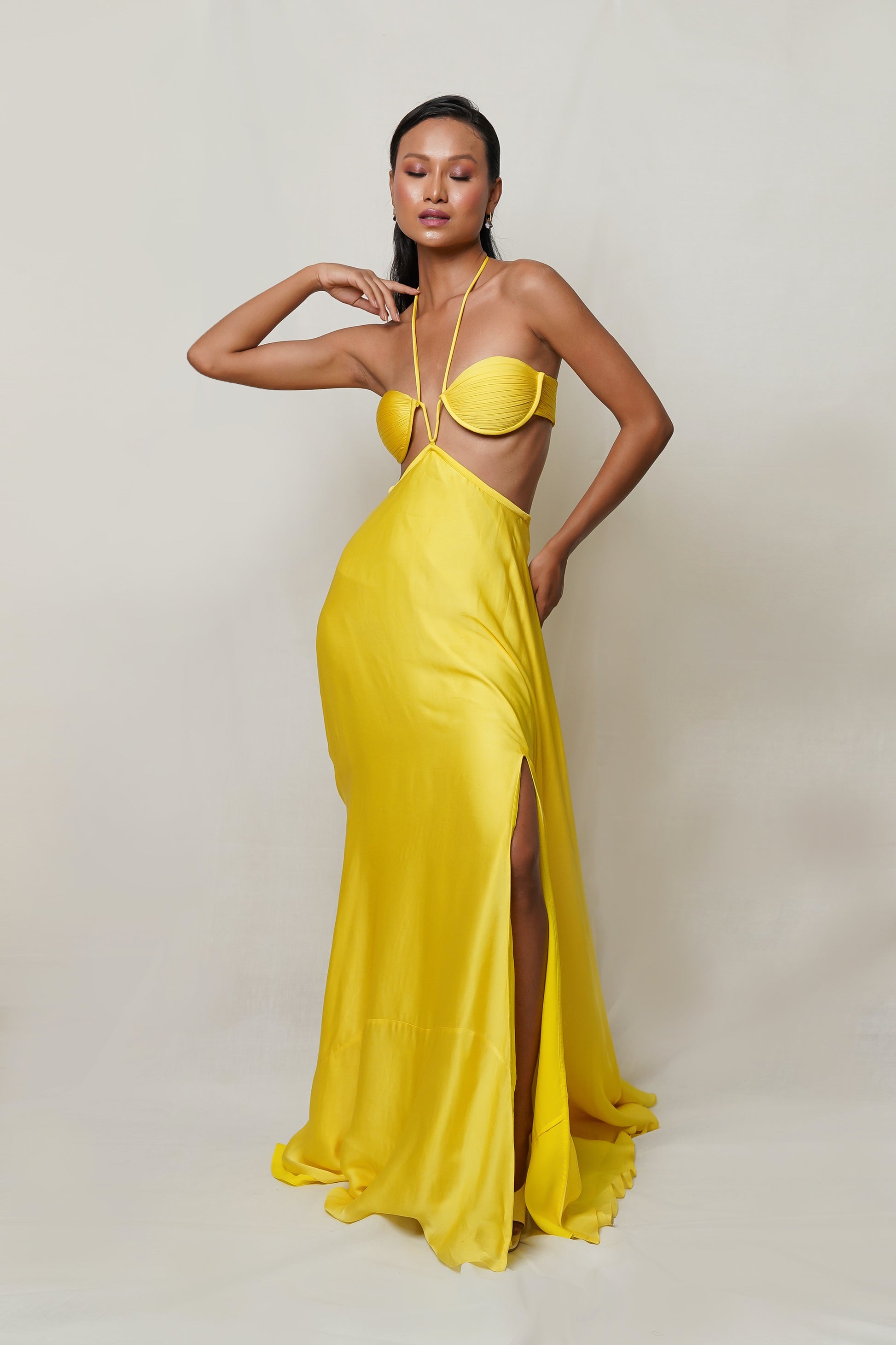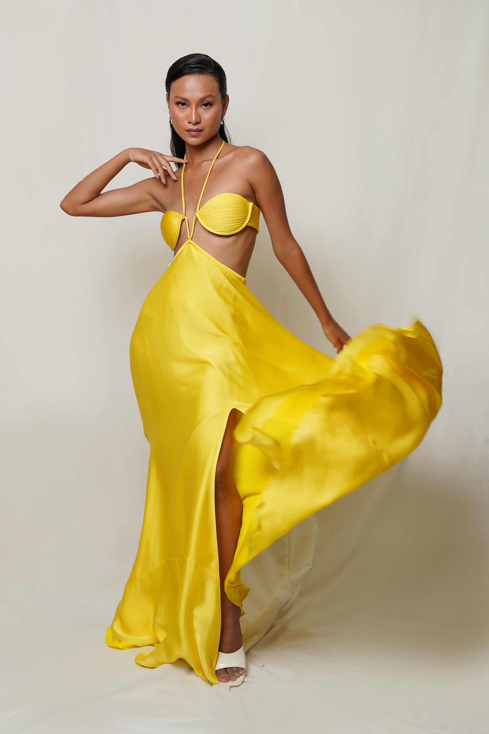 Introducing CITRINE, the ultimate in sophistication and elegance. This striking yellow gown features hand-pleated, wired sculpted cups that enhance your figure while the draped skirt adds movement and flow. Complete with a sultry slit, this gown will make you stand out at any event.