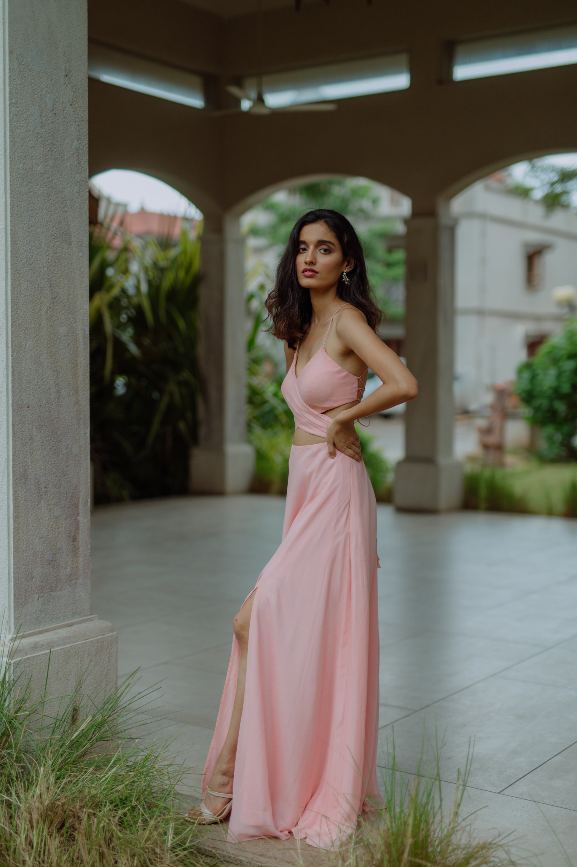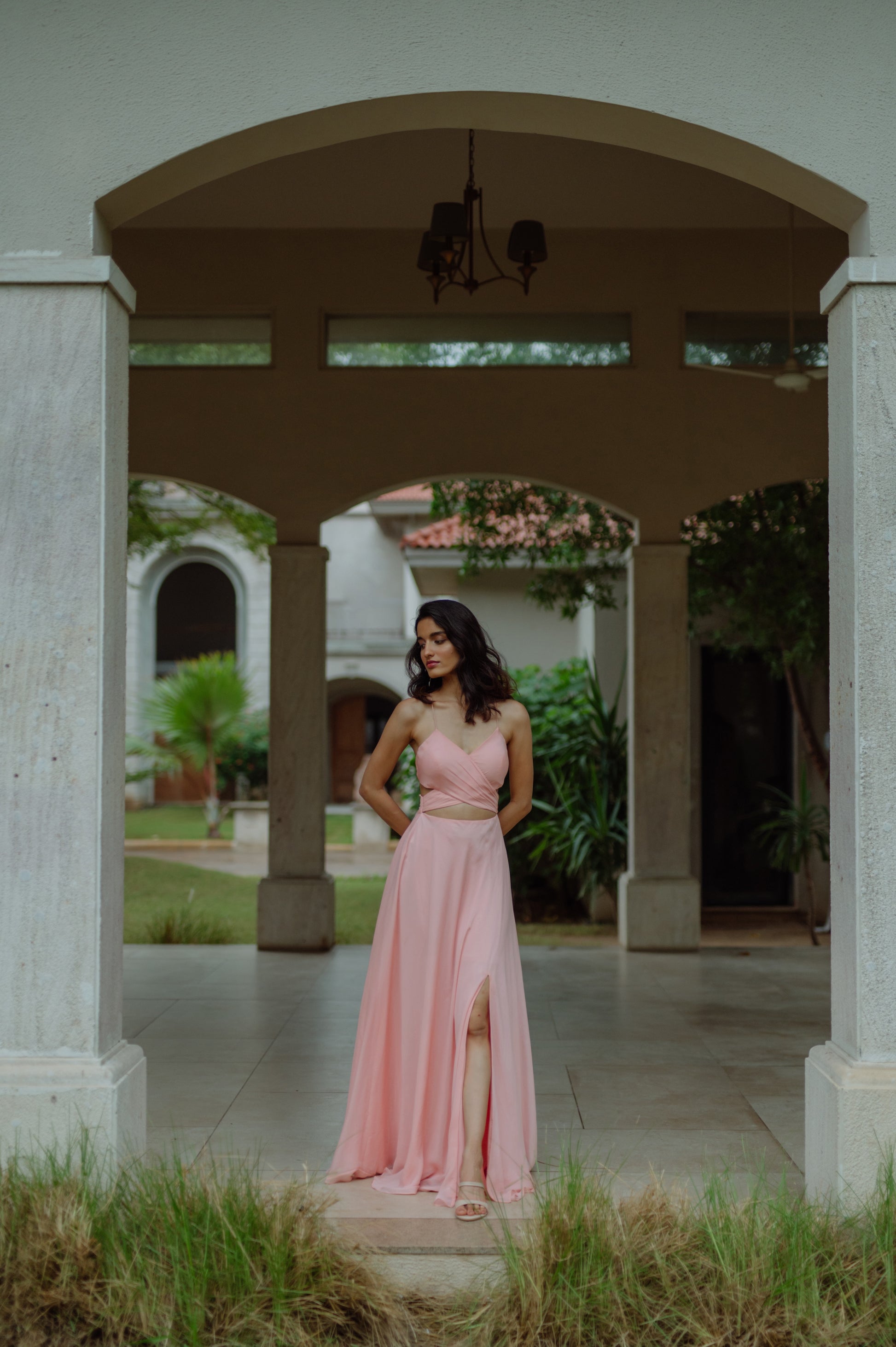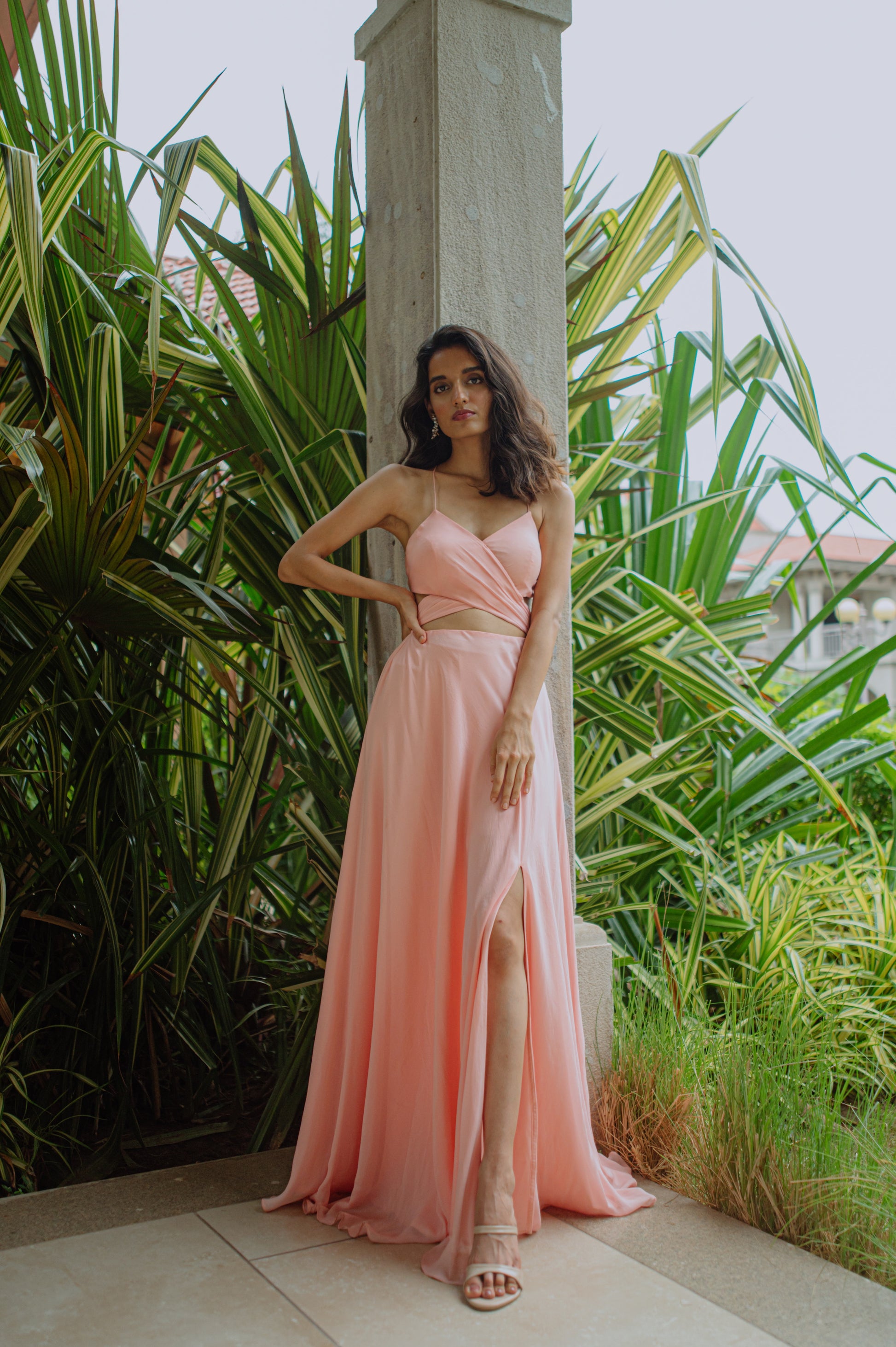 Indulge in a luxurious getaway with our Peach Overlap Gown. Featuring a sexy back and slit, it's the perfect choice for beach vacations, honeymoons, or intimate dates. Embrace the sensuality and elegance of our gown on your next escape.