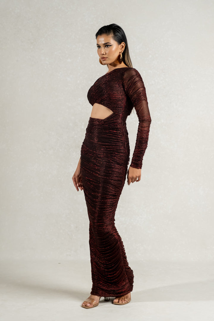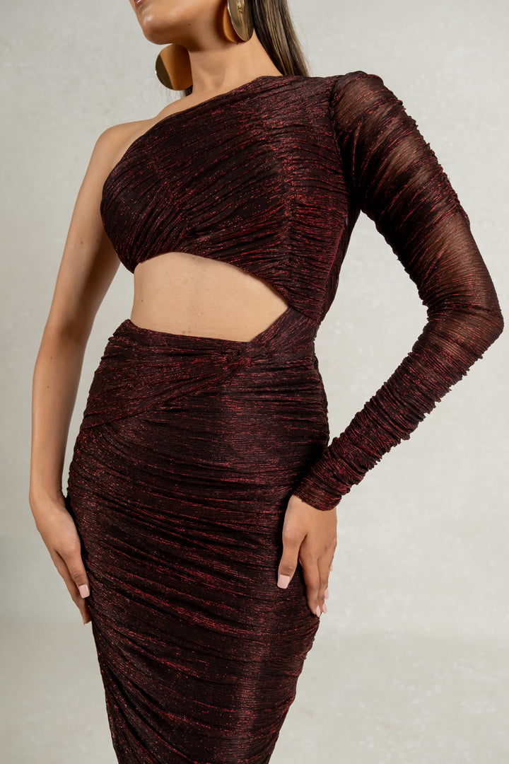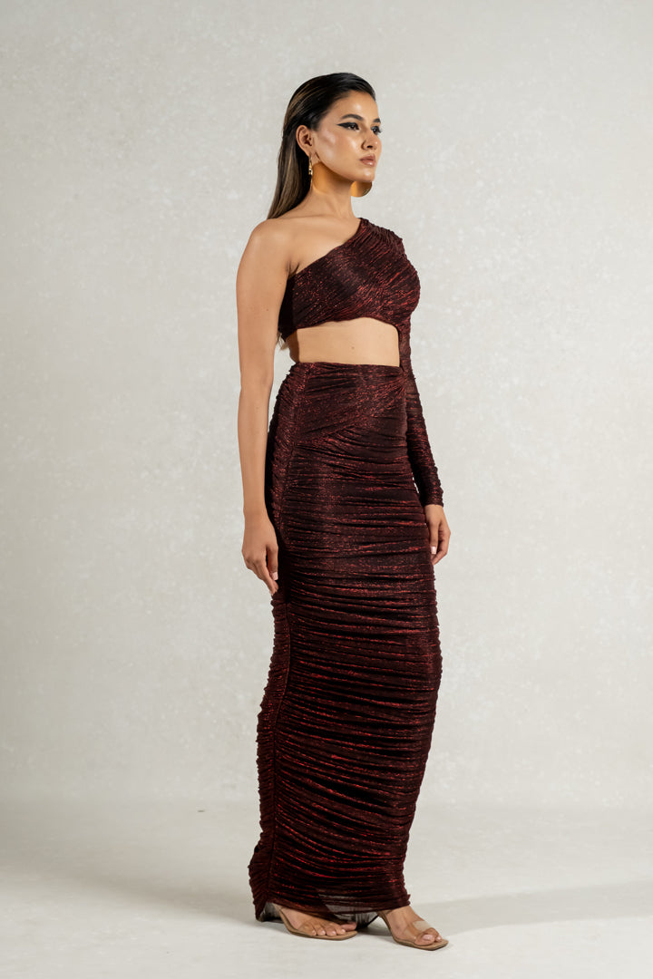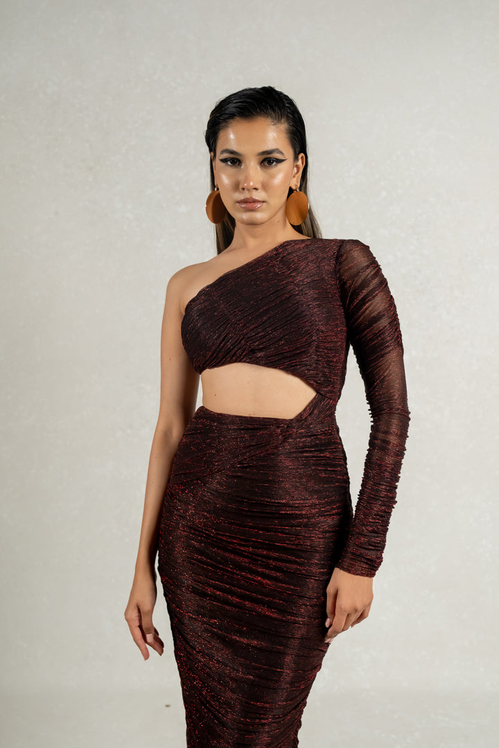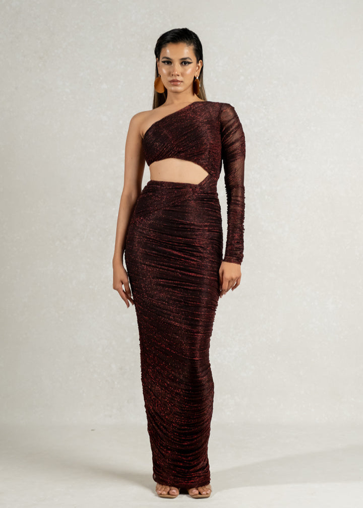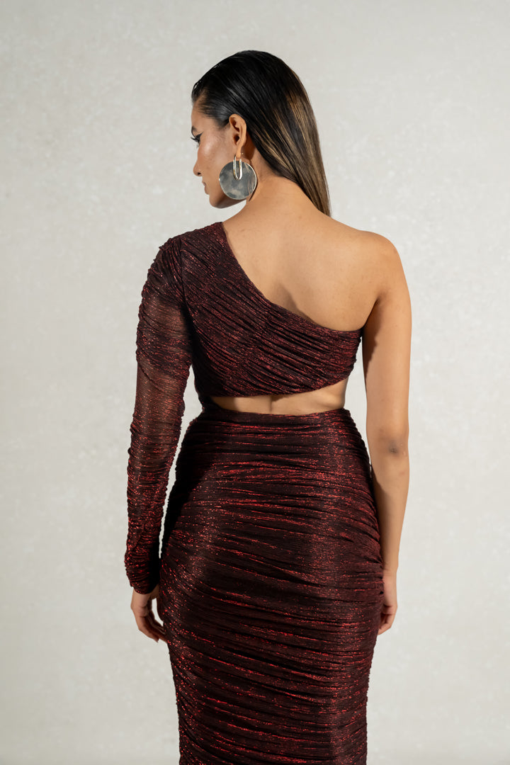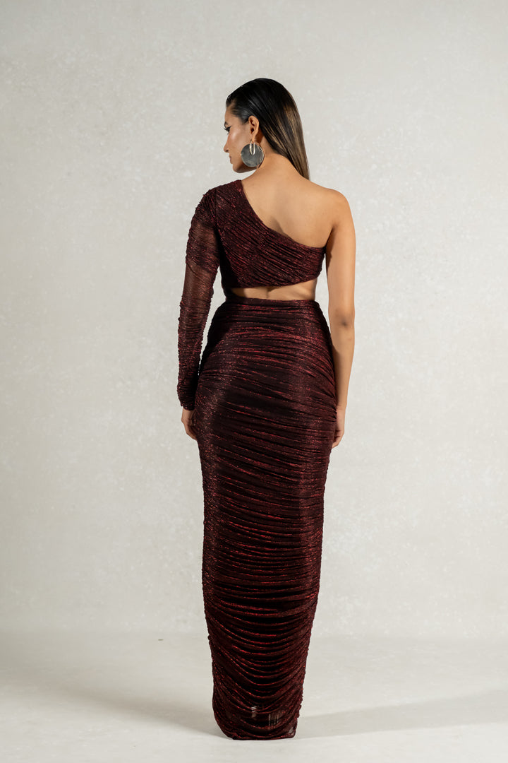 Indulge in luxury with INARA, the metallic red body hugging gown that sculpts your body to perfection. The hand pleated bodice and draped one sleeve exude elegance, while the sexy side cut and draped skirt add a touch of sensuality. Perfect for red carpets, cocktails, and destination weddings.