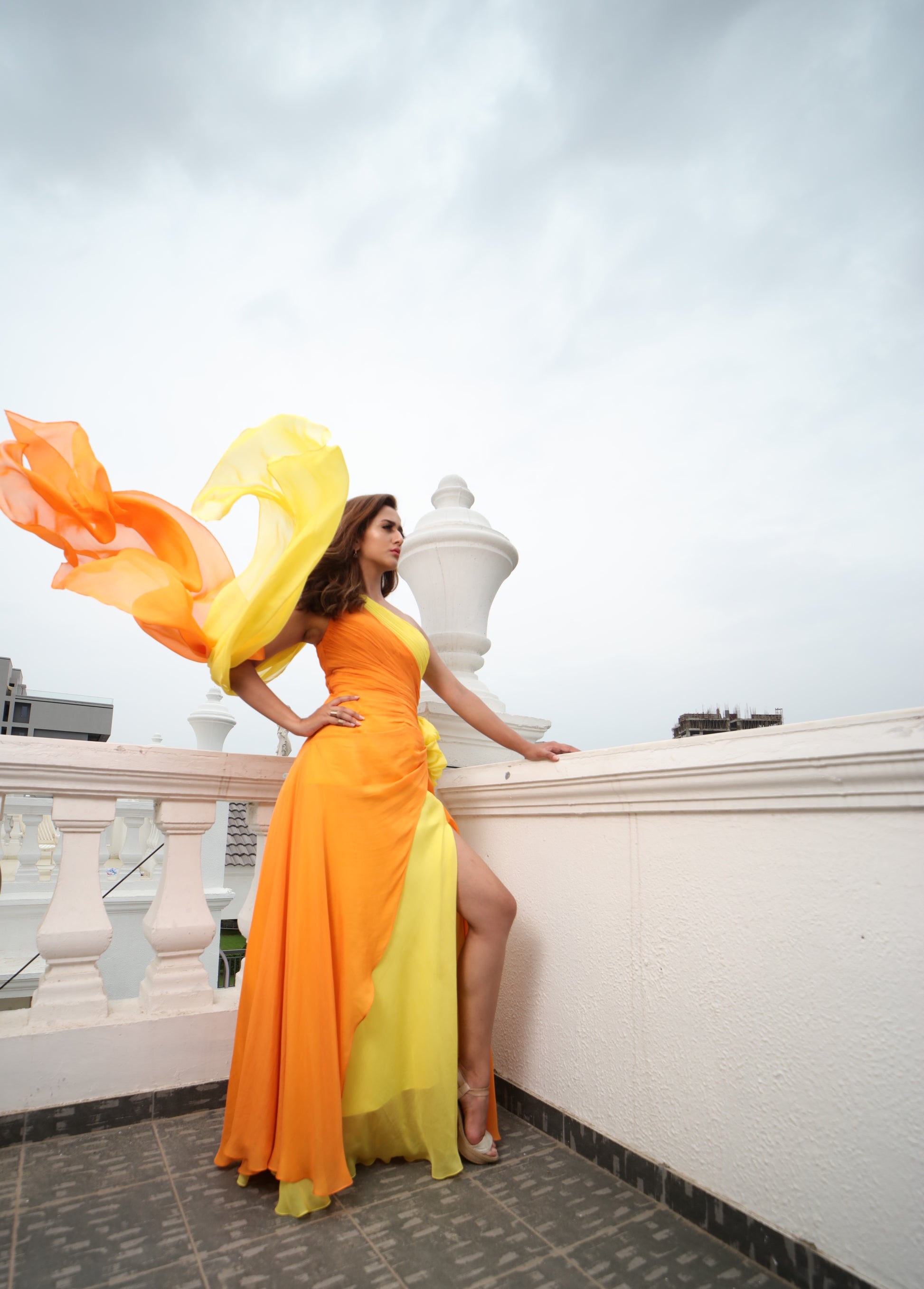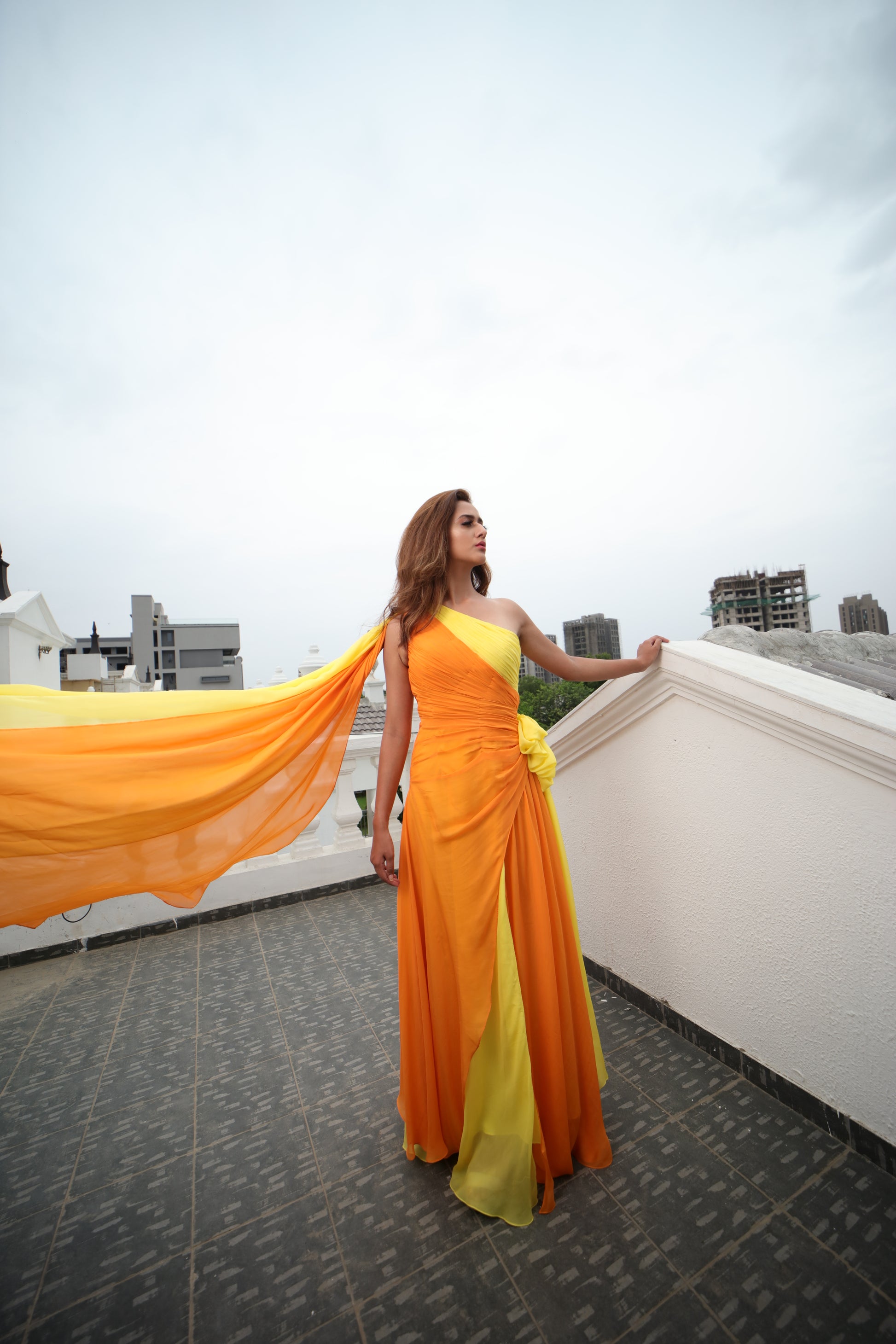 Make a statement with our fierce yellow and tangerine one shoulder draped gown. Crafted in luxurious flat chiffon with delicate trails at the back, this gown is perfect for destination weddings, summer vacations, or as a chic bridesmaid dress. Exude elegance and style with this stunning piece.