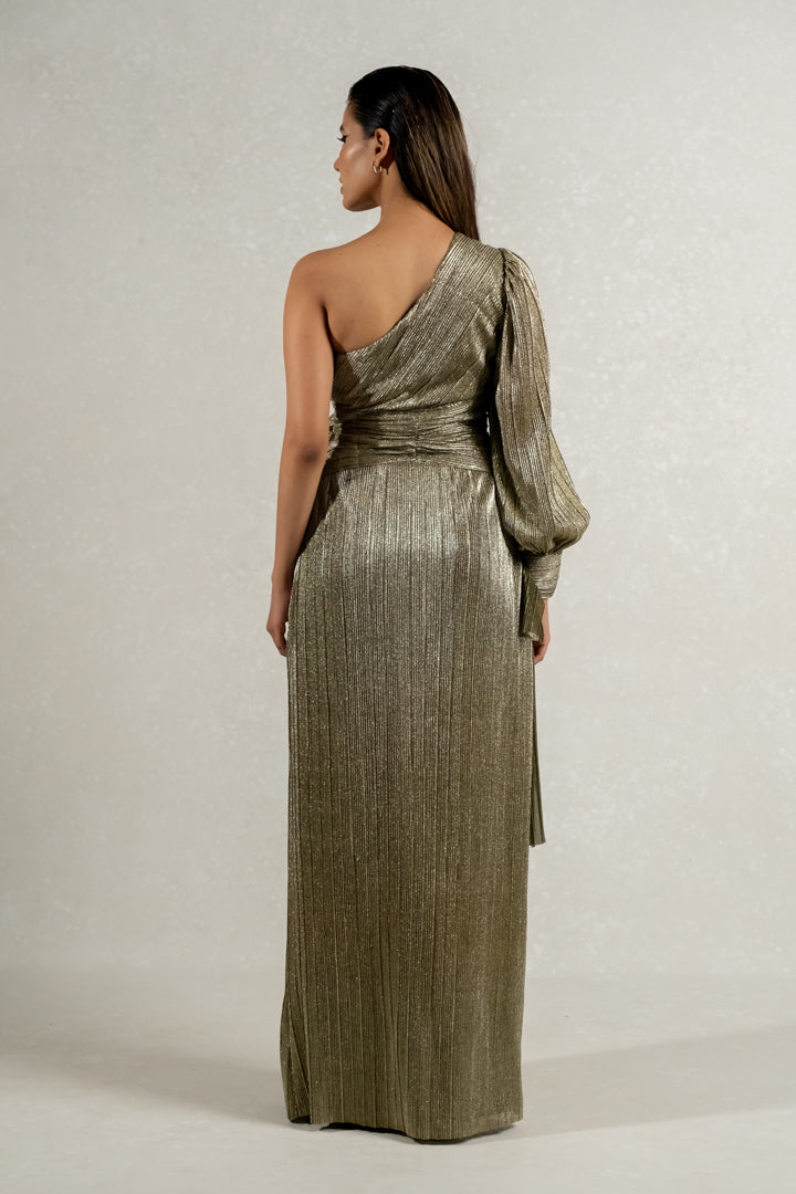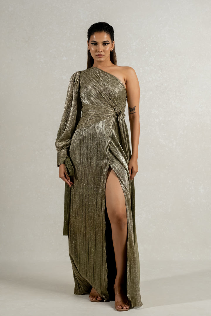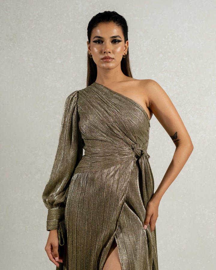 One sleeve gown in gold with wrapped skirt . It is a perfect attire for cocktails , destination weddings , red carpet etc.
