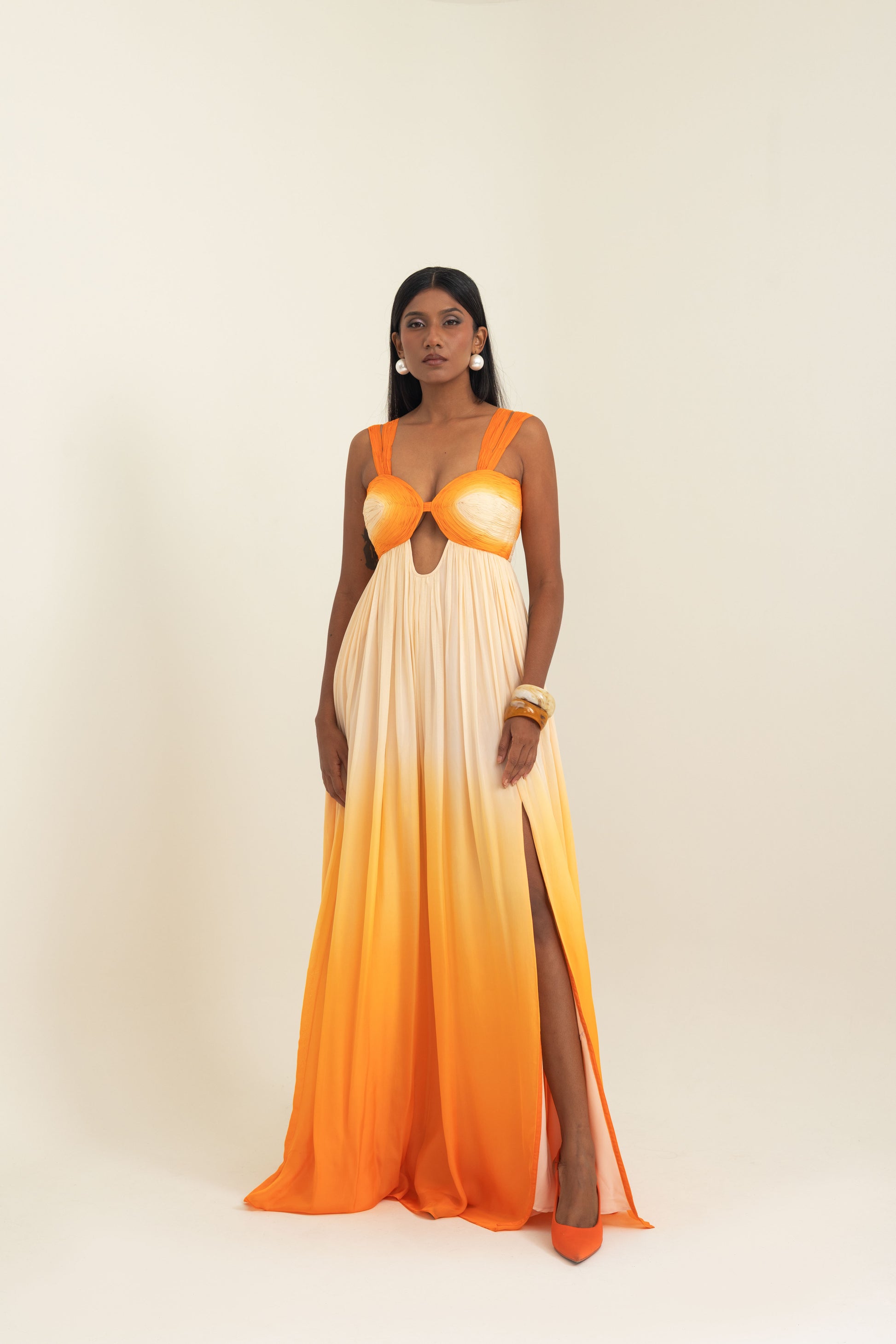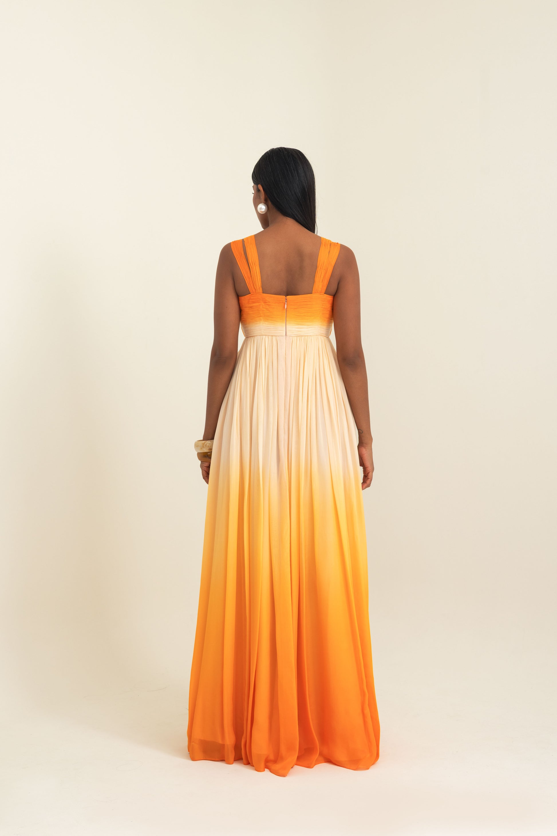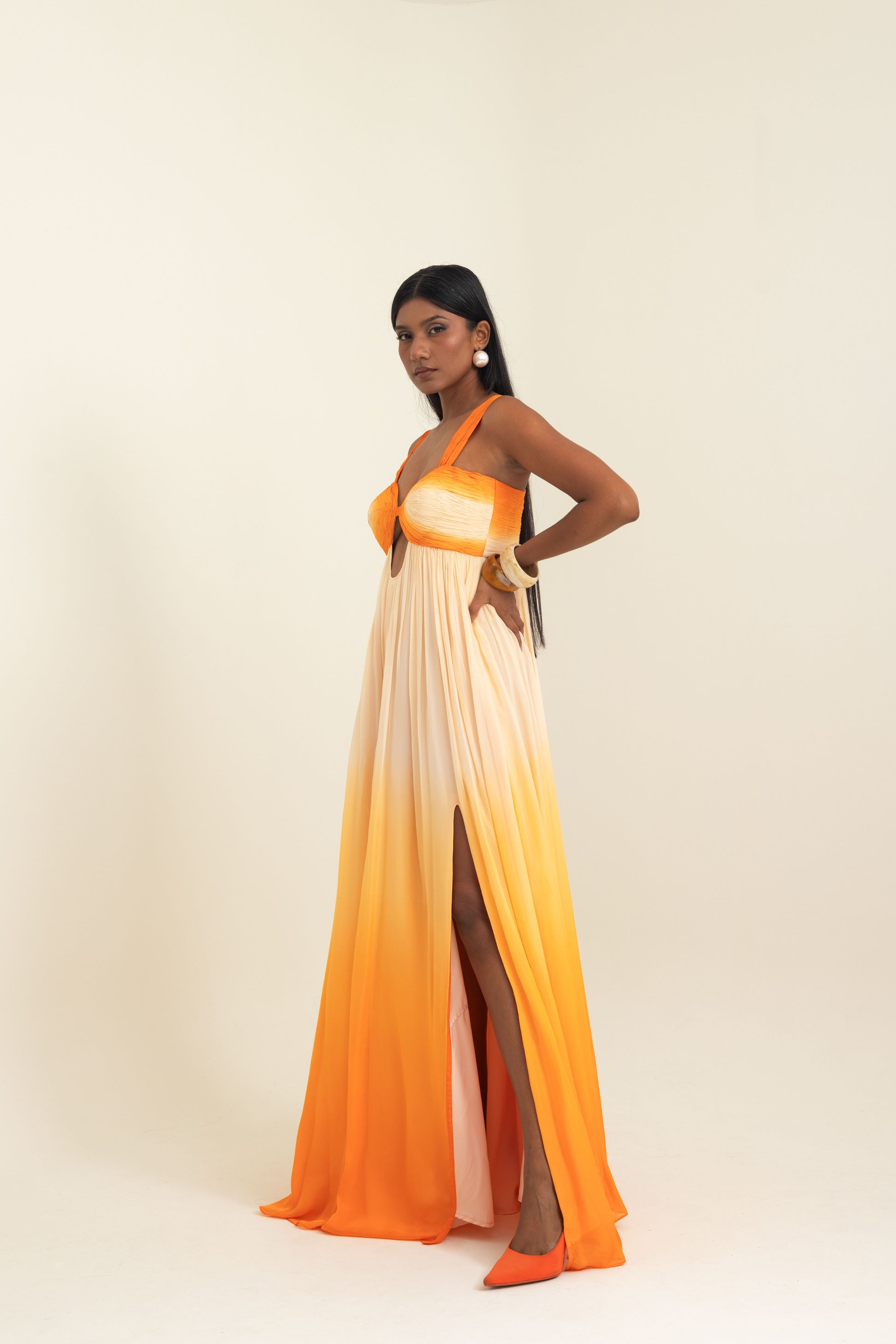 Shaded in ombré orange, this flat chiffon gown features a ruched sweetheart bodice with cut-out detail and a flowing A-line silhouette—effortlessly radiant.Perfect for soirées, destination weddings, or sunset dinners, this piece is equal parts dreamy and dramatic.