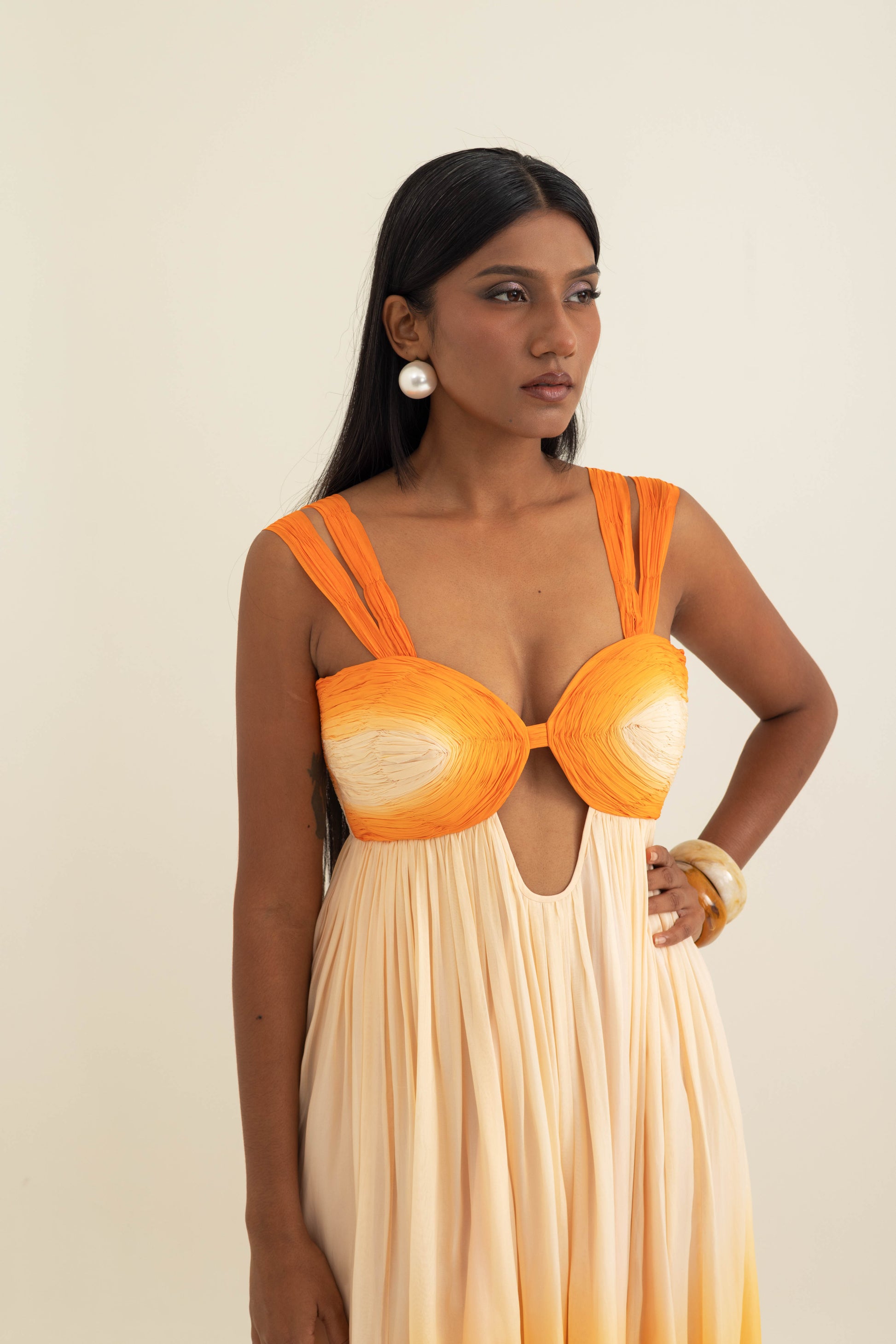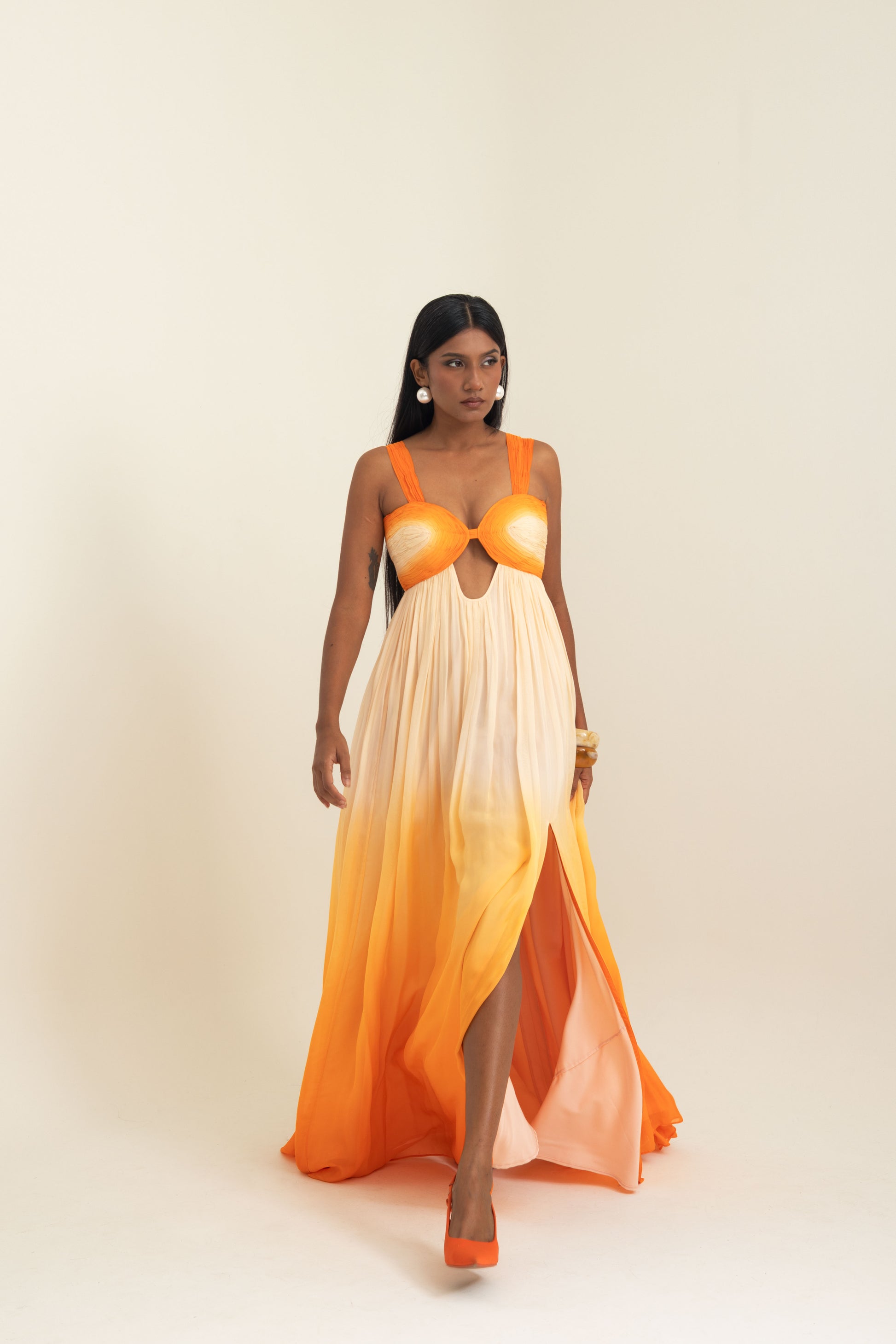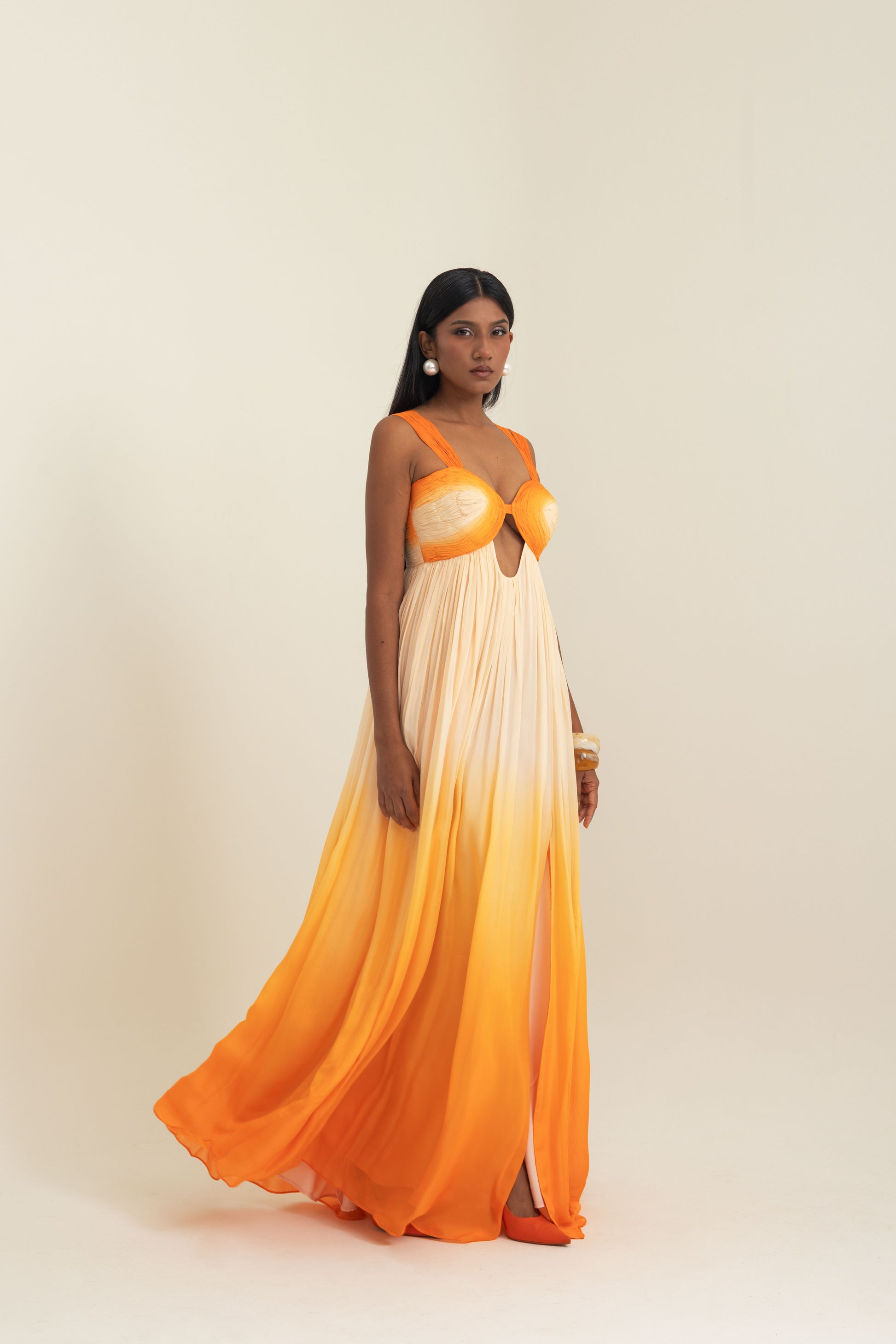 Shaded in ombré orange, this flat chiffon gown features a ruched sweetheart bodice with cut-out detail and a flowing A-line silhouette—effortlessly radiant.Perfect for soirées, destination weddings, or sunset dinners, this piece is equal parts dreamy and dramatic.