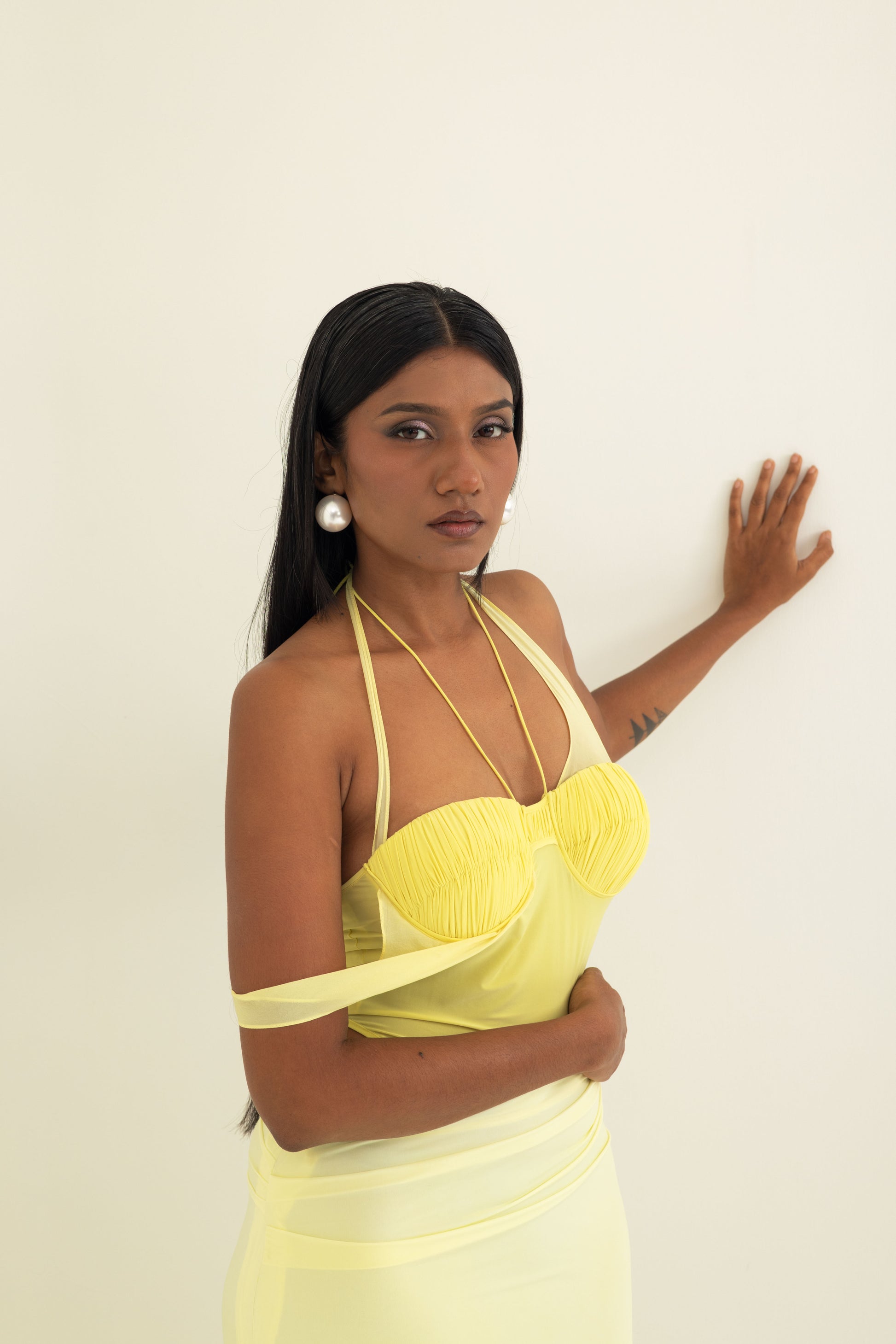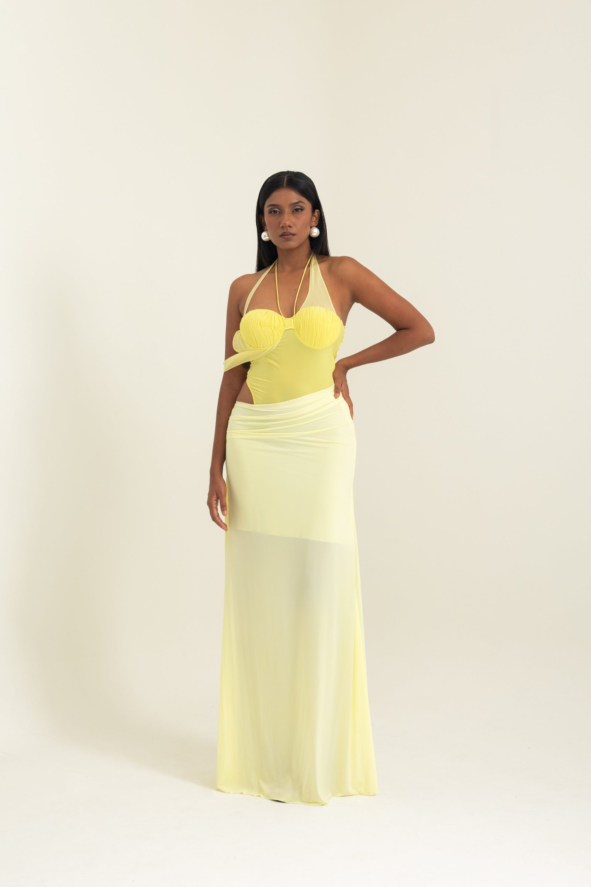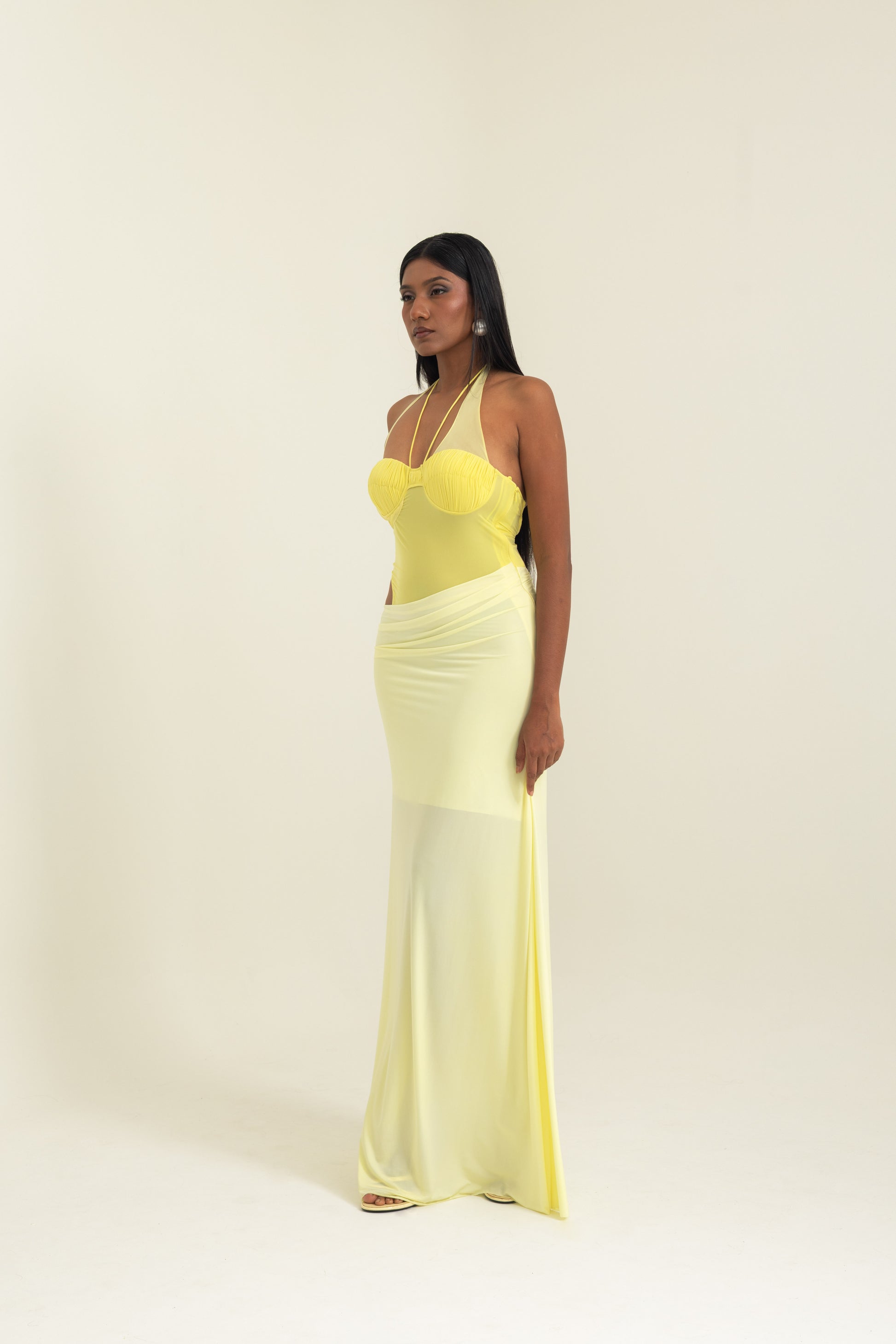 Bask in sunshine elegance with this butter-yellow gown crafted in soft malai lycra. The design features a sensuous halter neckline with delicate hand-ruching on the bodice, paired with a figure-skimming silhouette that flows effortlessly to the floor. Side cut-outs add a touch of allure, while the back is finished with a statement tie-up detail adorned with lily-inspired tassels. Romantic yet modern, this piece is perfect for making a glamorous statement at summer soirées and resort evenings.