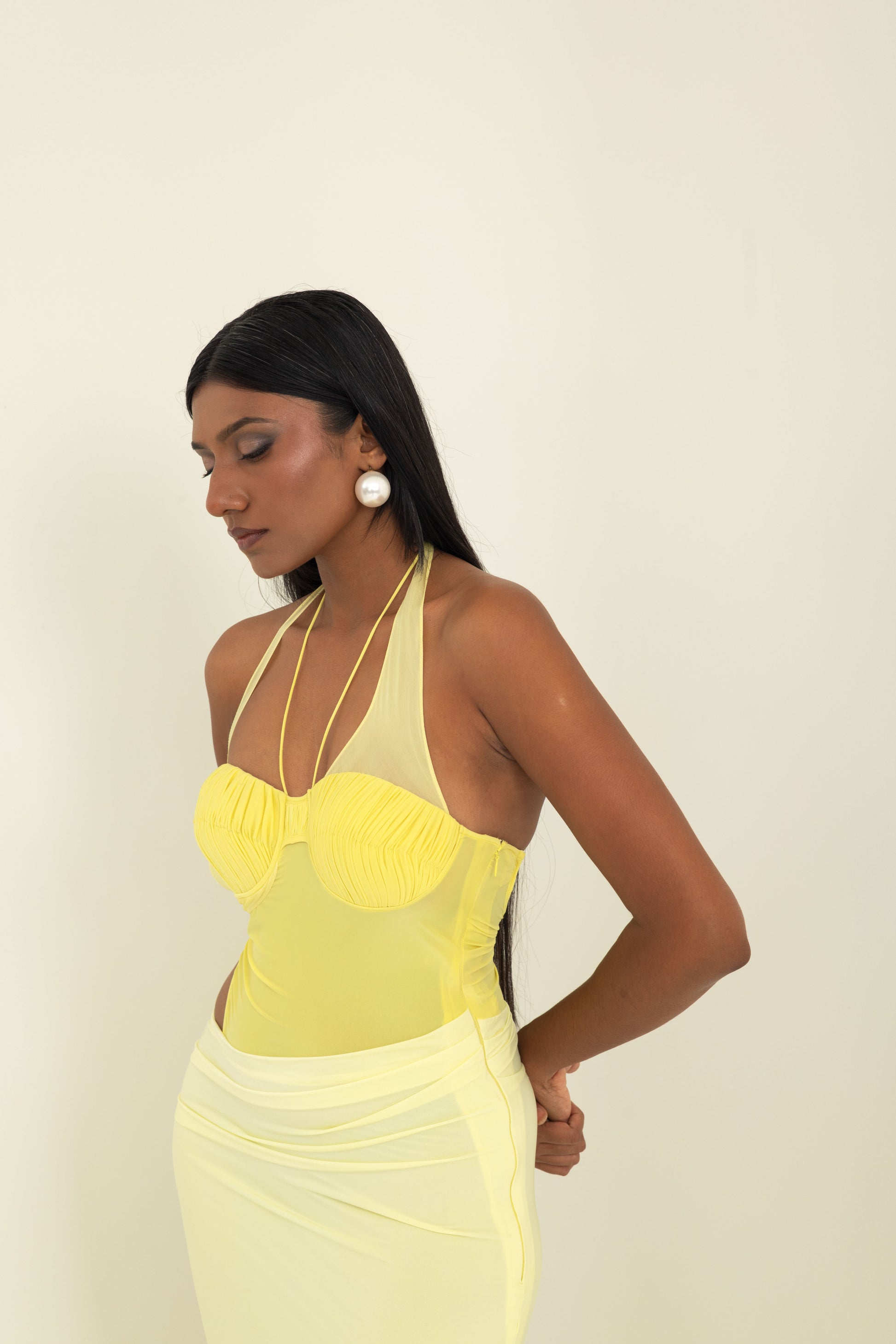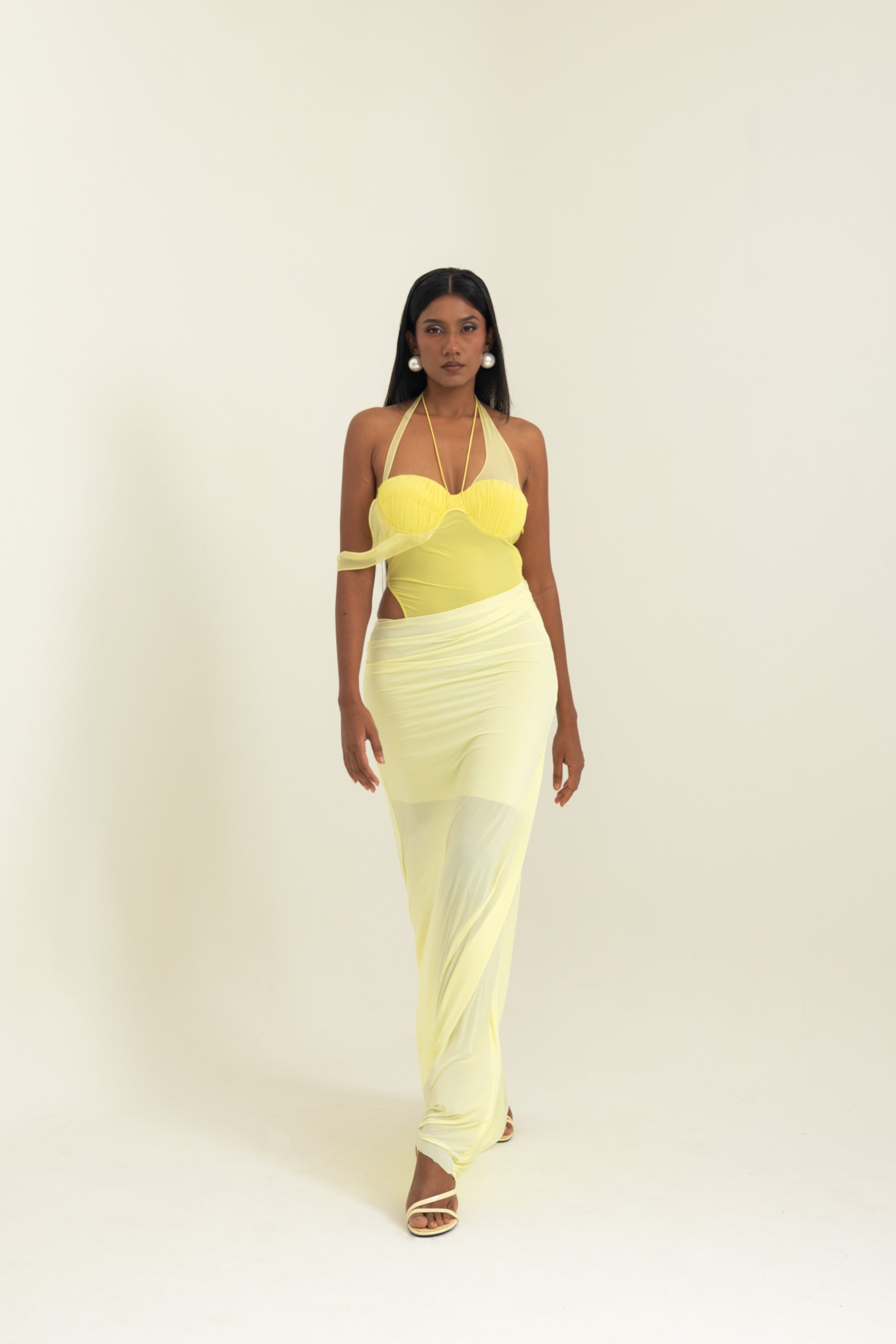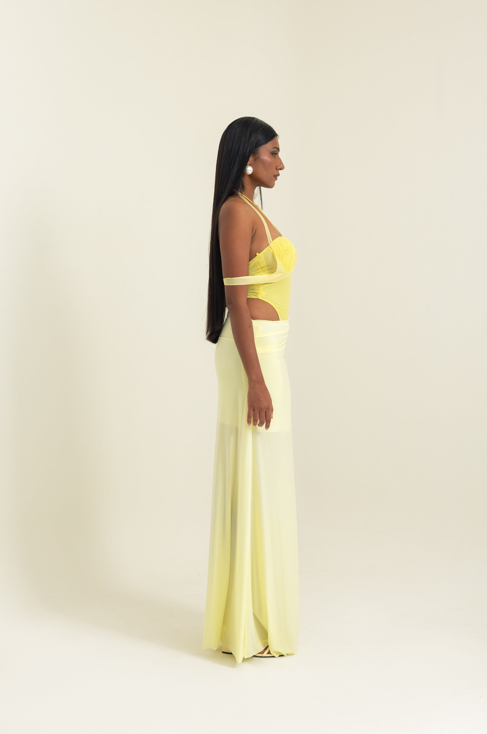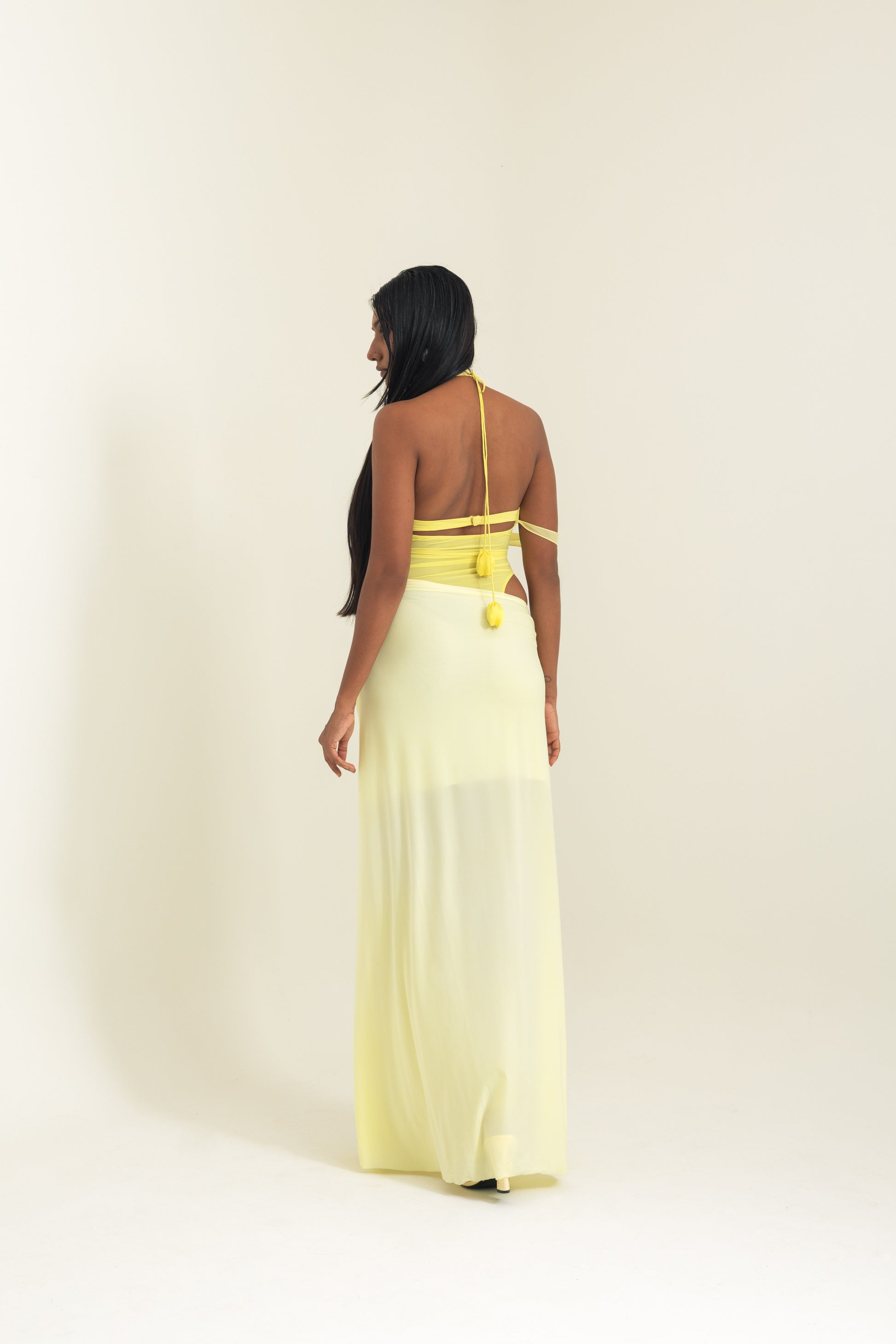 Bask in sunshine elegance with this butter-yellow gown crafted in soft malai lycra. The design features a sensuous halter neckline with delicate hand-ruching on the bodice, paired with a figure-skimming silhouette that flows effortlessly to the floor. Side cut-outs add a touch of allure, while the back is finished with a statement tie-up detail adorned with lily-inspired tassels. Romantic yet modern, this piece is perfect for making a glamorous statement at summer soirées and resort evenings.