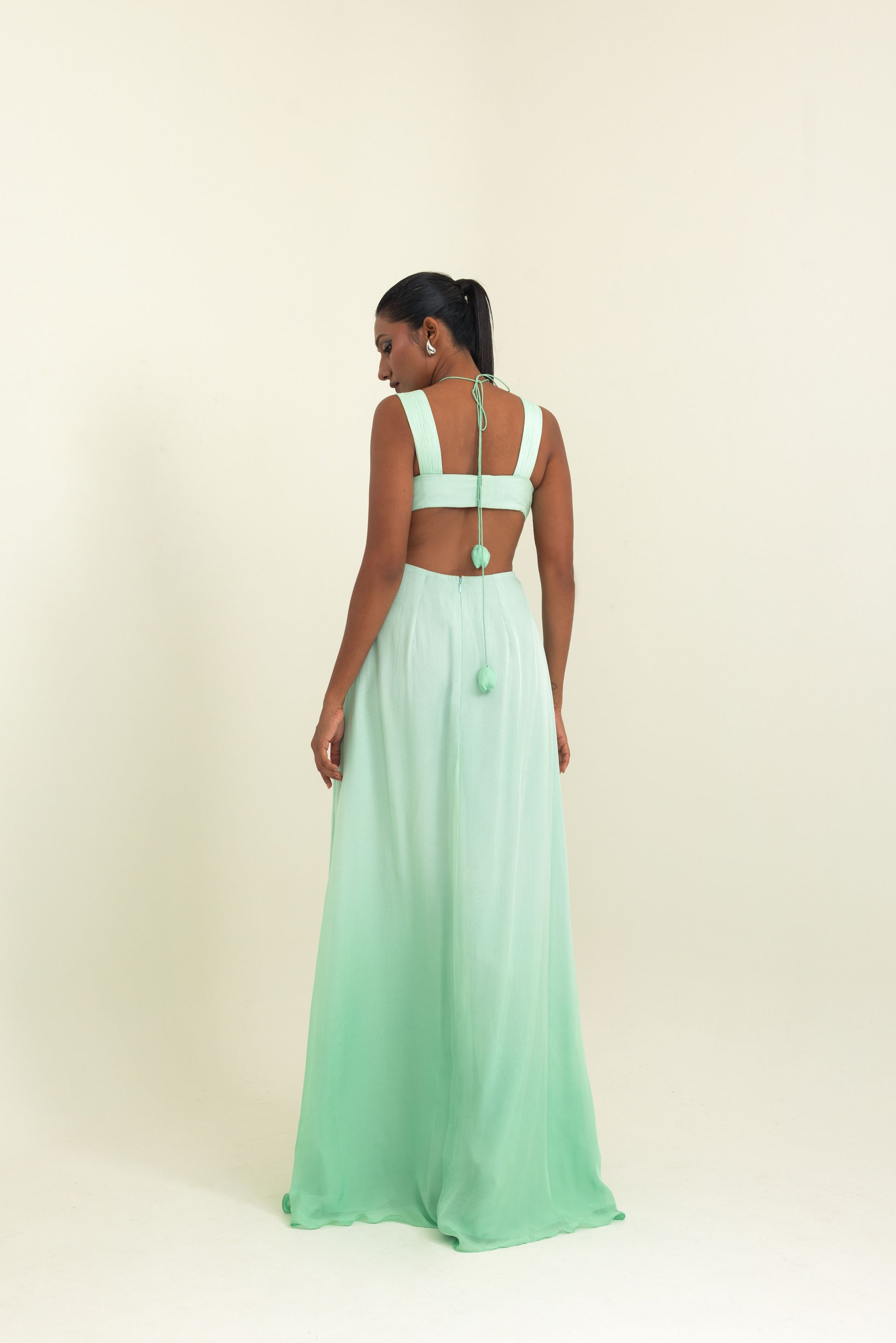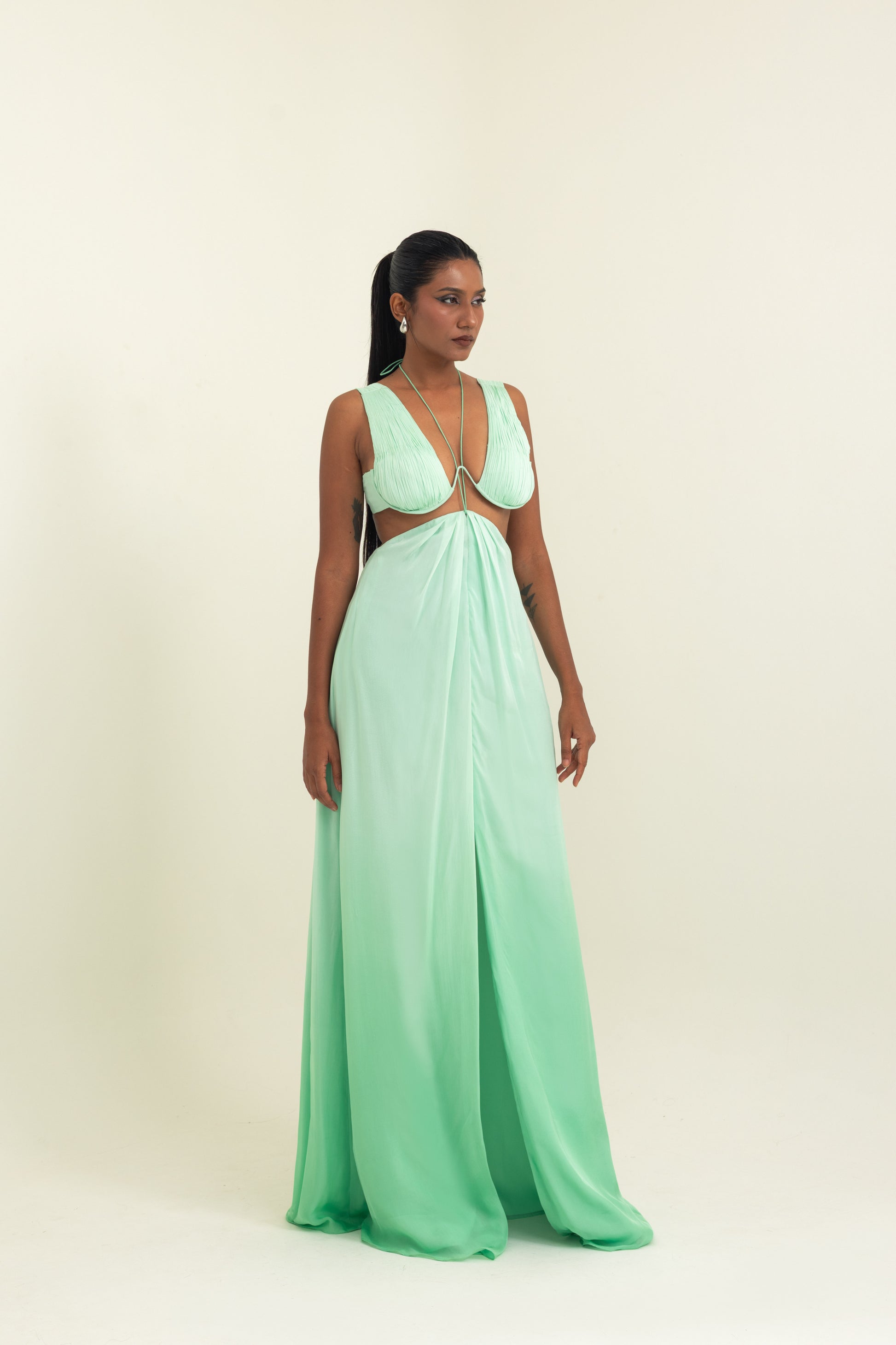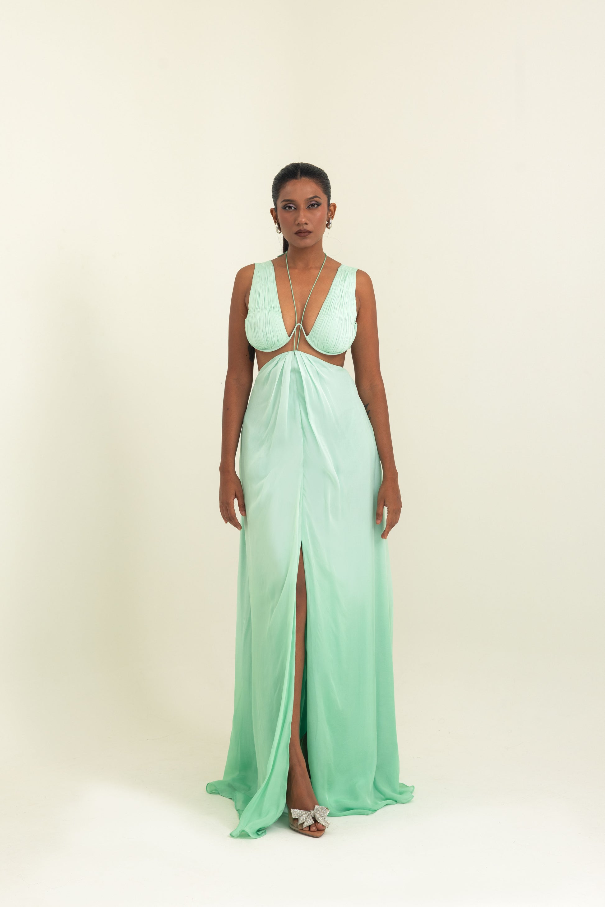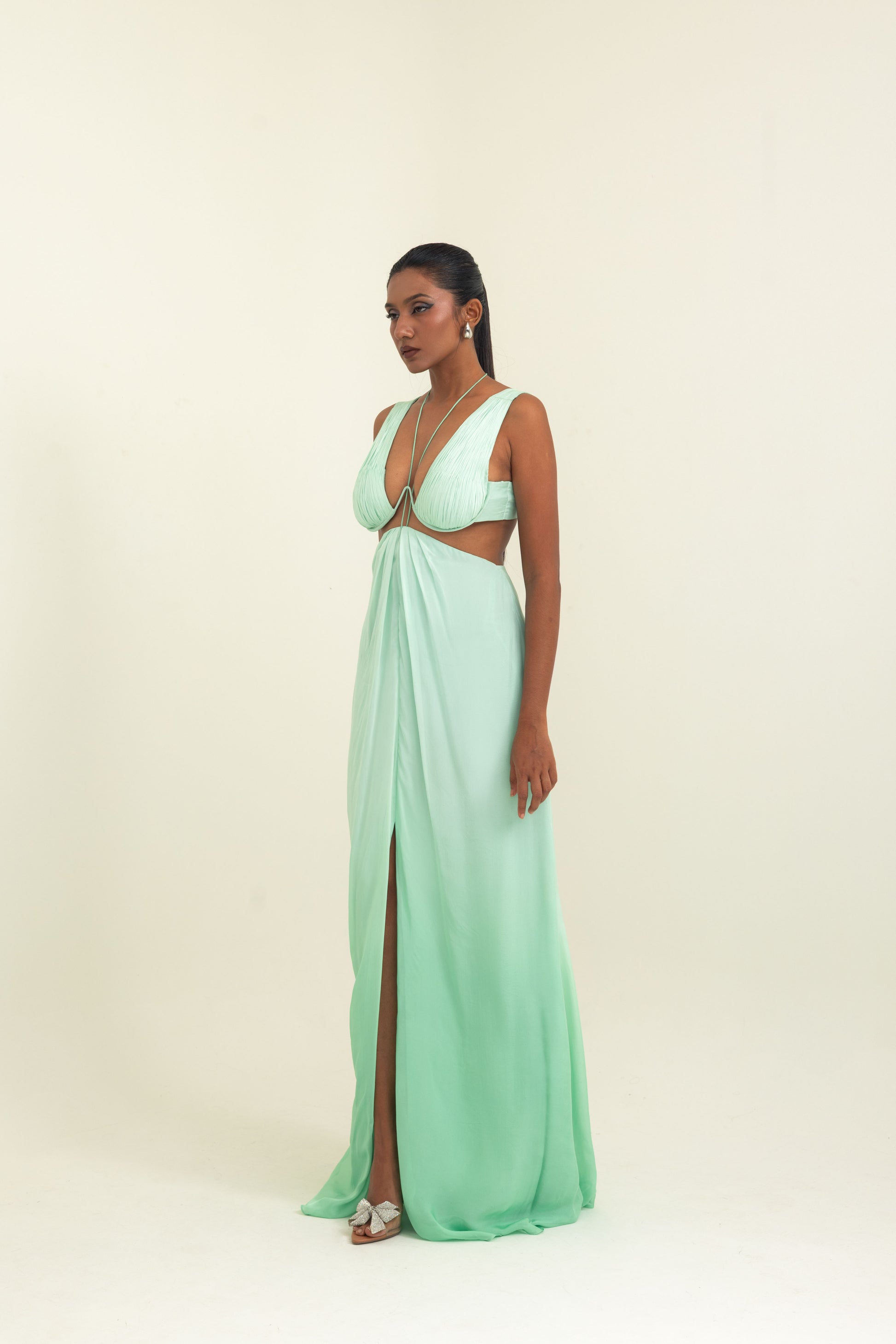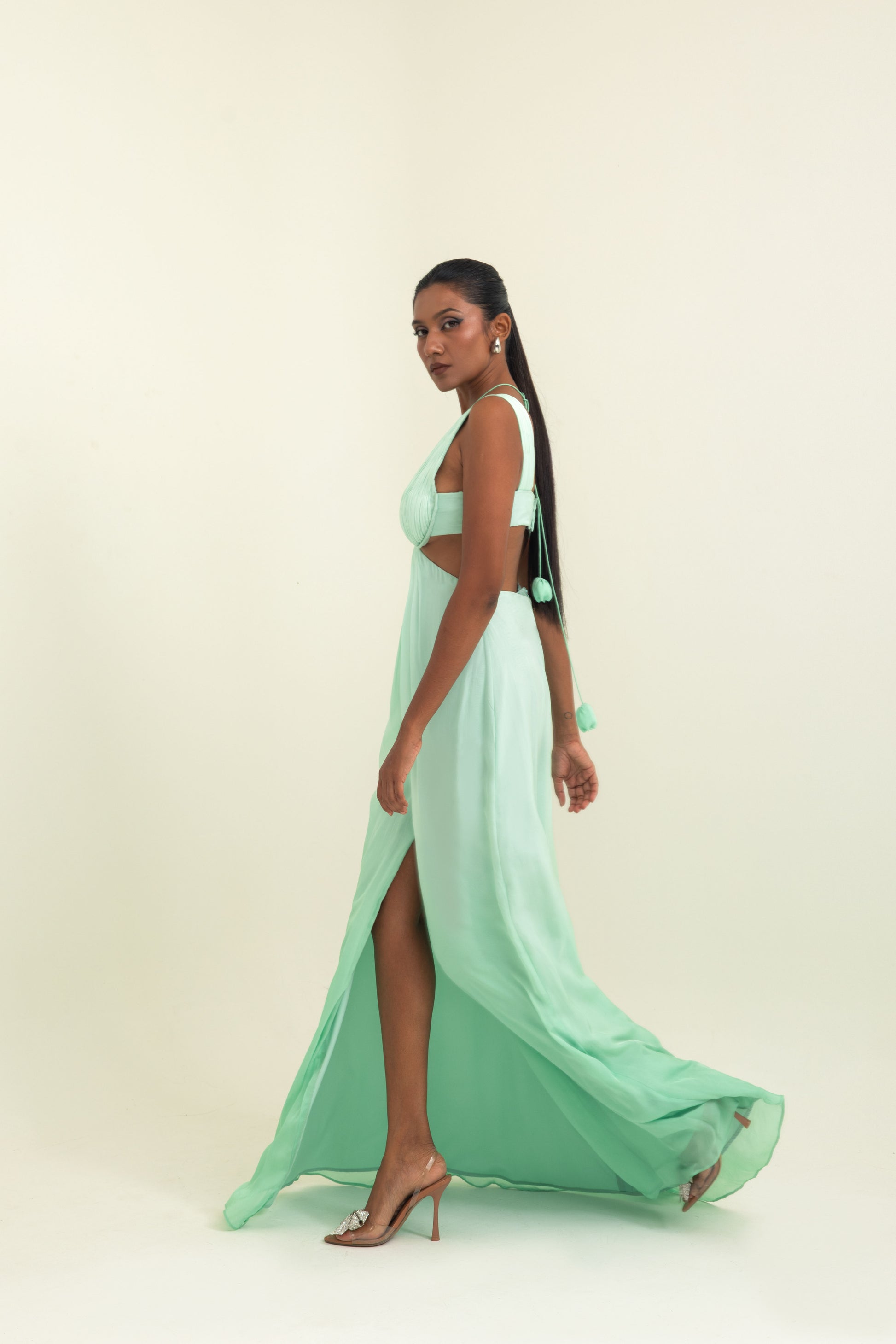A vision of soft romance, this gown comes alive in shaded mint green tones crafted in airy flat chiffon. The bodice features a plunging neckline with delicate hand-ruching, framed by sensuous side cut-outs that lead into a fluid draped silhouette. A front slit lends movement and allure, while the back is finished with a tie-up detail adorned with lily tassels, offering a whimsical touch. Effortlessly elegant, this piece embodies modern femininity with a dreamy summer glow.