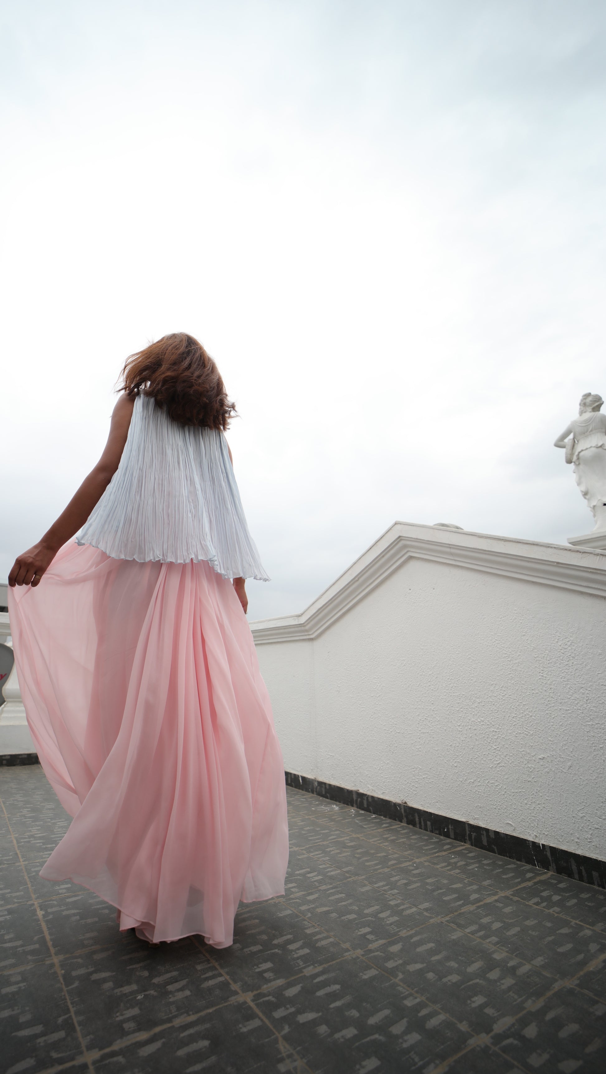 Indulge in elegance with our twin shade georgette gown. The hand-pleated, short-front and long-back cape adds a unique touch to this subtle yet stunning piece. Perfect for bridesmaids or exotic holidays, this gown exudes sophistication and luxury.