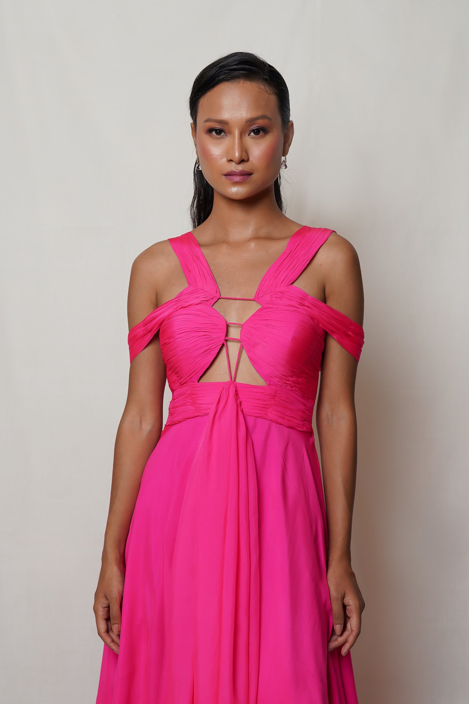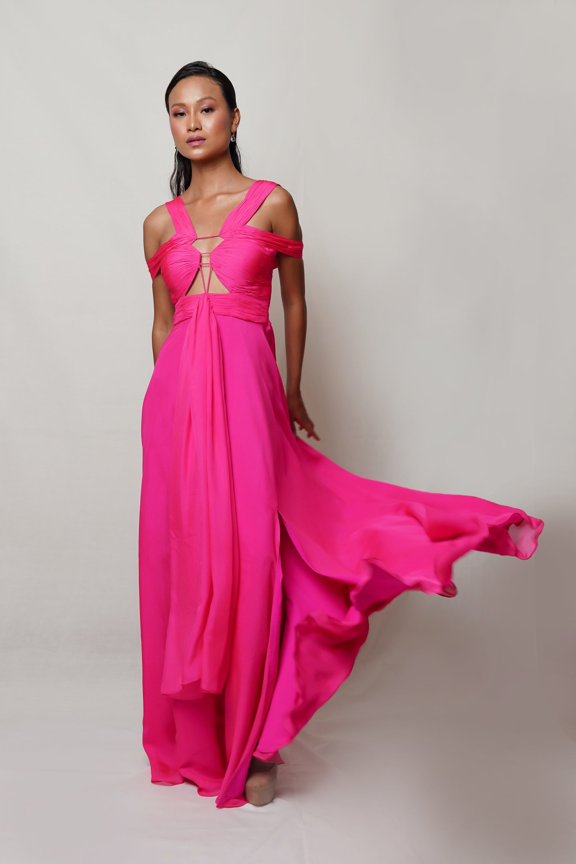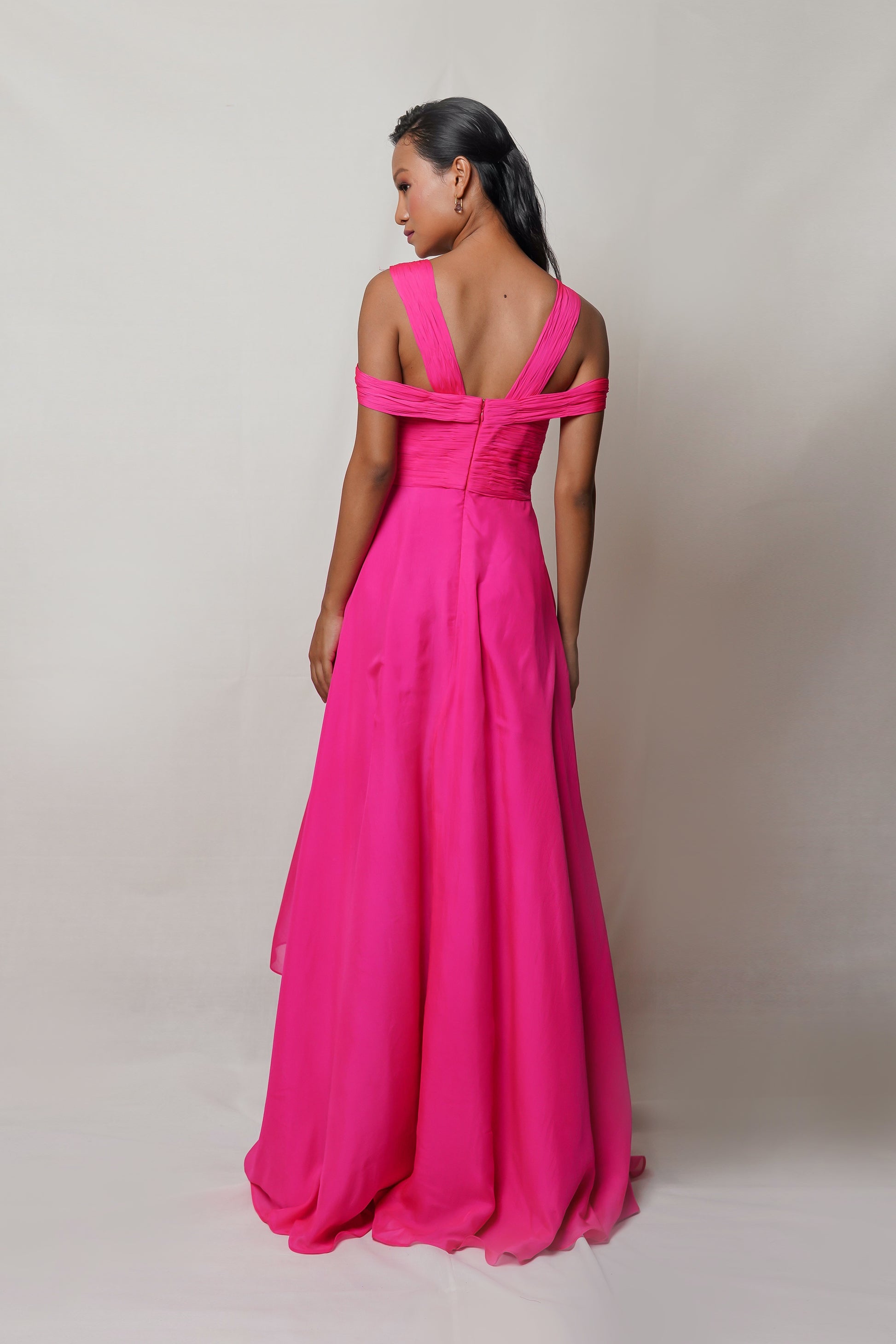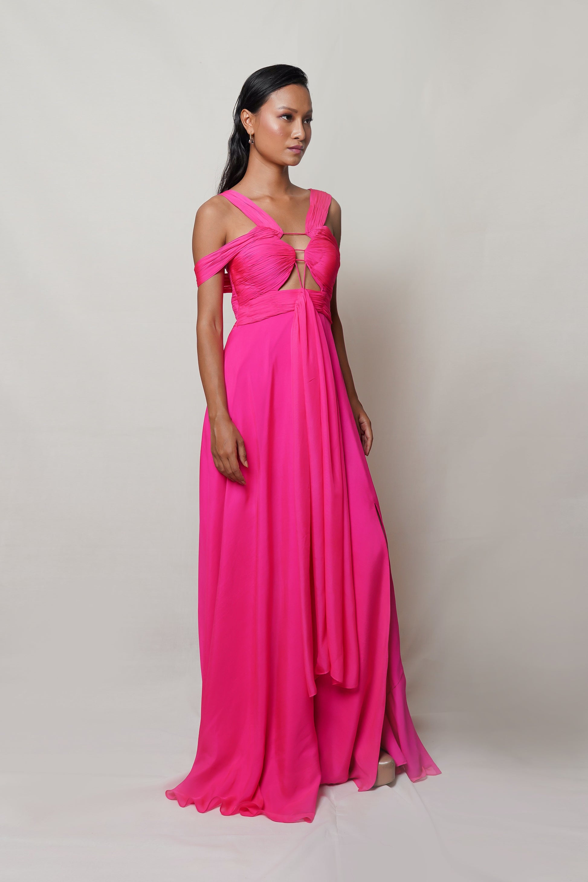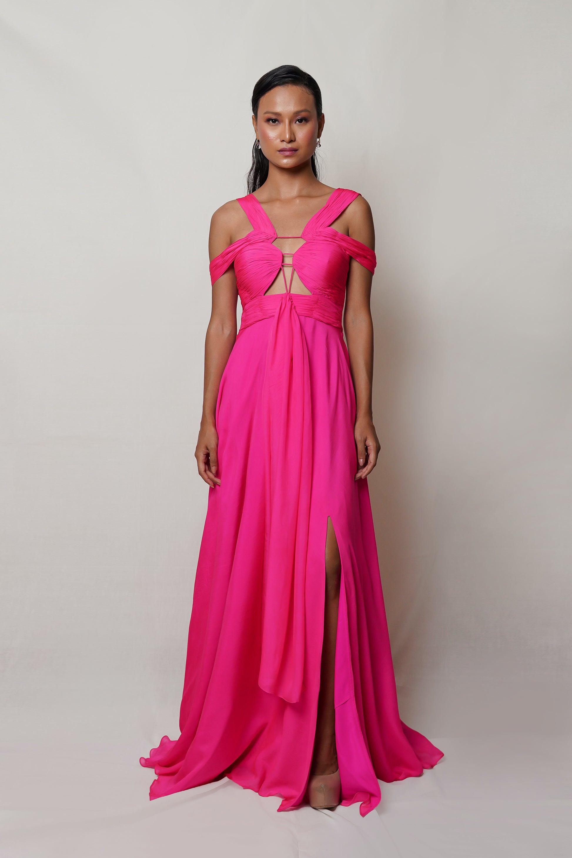 Indulge in luxury with PETALITE. This hot pink gown boasts a meticulously draped front with hand pleating on the bodice, while the skirt boasts a front gather and slit. Revel in the sophistication and exclusivity of this elegant and tasteful piece. Perfect for a night of art, literature, or fashion.