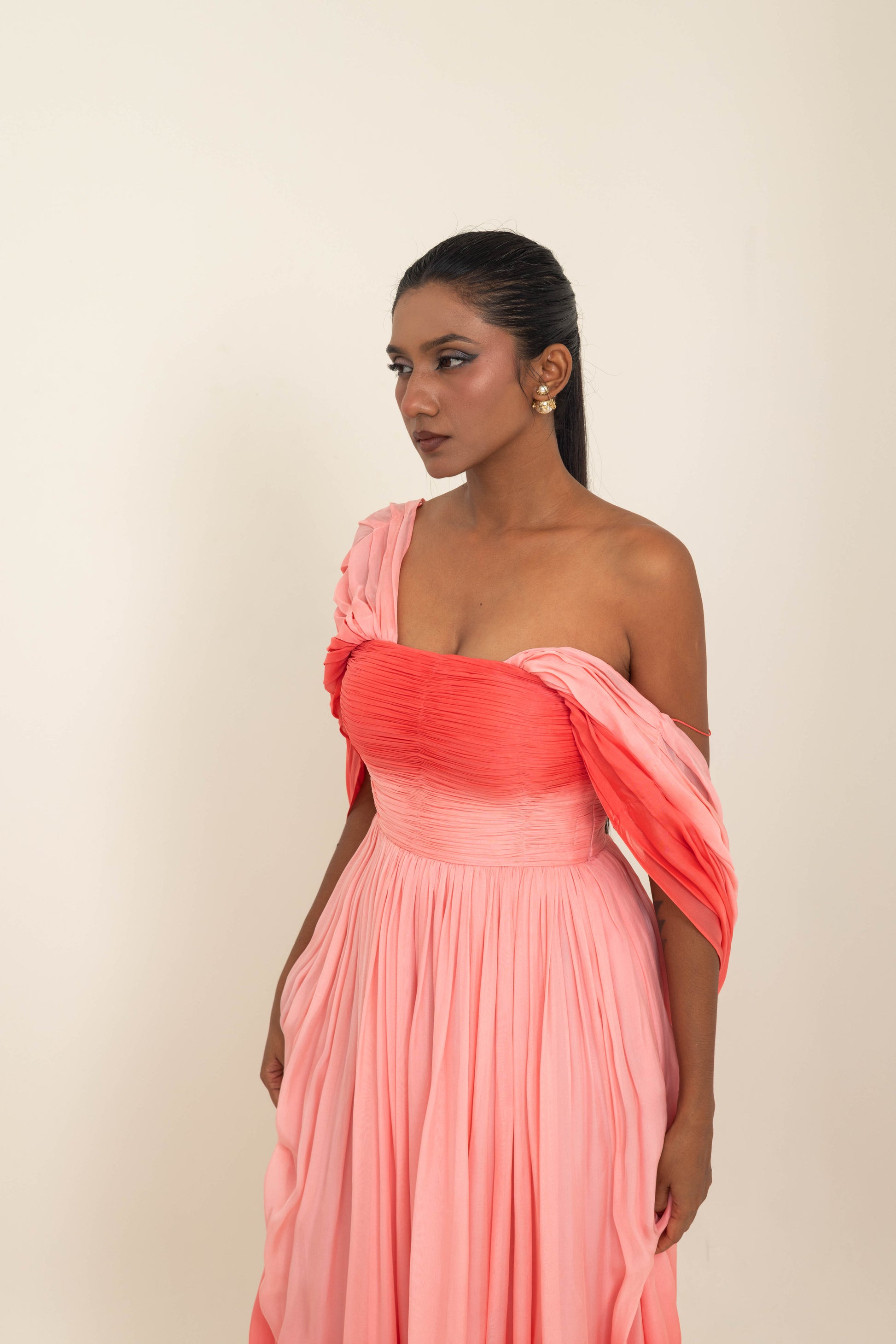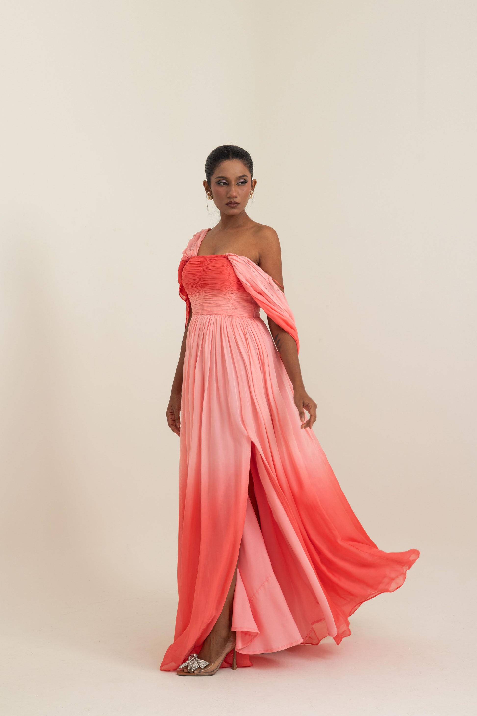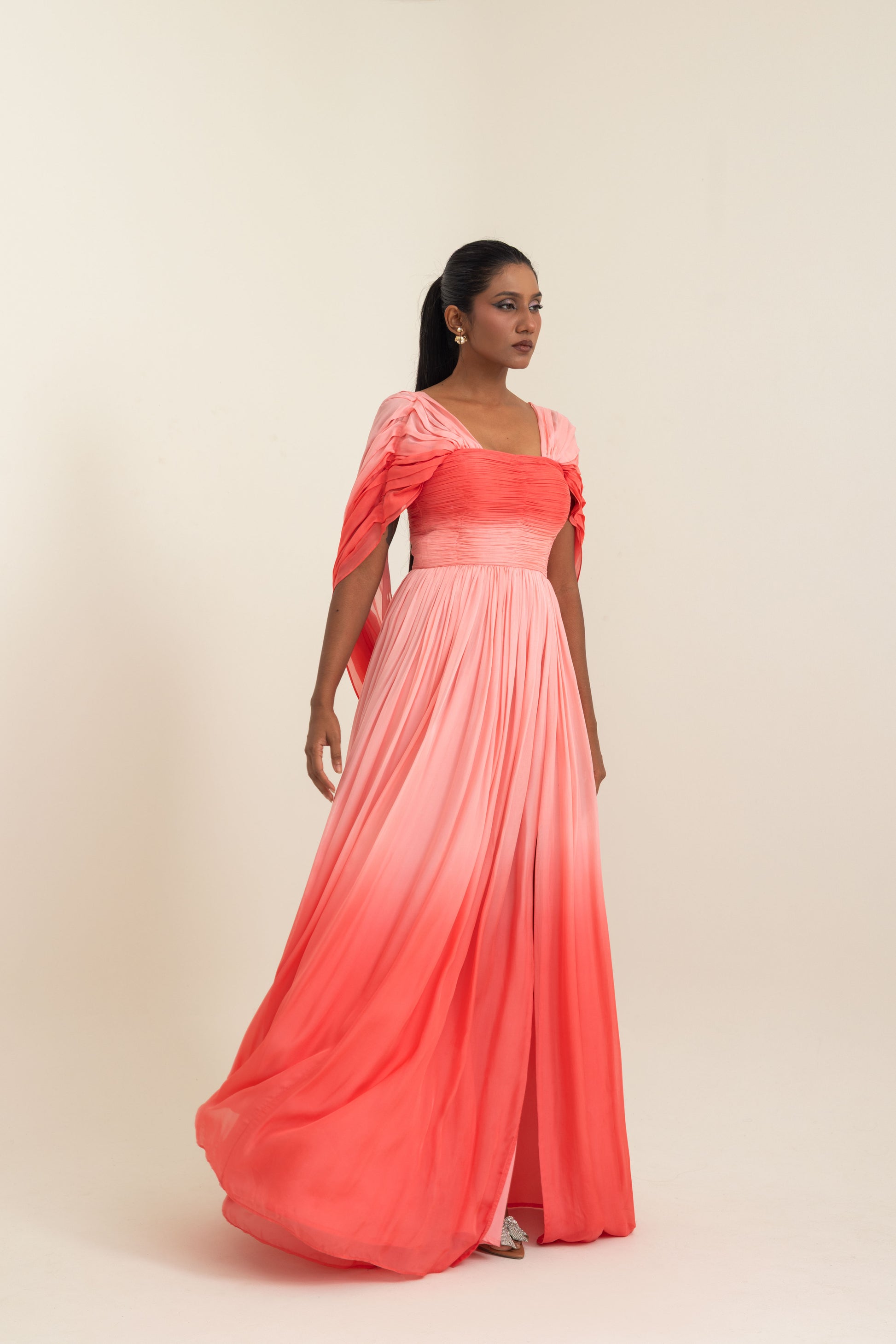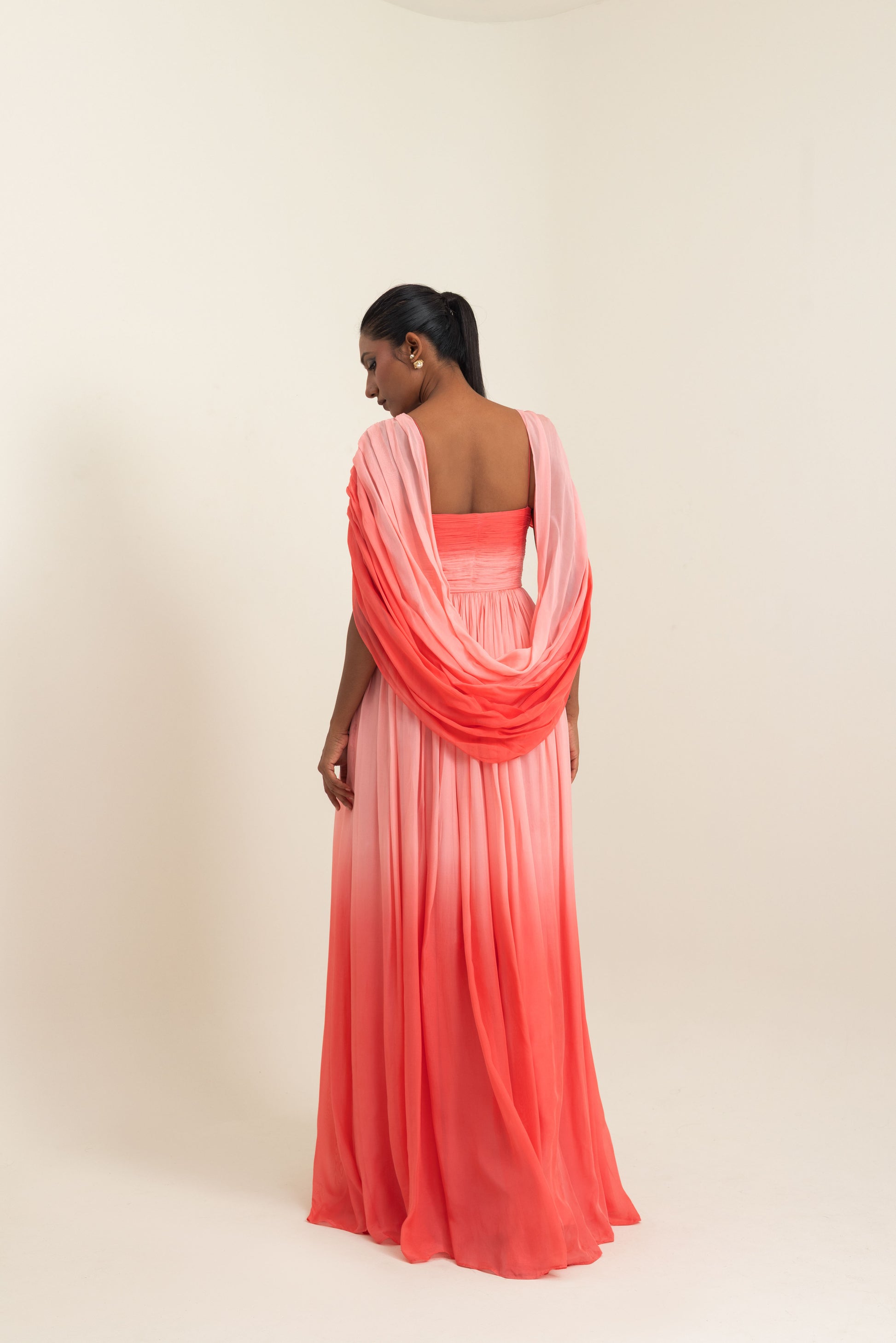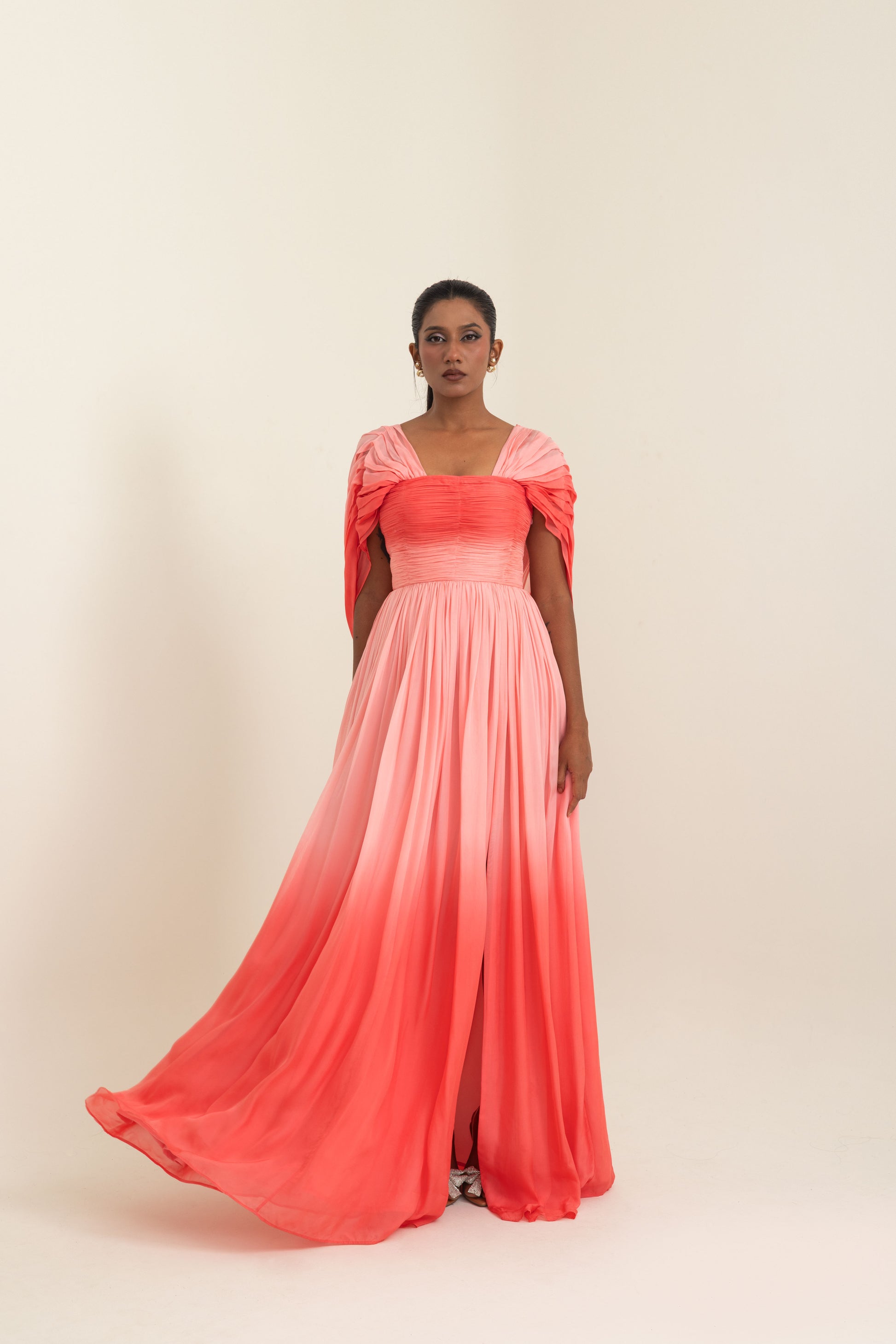 A vision of modern romance, this shaded coral gown is crafted in delicate flat chiffon that flows with an ethereal lightness. The square neckline frames the décolleté with elegance, while soft hand-ruching across the bodice sculpts a flattering silhouette. Draped panels cascade from the shoulders into a graceful cowl back, adding depth and drama to the design. The gradient coral tones transition seamlessly, evoking the hues of a sunset sky. Perfect for soirées, receptions, or destination celebrations, this gown embodies effortless sophistication with a touch of grandeur.