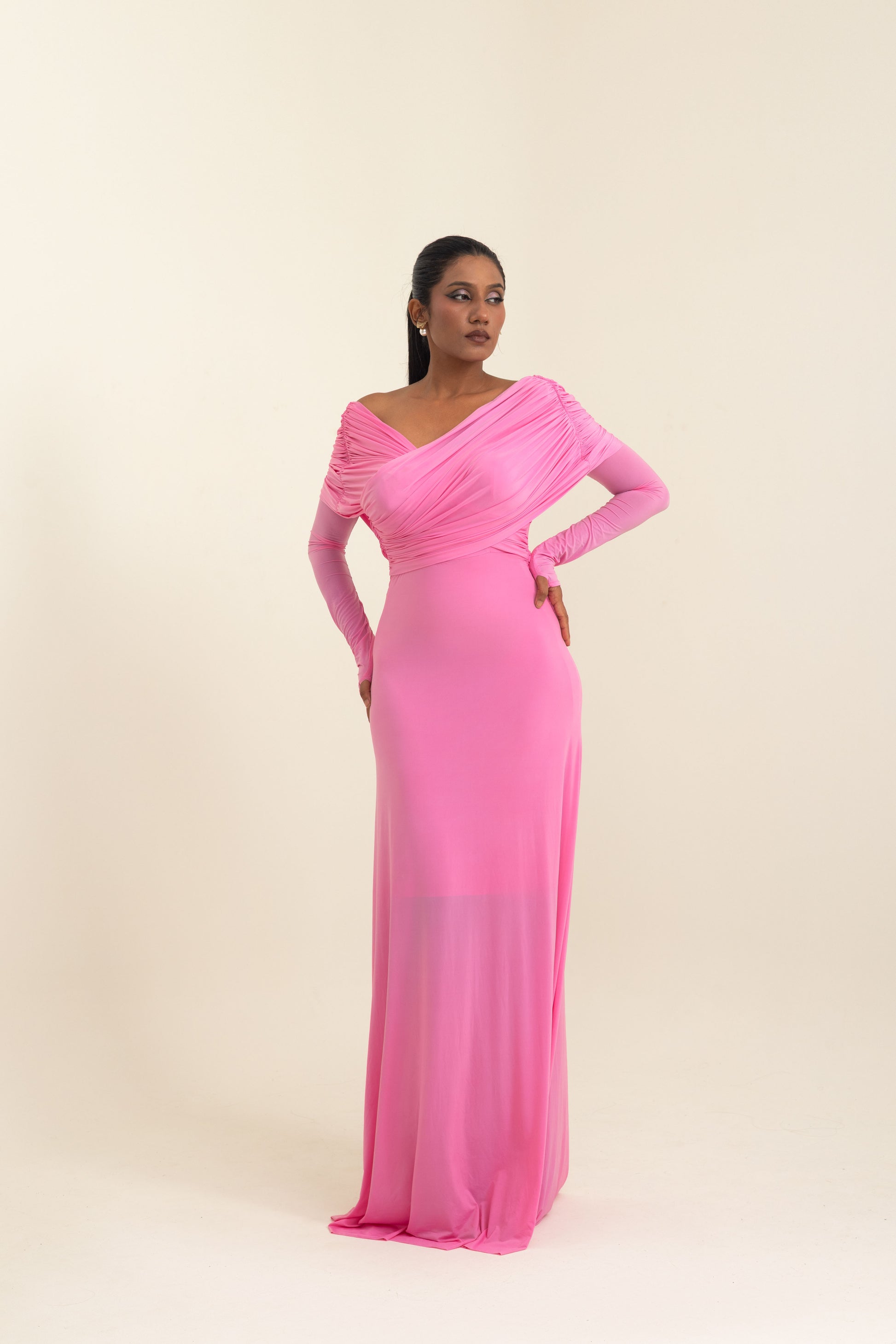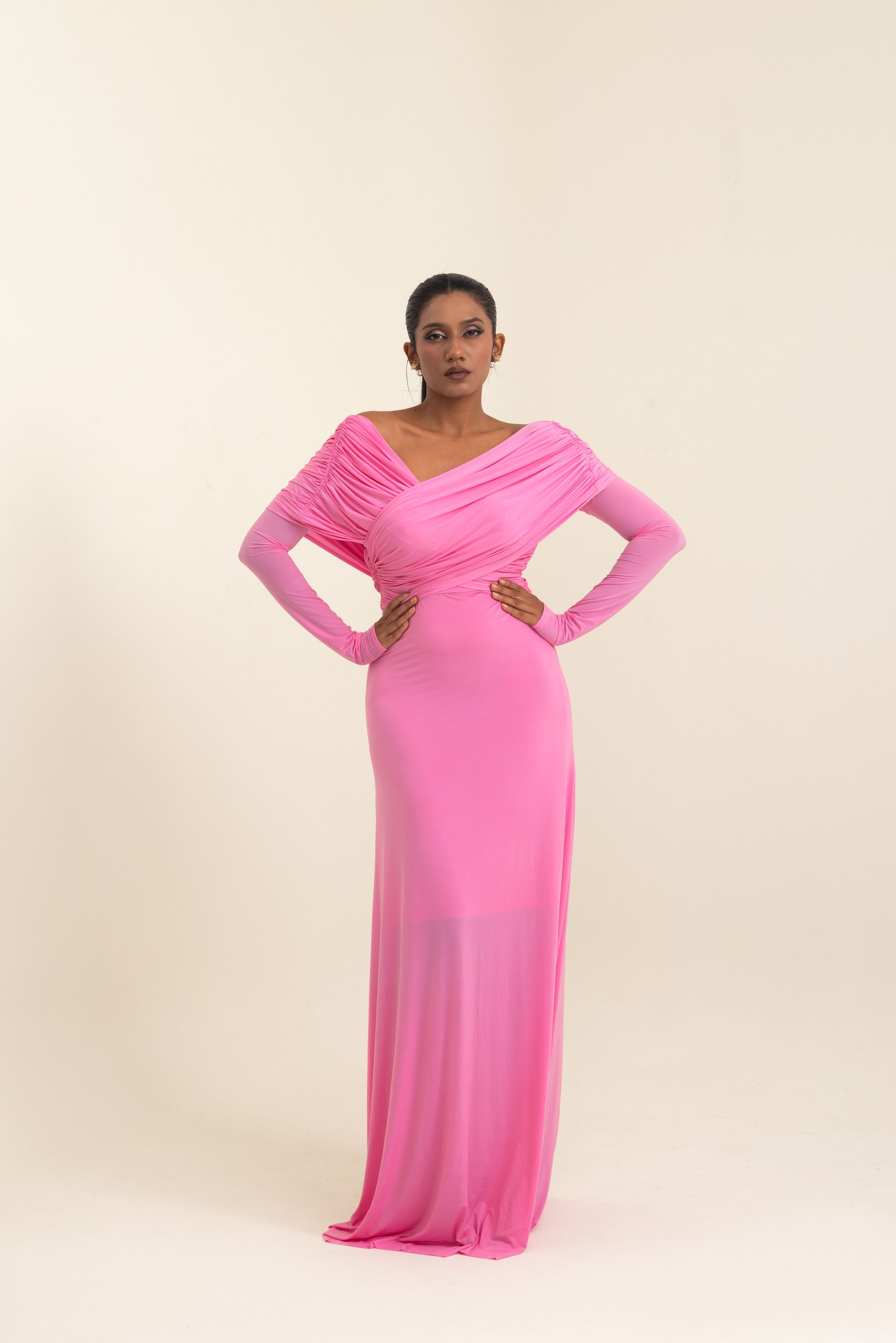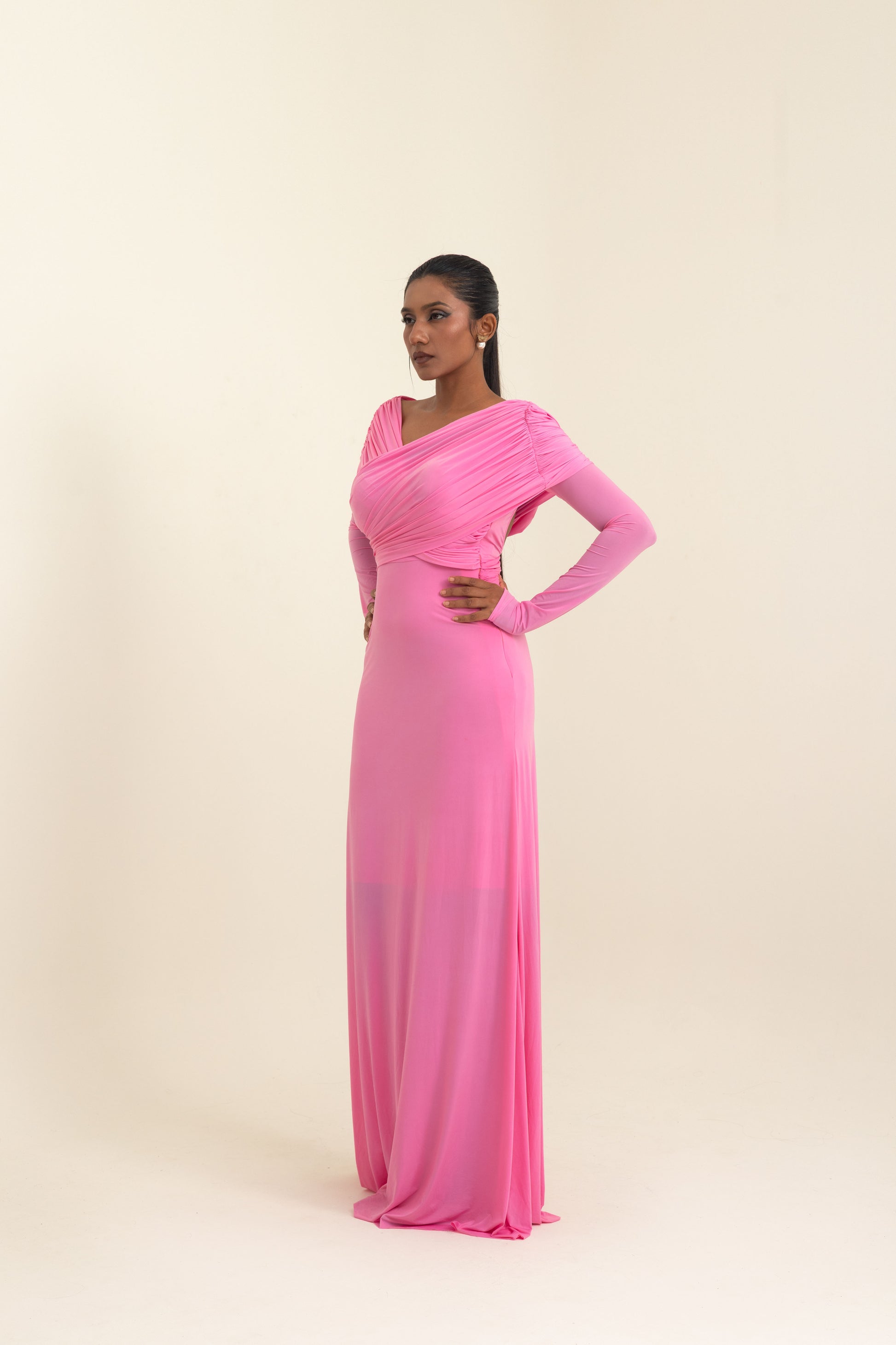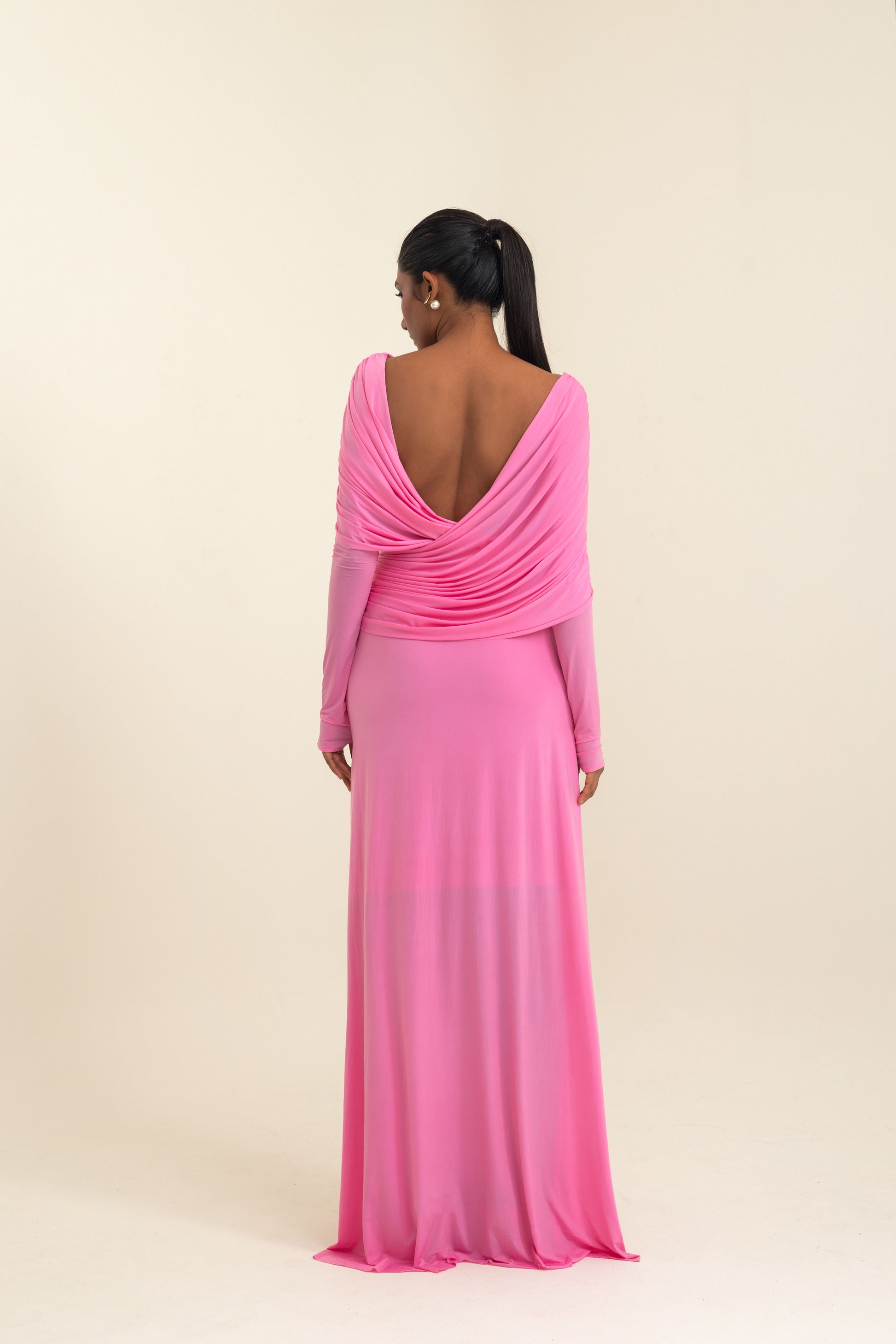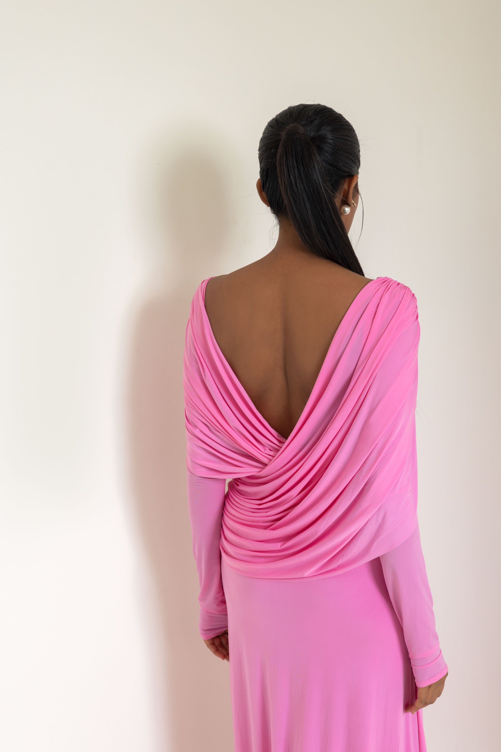 Sculpted in fluid lycra, this solid pink gown is an ode to modern glamour. The bodice is defined by intricate draping that frames the neckline and flows seamlessly into a body-contouring silhouette. The long fitted sleeves add a touch of poise, while the dramatic draped open back infuses the look with sensuality and allure.