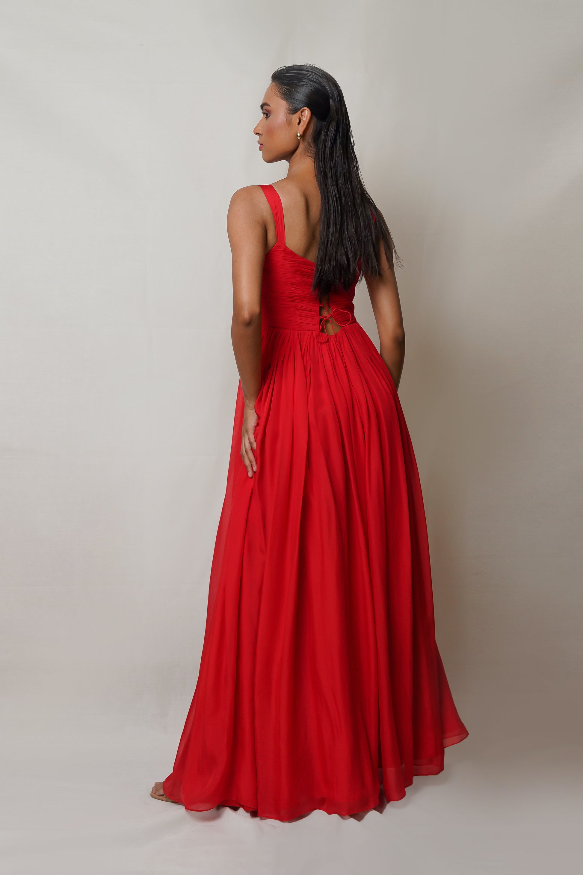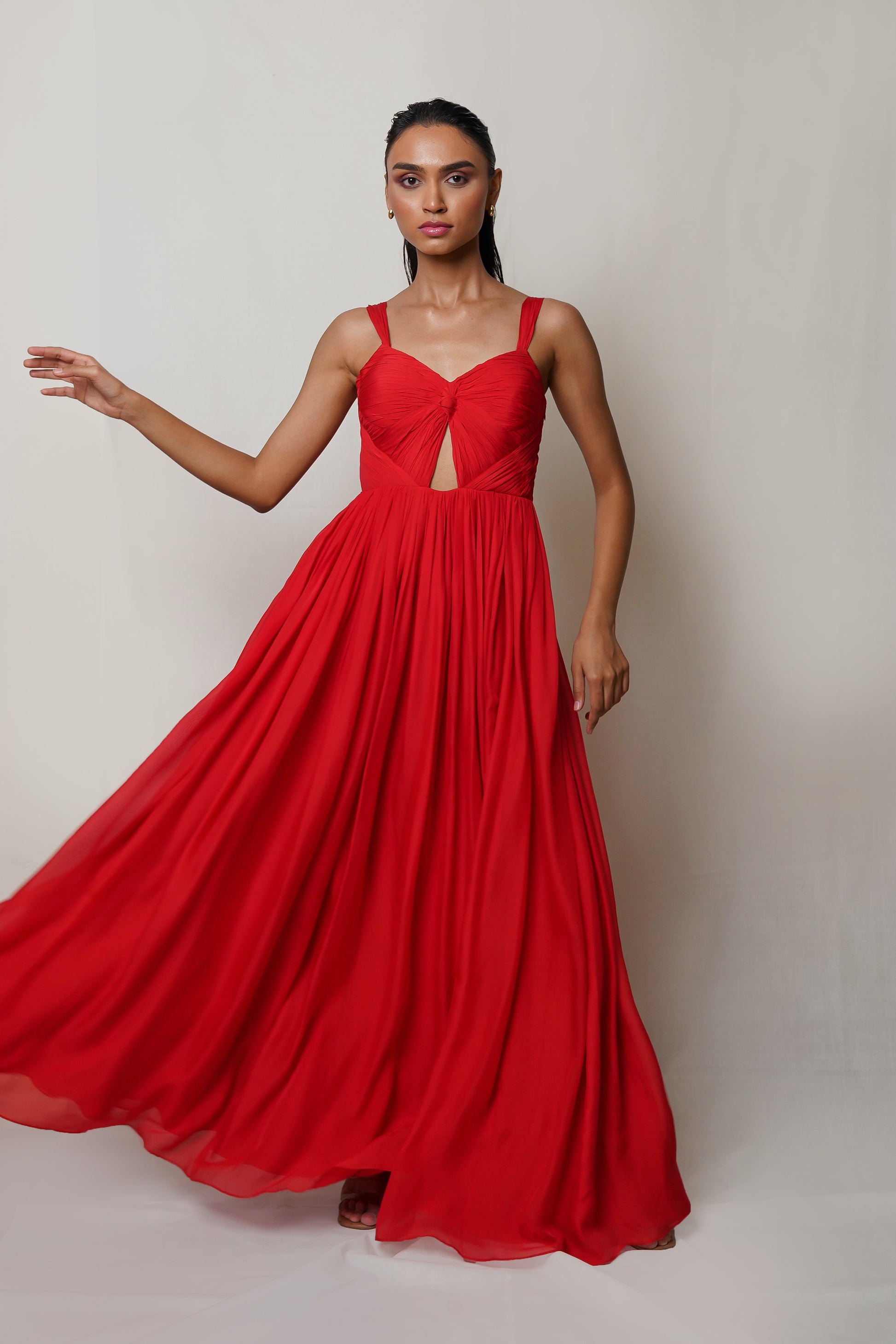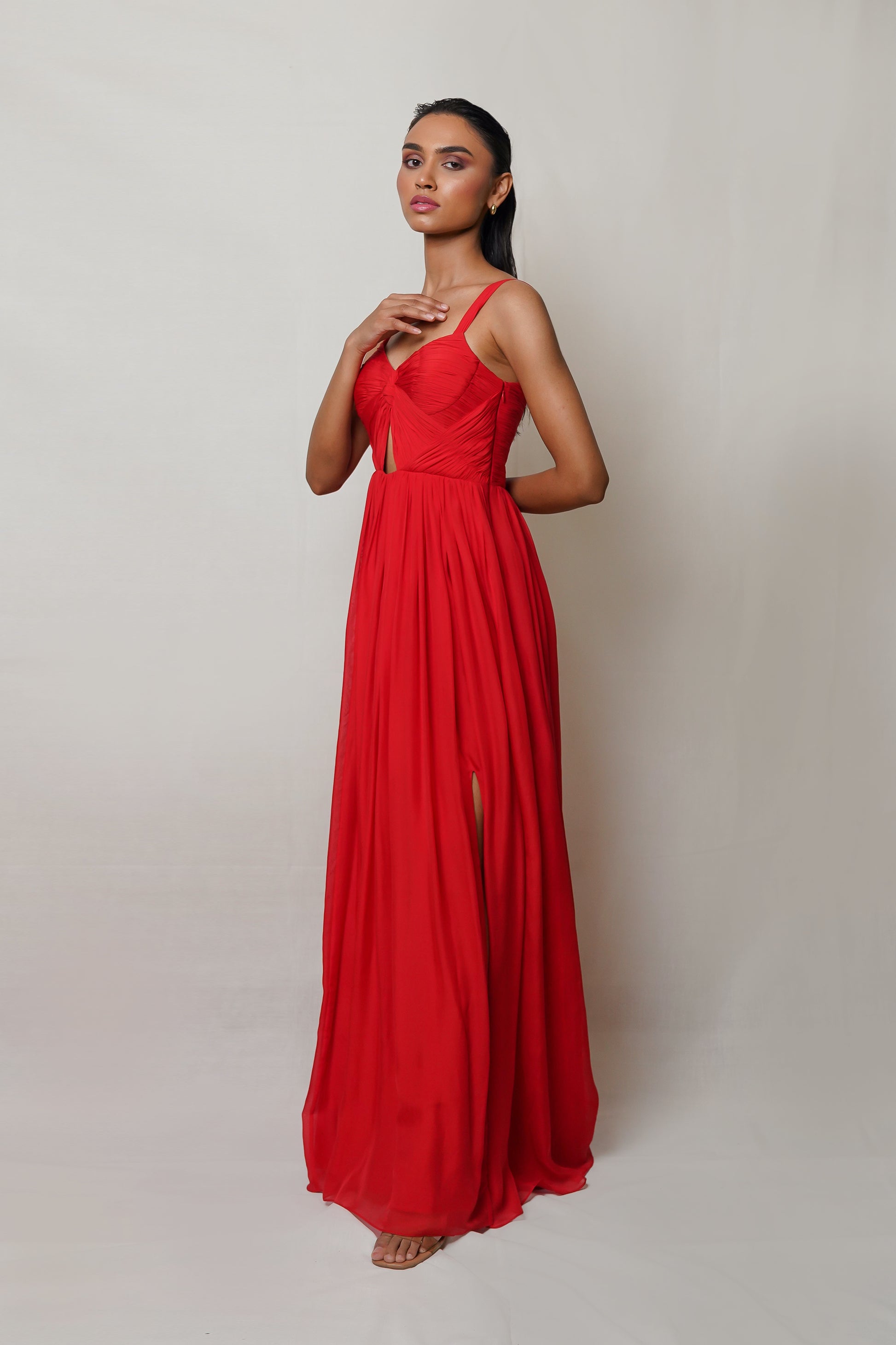 Introducing the RUBY red gown, featuring a front knot and hand-pleated bodice with a delicate mini keyhole. The graceful back tie and front slit add a touch of sophistication, making this dress a must-have for any elegant occasion.