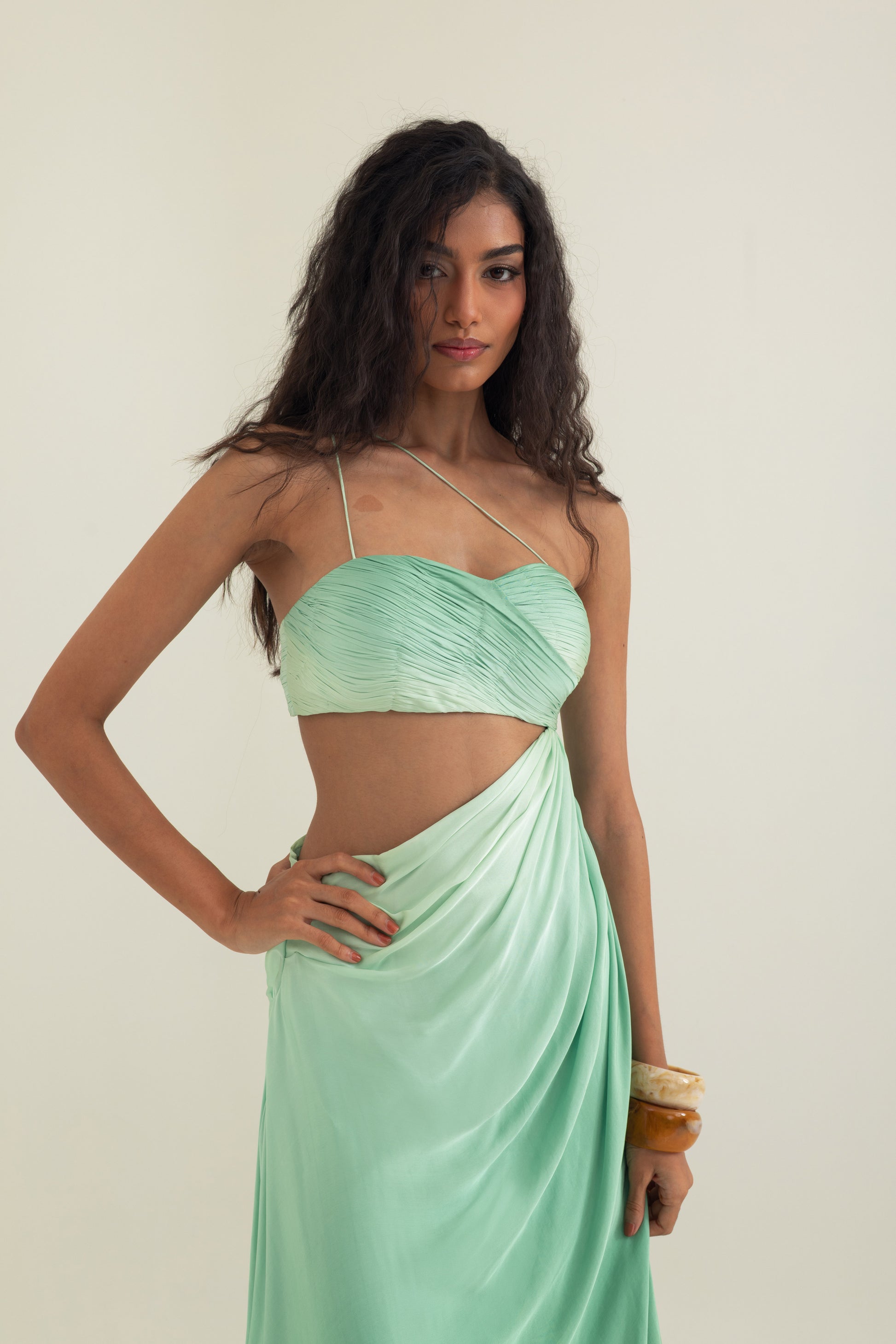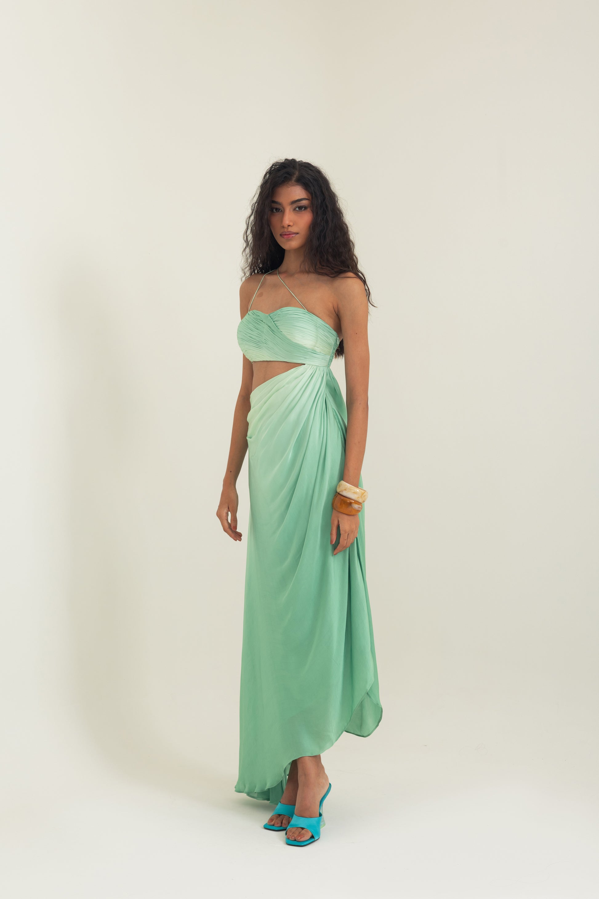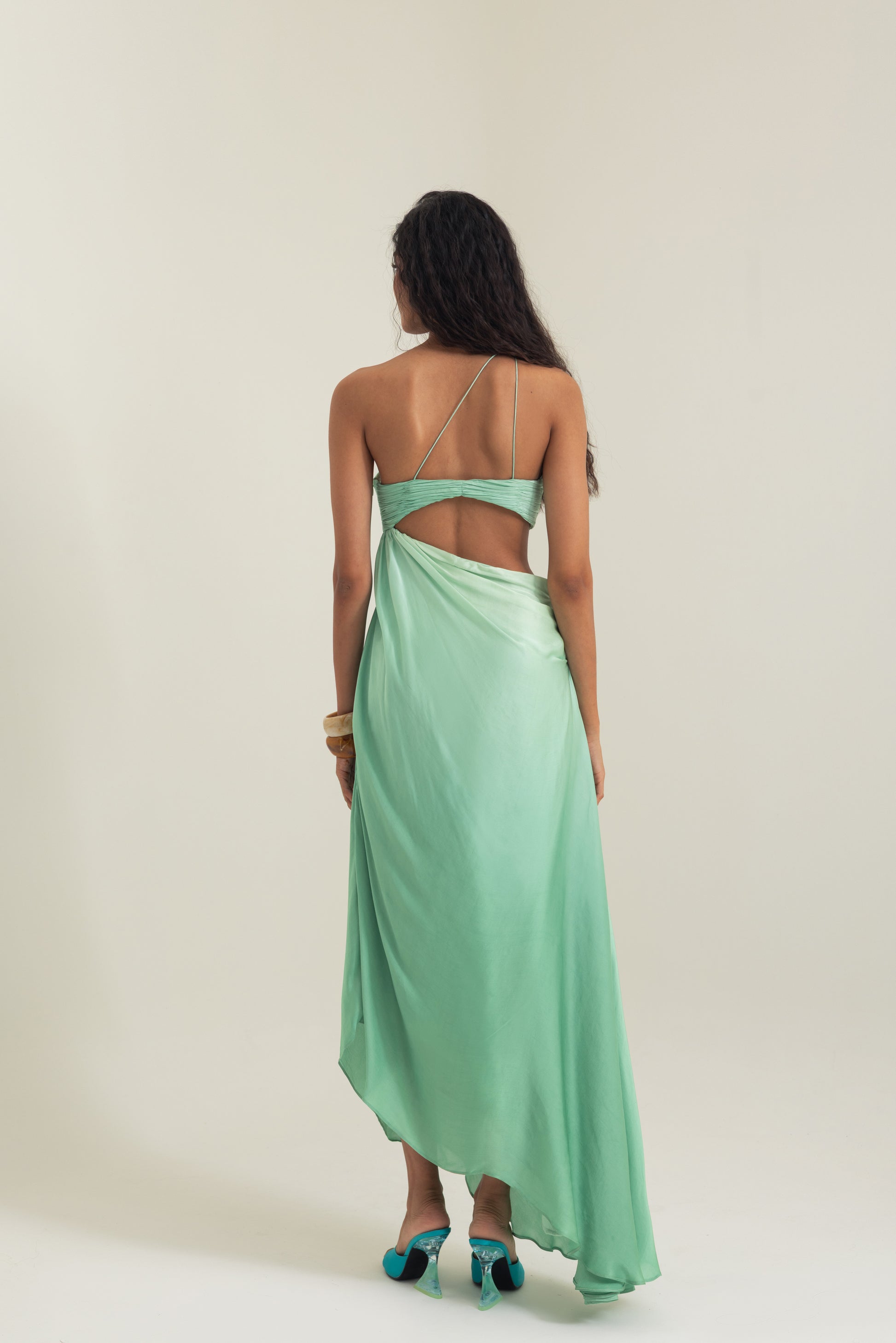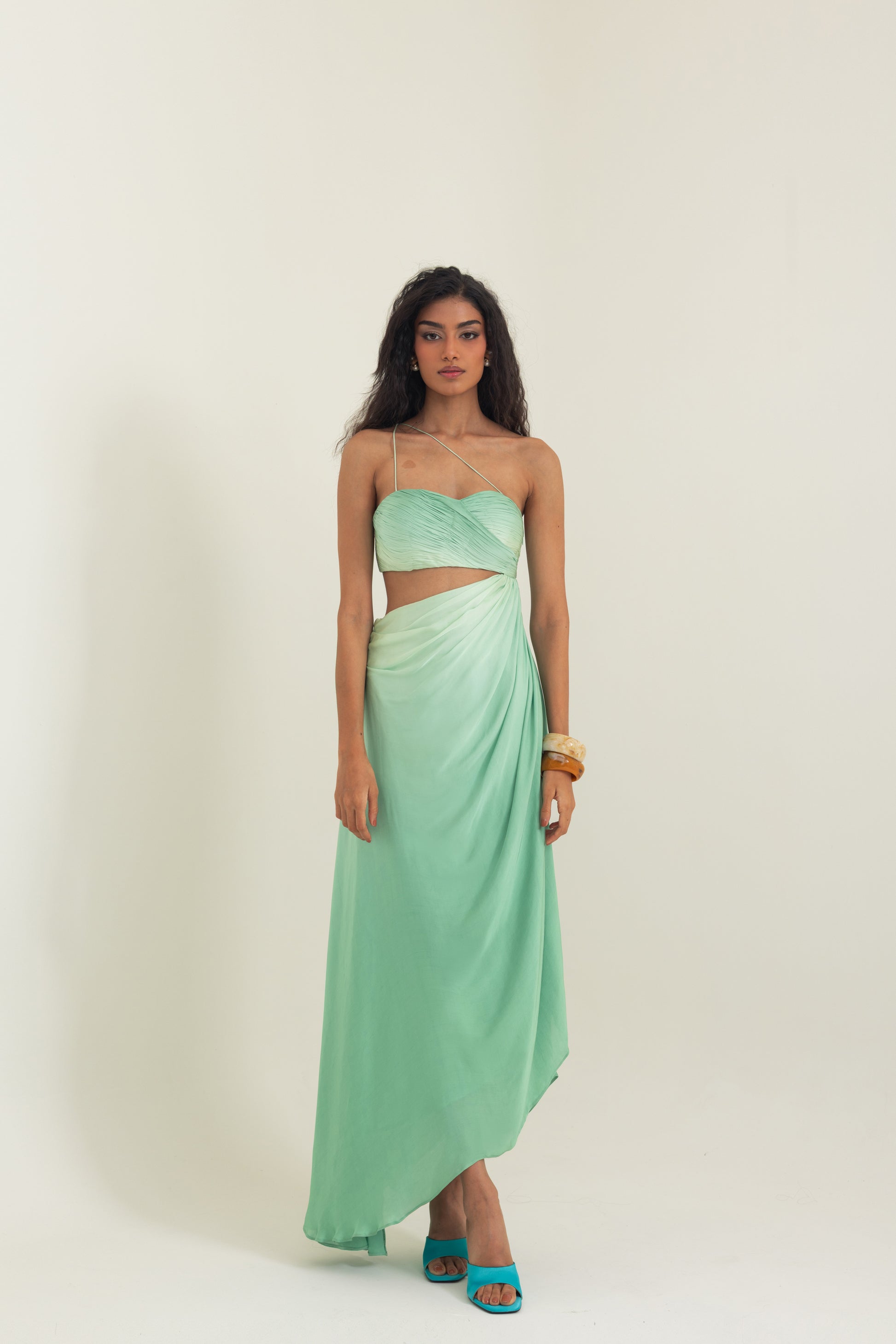 A side waist cut-out adds definition, while the draped skirt falls into an asymmetric hem, creating effortless movement. Effortless yet striking, this piece is perfect for elevated resort wear , for destination events or exotic holidays.