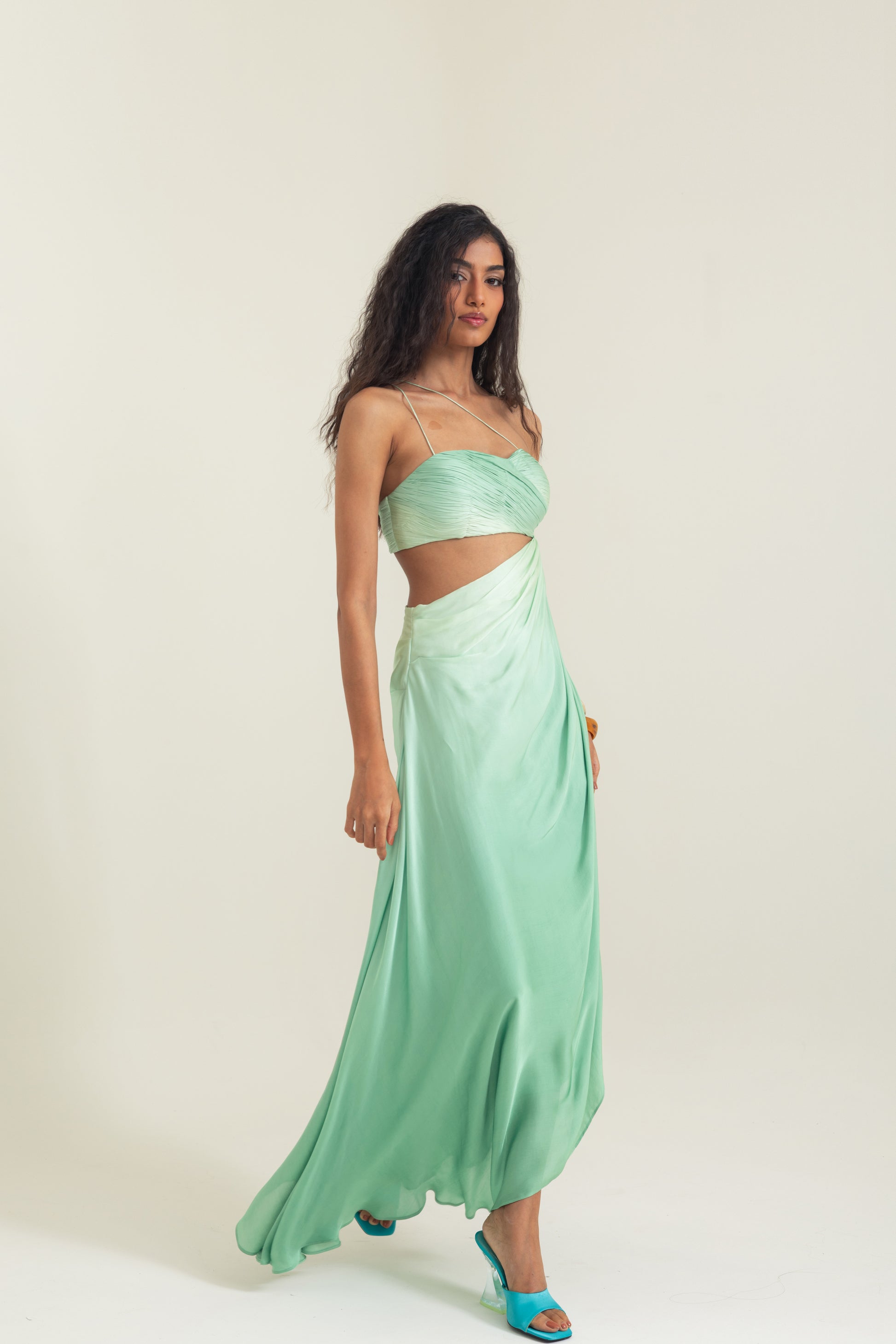 Rendered in soft Italian olive tones, this gown is cut from luxurious satin georgette with a fluid drape. The hand-ruched bodice features a bandeau-style neckline with asymmetric spaghetti straps, offering a modern, sculpted look.