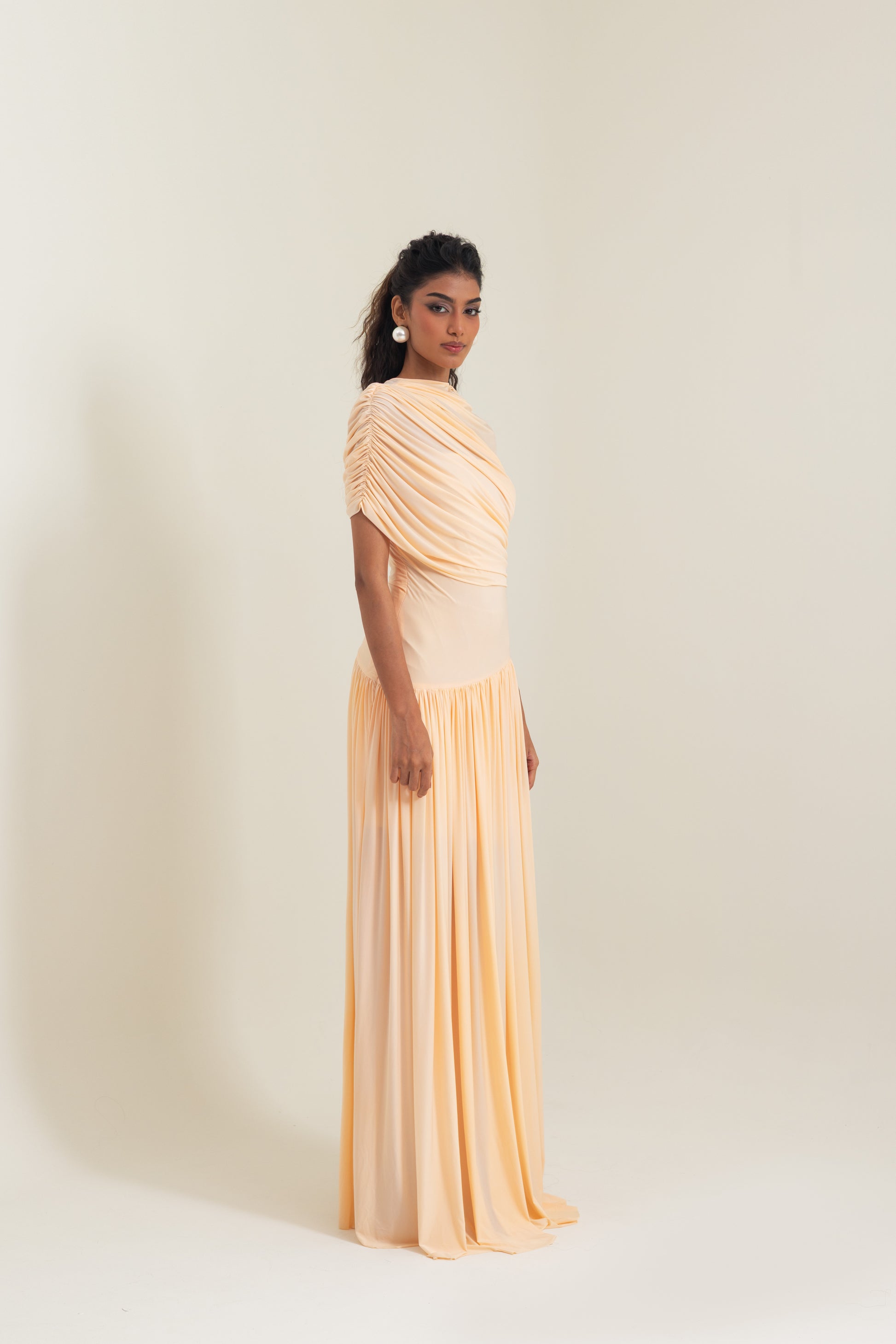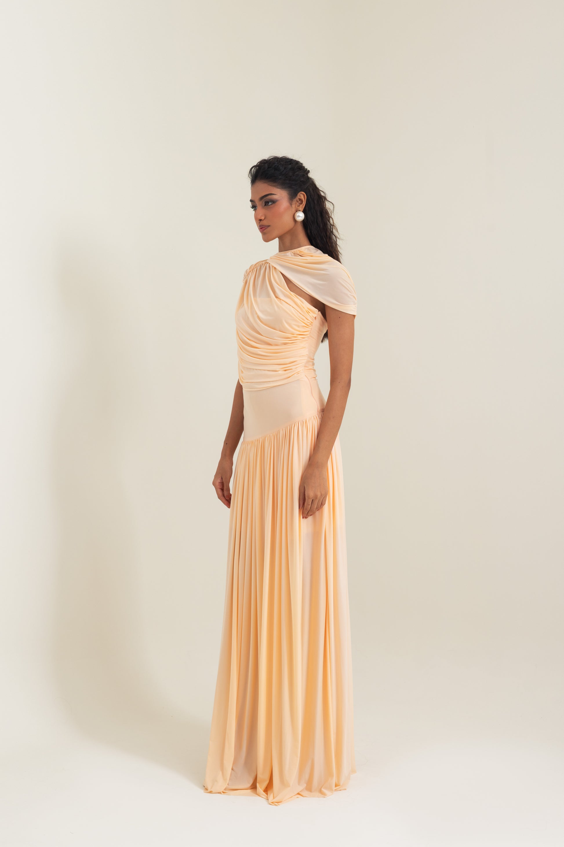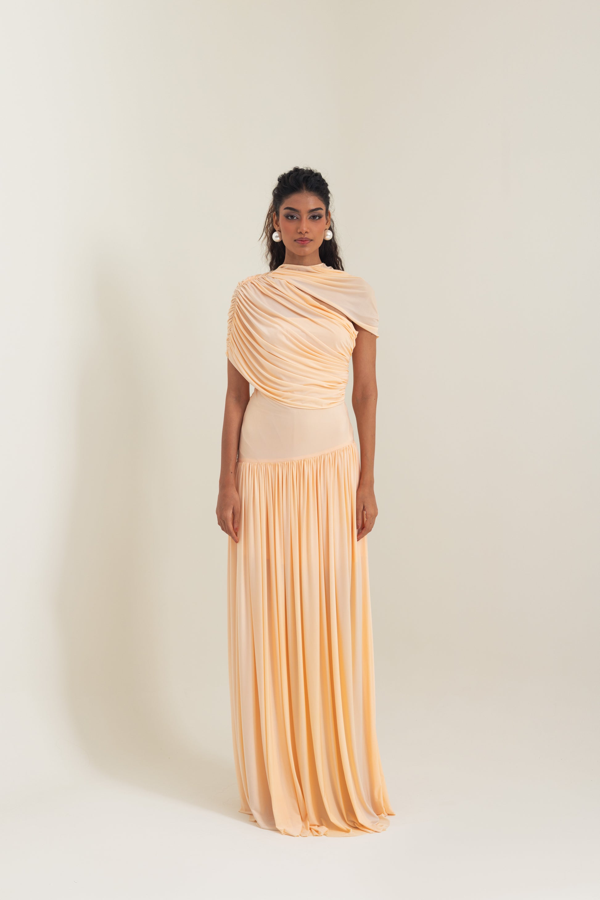 The bodice features exquisite asymmetric draping, skillfully hand-gathered and draped across the shoulder and waist to create a sculpted yet effortless silhouette. Flowing into a softly pleated skirt, the gown moves with graceful fluidity, offering both comfort and drama.