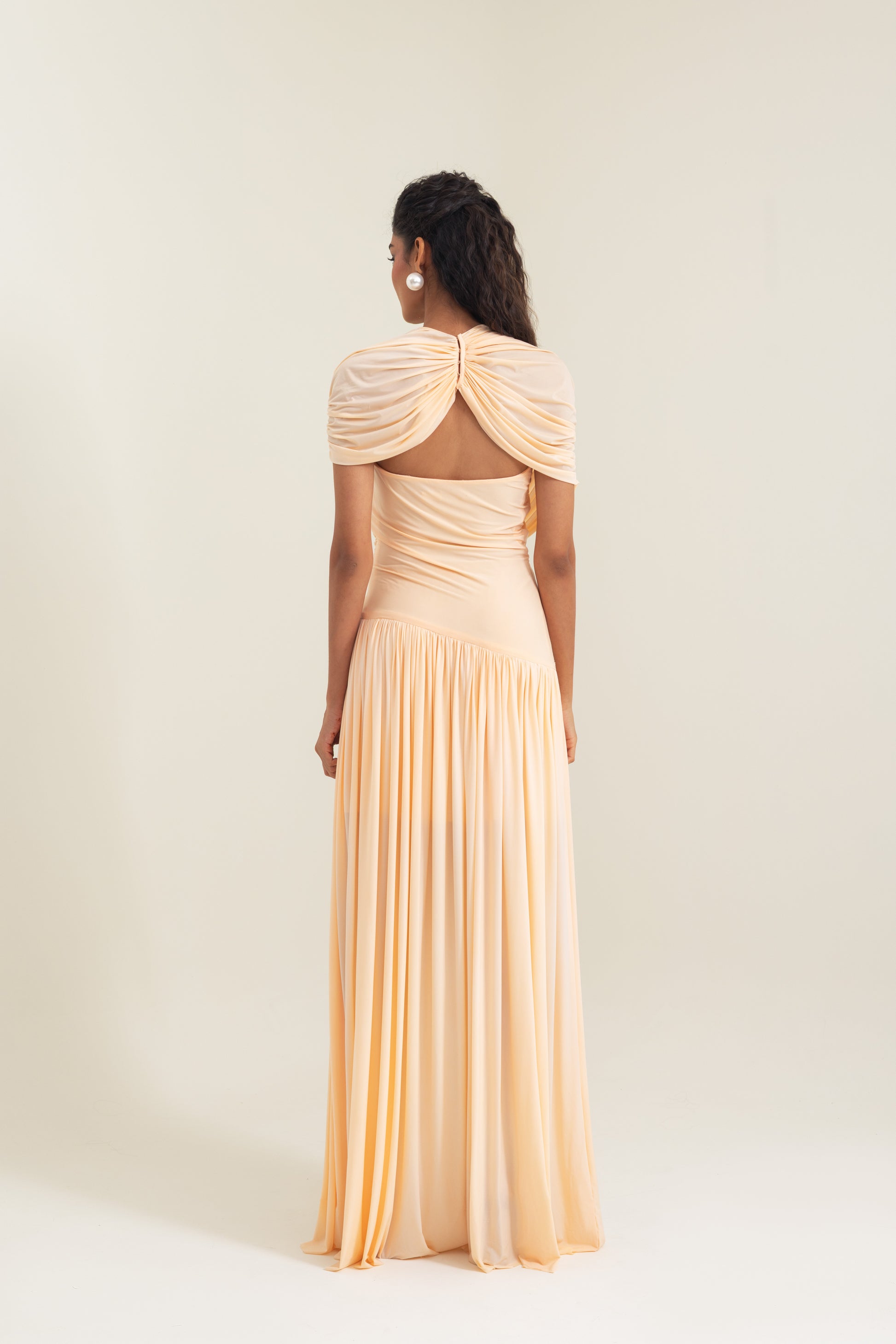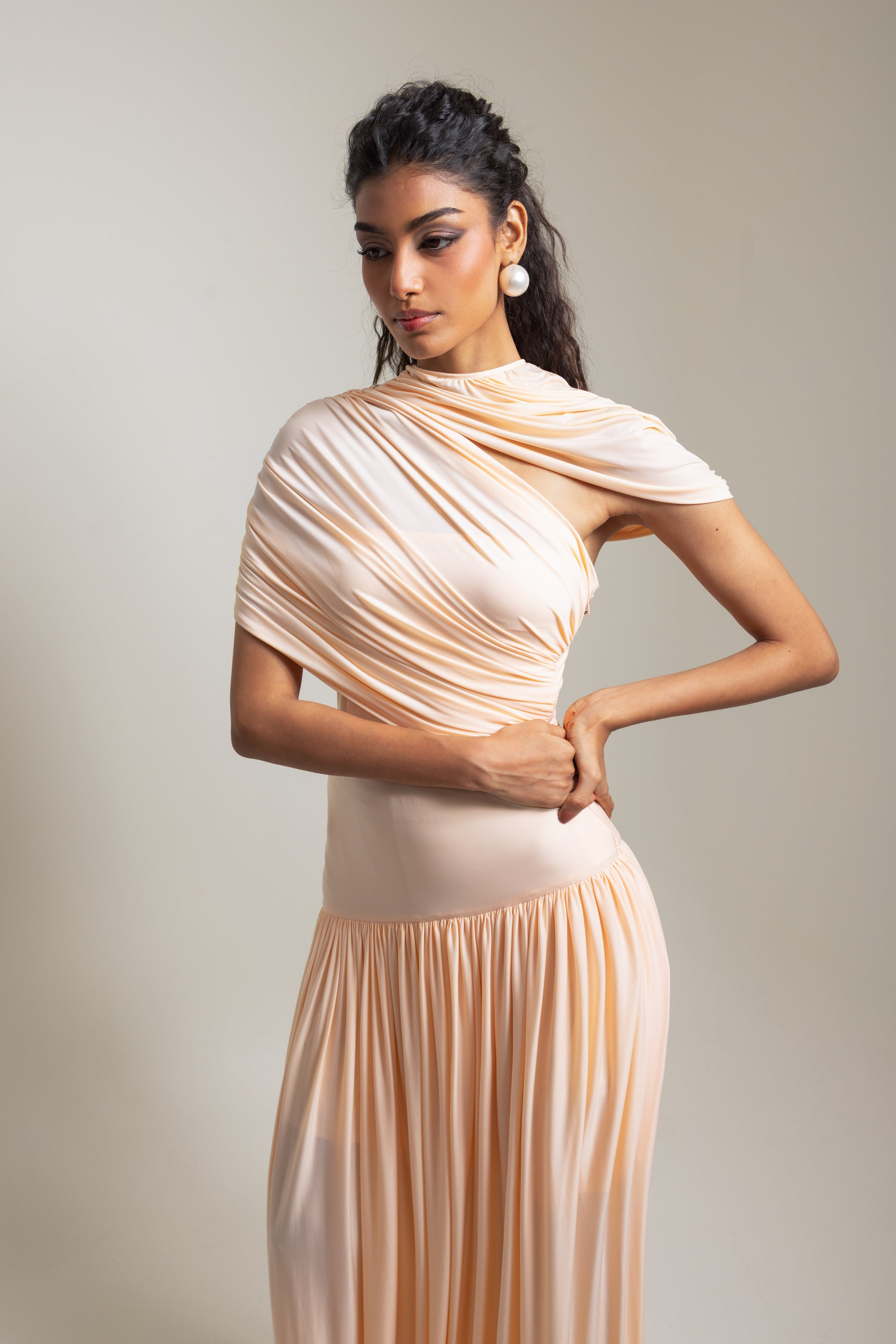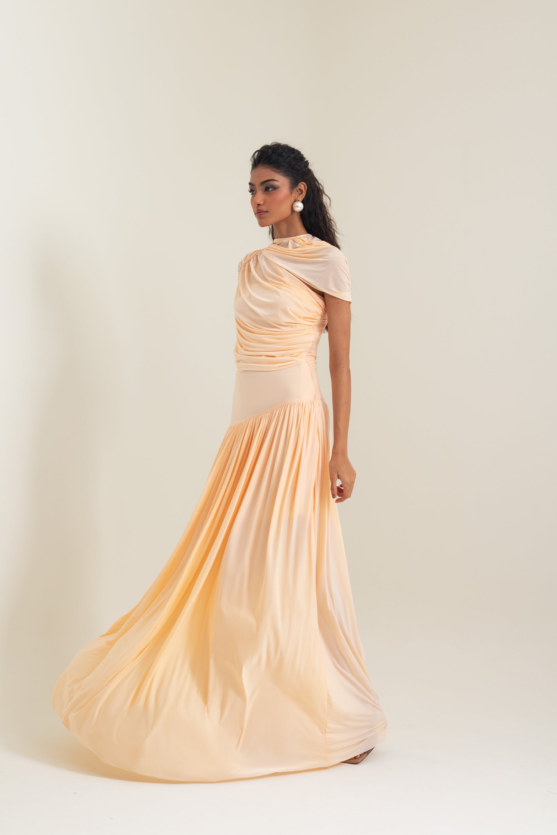 The bodice features exquisite asymmetric draping, skillfully hand-gathered and draped across the shoulder and waist to create a sculpted yet effortless silhouette. Flowing into a softly pleated skirt, the gown moves with graceful fluidity, offering both comfort and drama.
