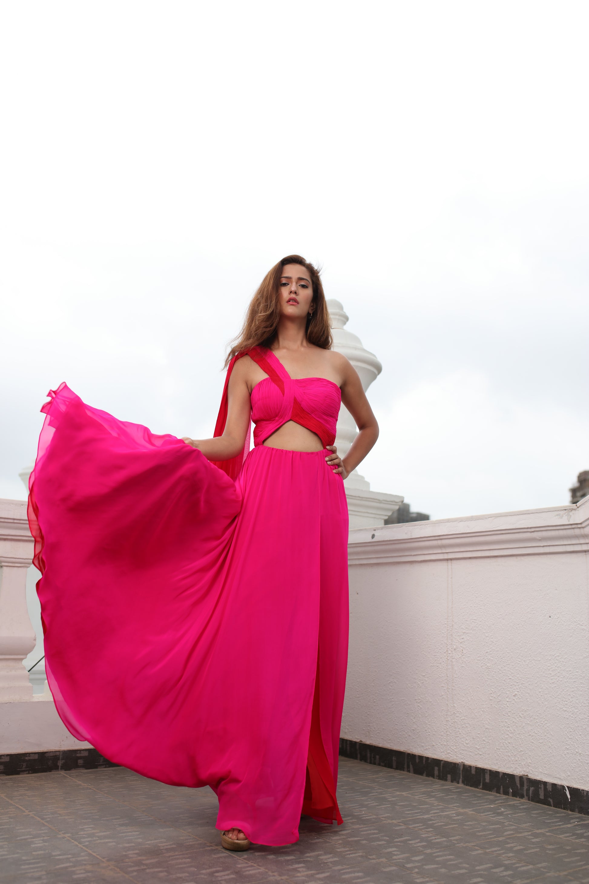This stunning one shoulder gown is hand pleated on the bodice and features two flowing trails and a front slit for a dramatic look. The bright pink and red chiffon make it perfect for cocktails, destination weddings, bridesmaids, and exotic vacations. Its vibrant colors will make you stand out and feel luxurious.