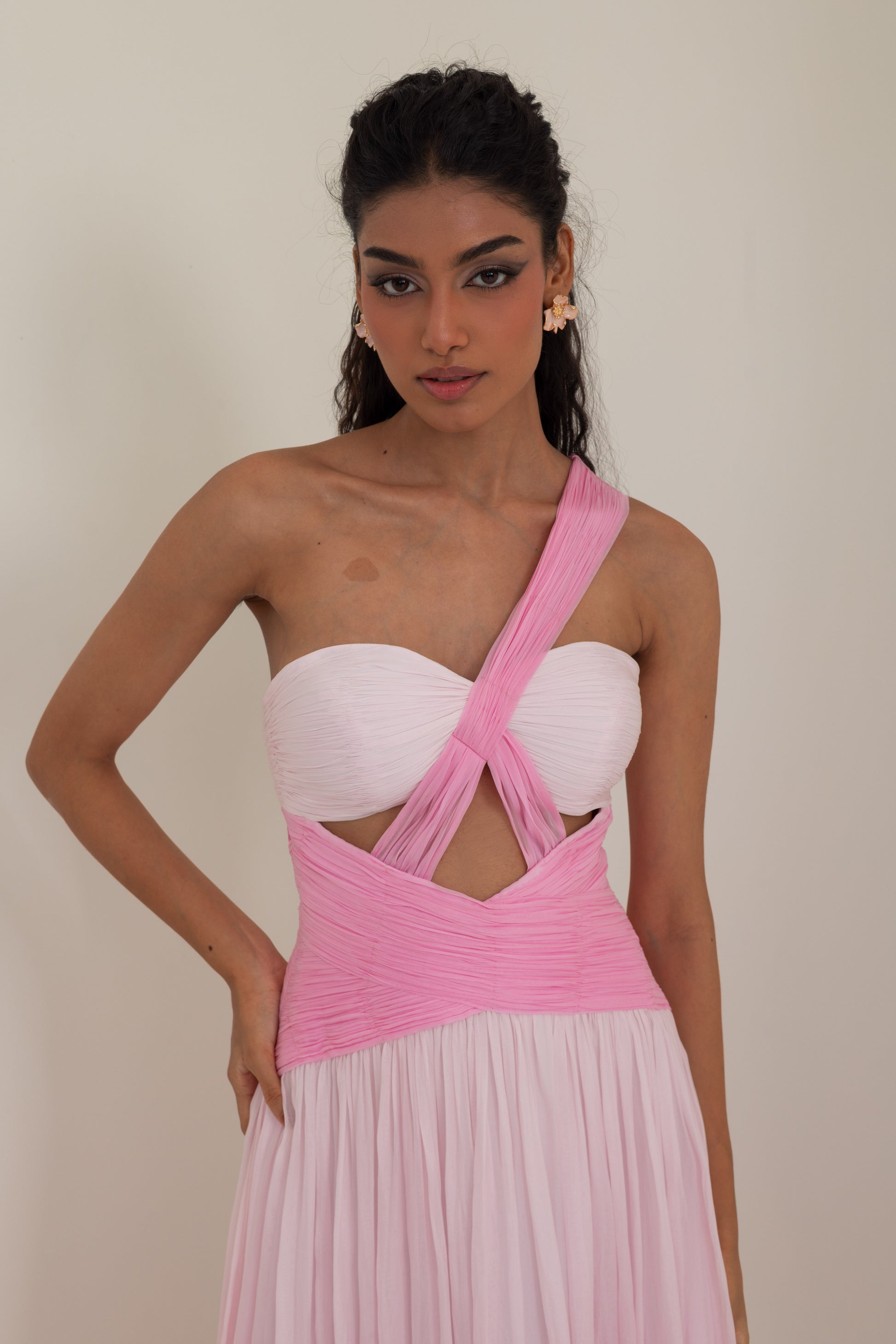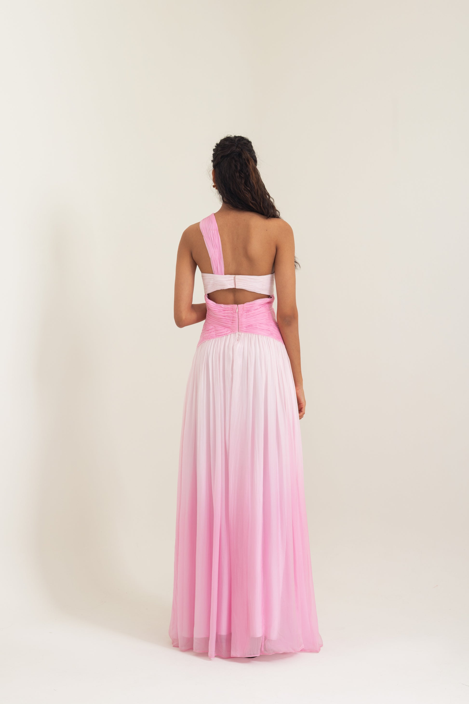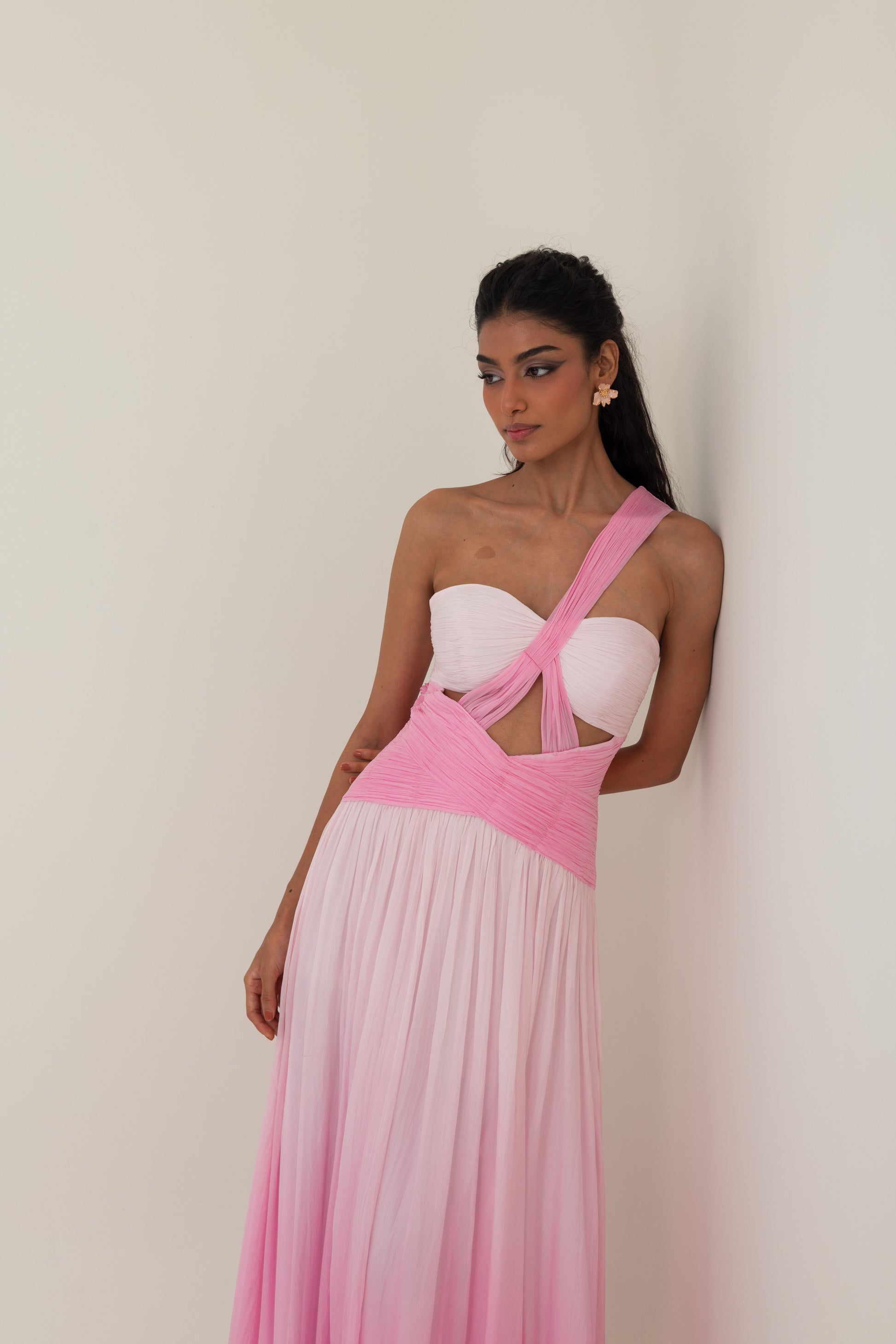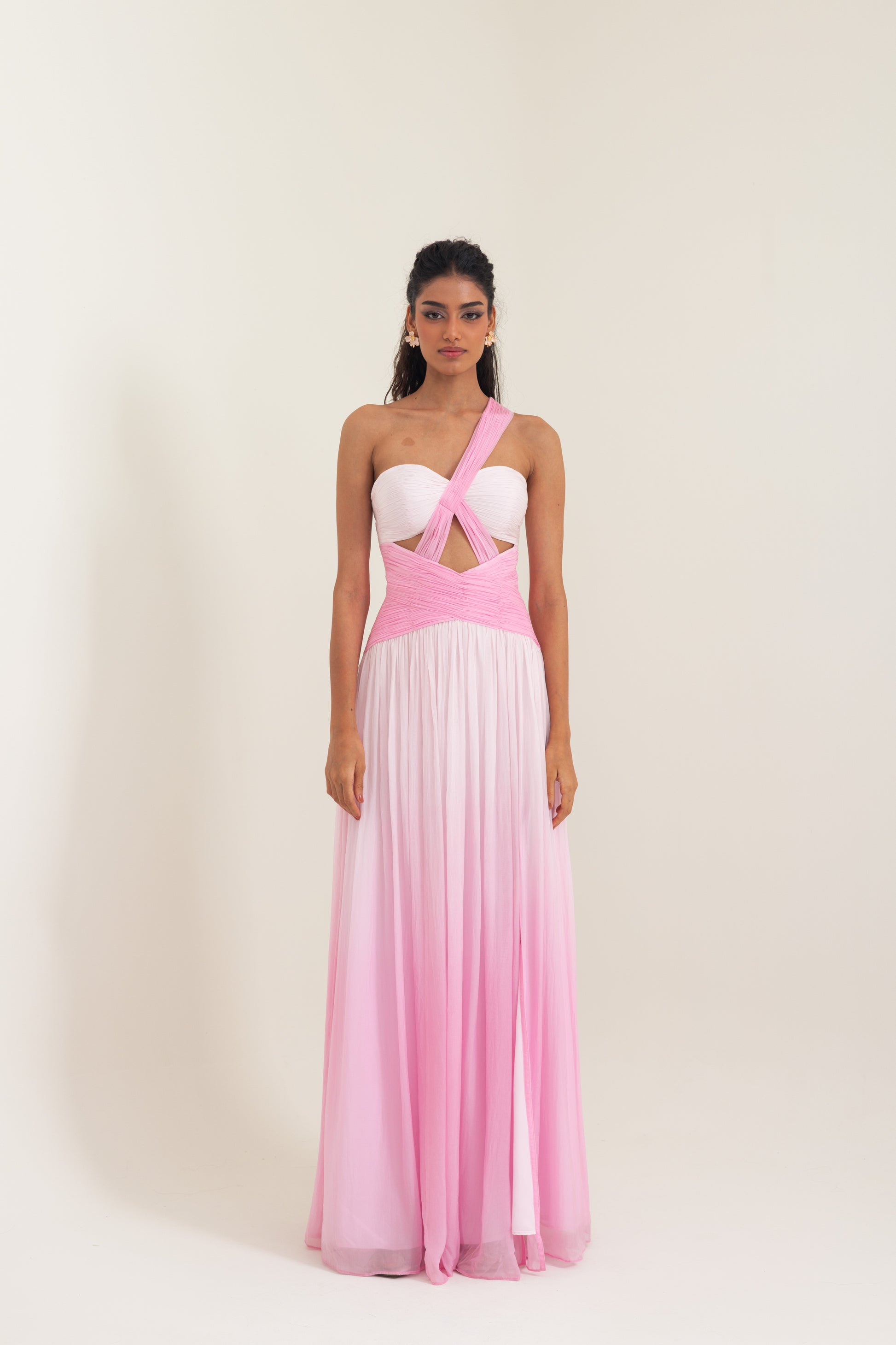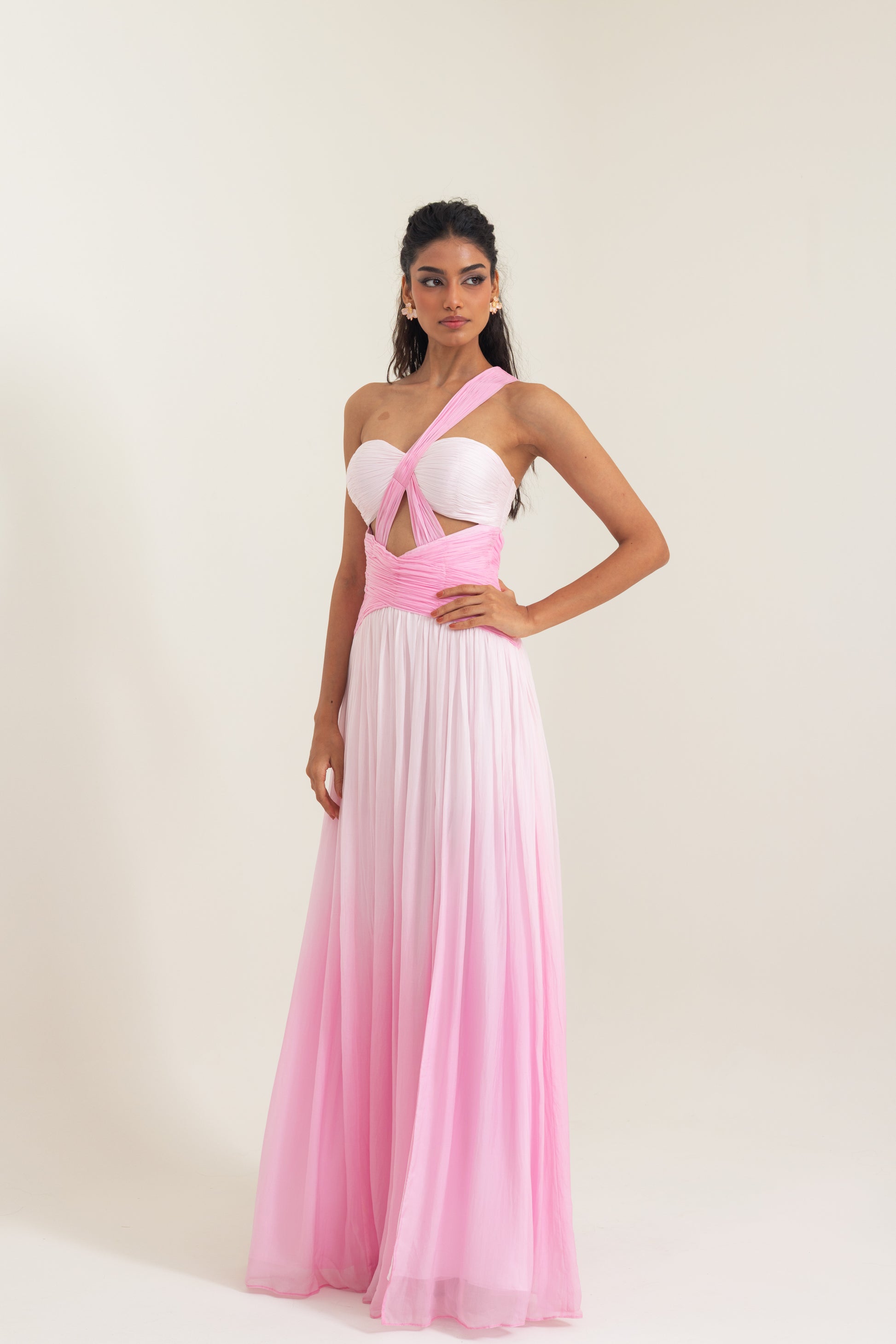 The ombre interplay of blush pink melting into soft white evokes a dreamy, romantic aura, while a subtle slit lends a modern, alluring edge. Designed for graceful movement, the gown flows like poetry with every step, making it the quintessential choice for red-carpet moments, gala evenings, or destination soirées.