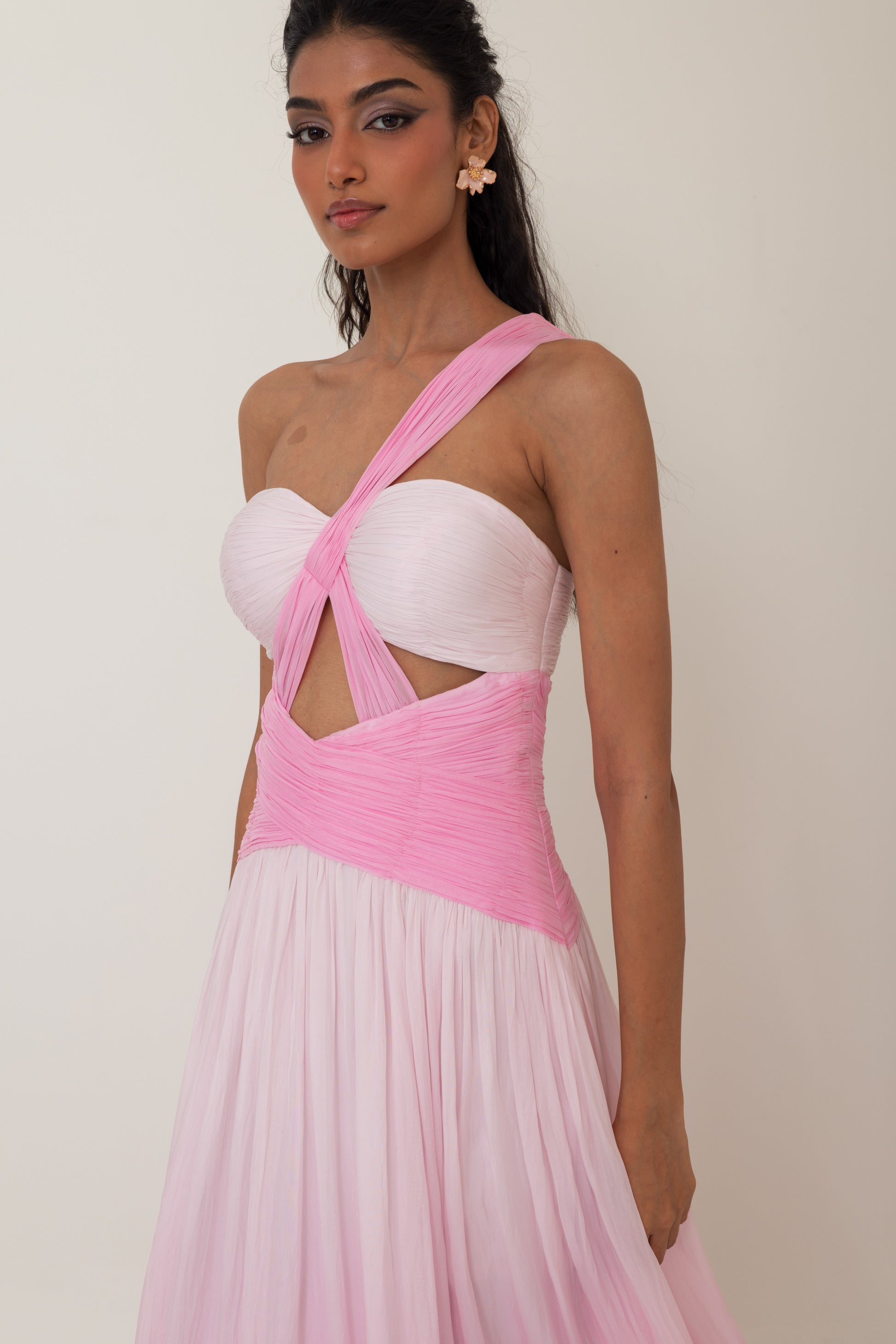 A vision of ethereal elegance, this gown is meticulously crafted in the finest flat chiffon, hand-draped to perfection. The bodice showcases an architectural criss-cross neckline with a delicate keyhole cut-out, seamlessly blending sensuality with refined sophistication. The waist is cinched with intricate pleating, sculpting a flattering silhouette before cascading into a voluminous, flowy A-line skirt.