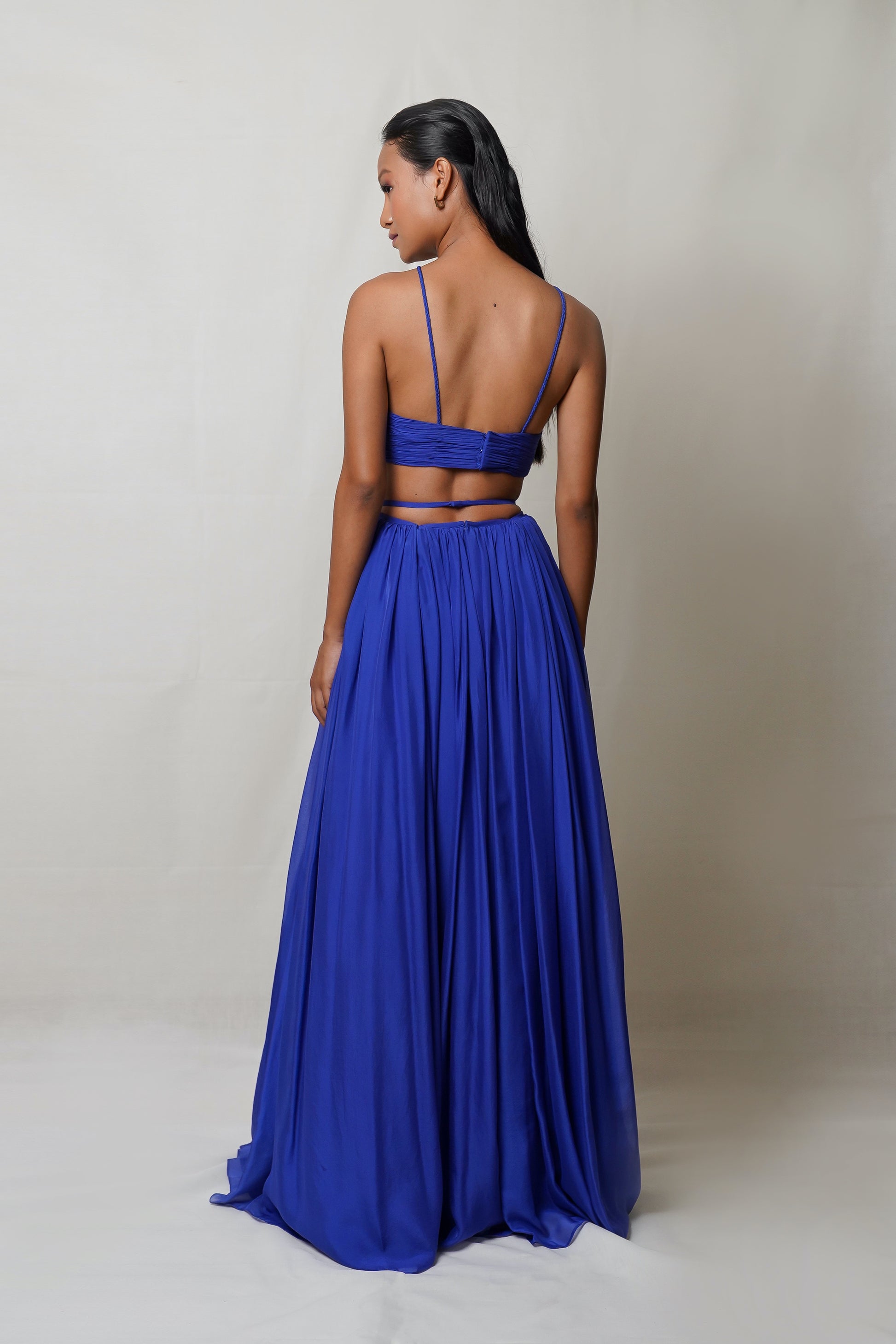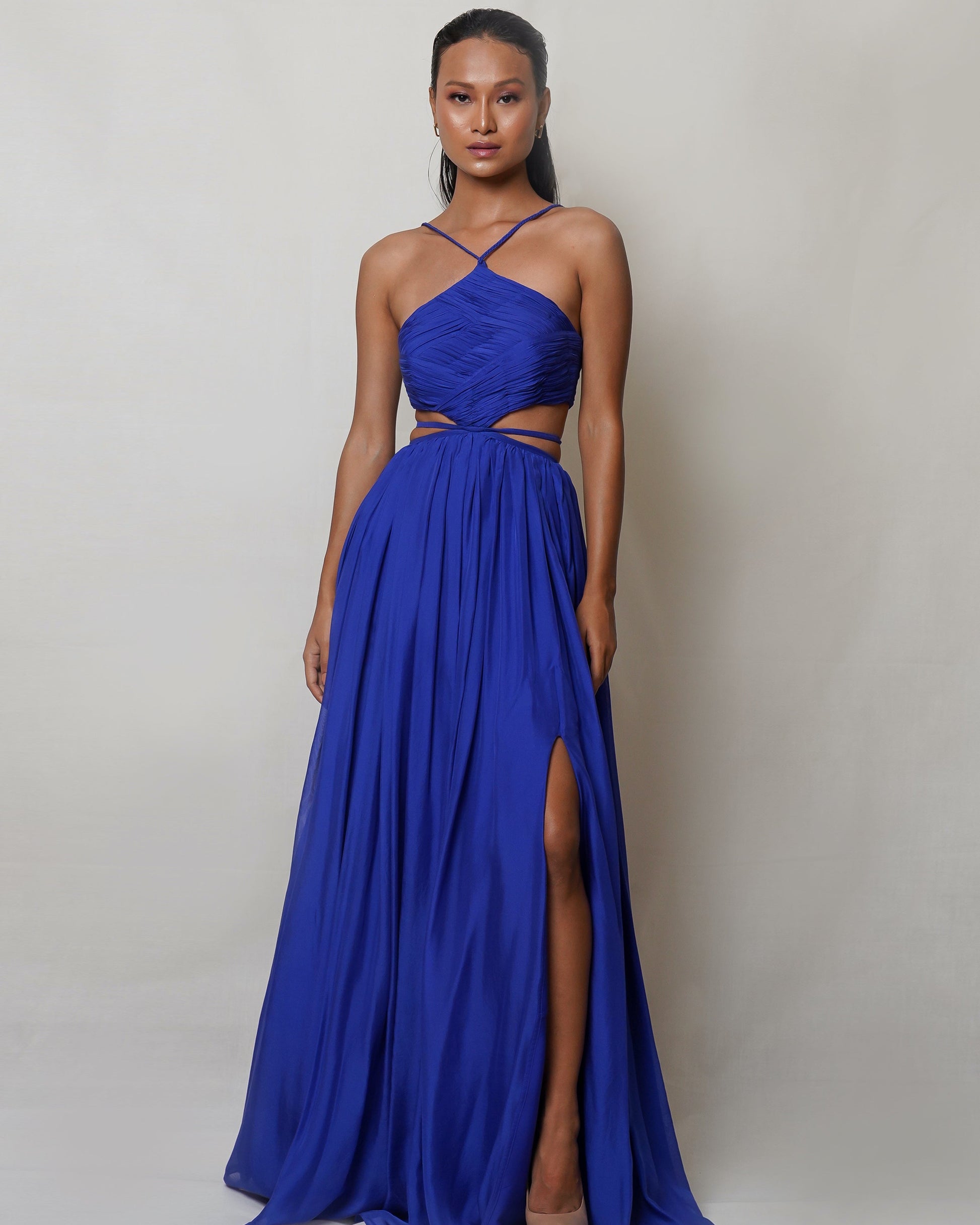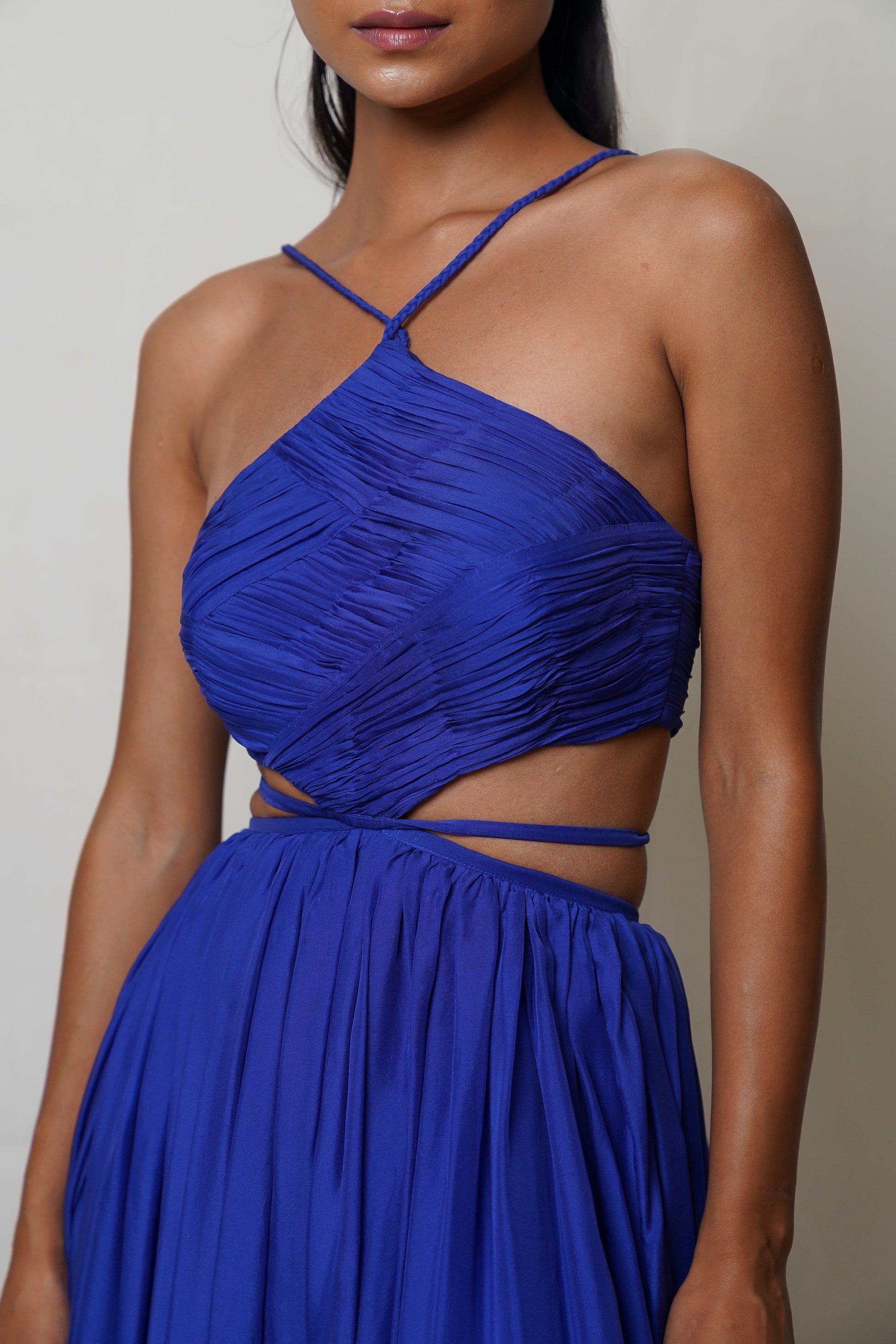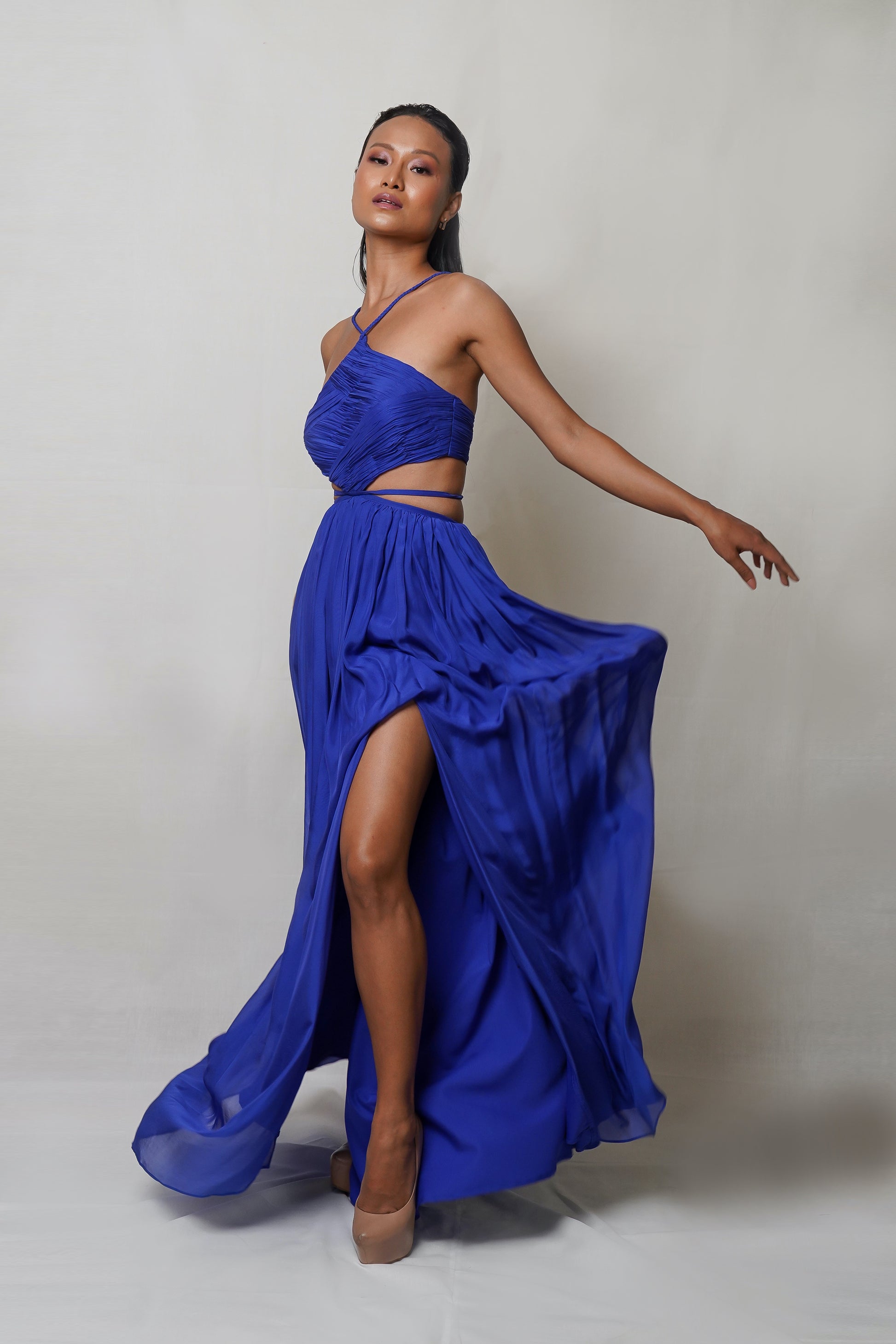 Indulge in the luxurious elegance of our TANZANITE gown. Hand pleated in navy blue with delicate braided straps and a flared skirt with side cuts, this exquisite piece is perfect for bridesmaids, red carpets, and special occasions. Feel like a true fashion icon and make a statement wherever you go.