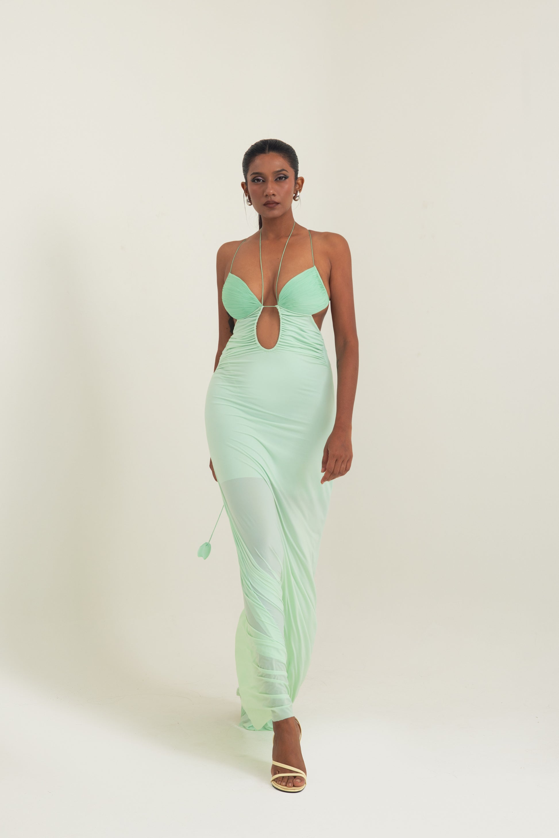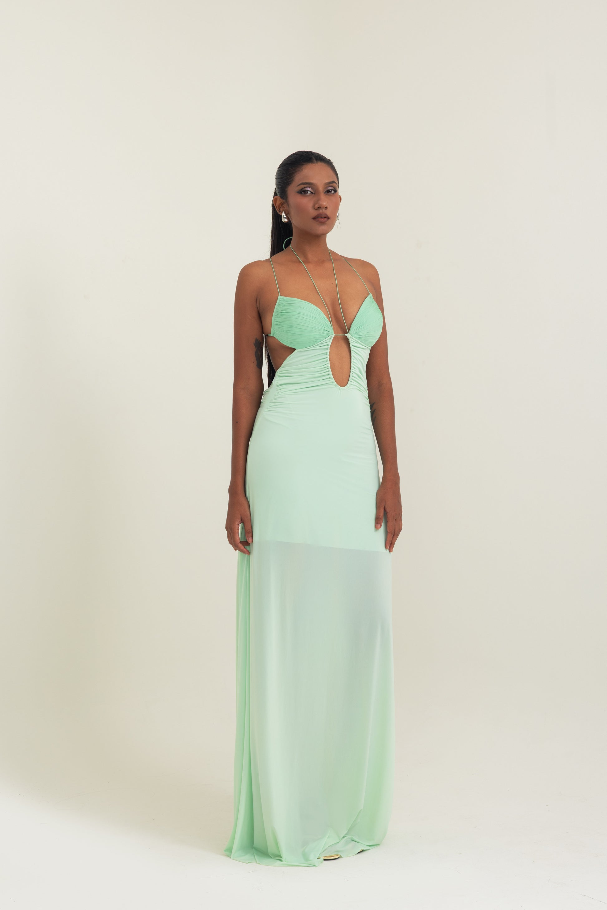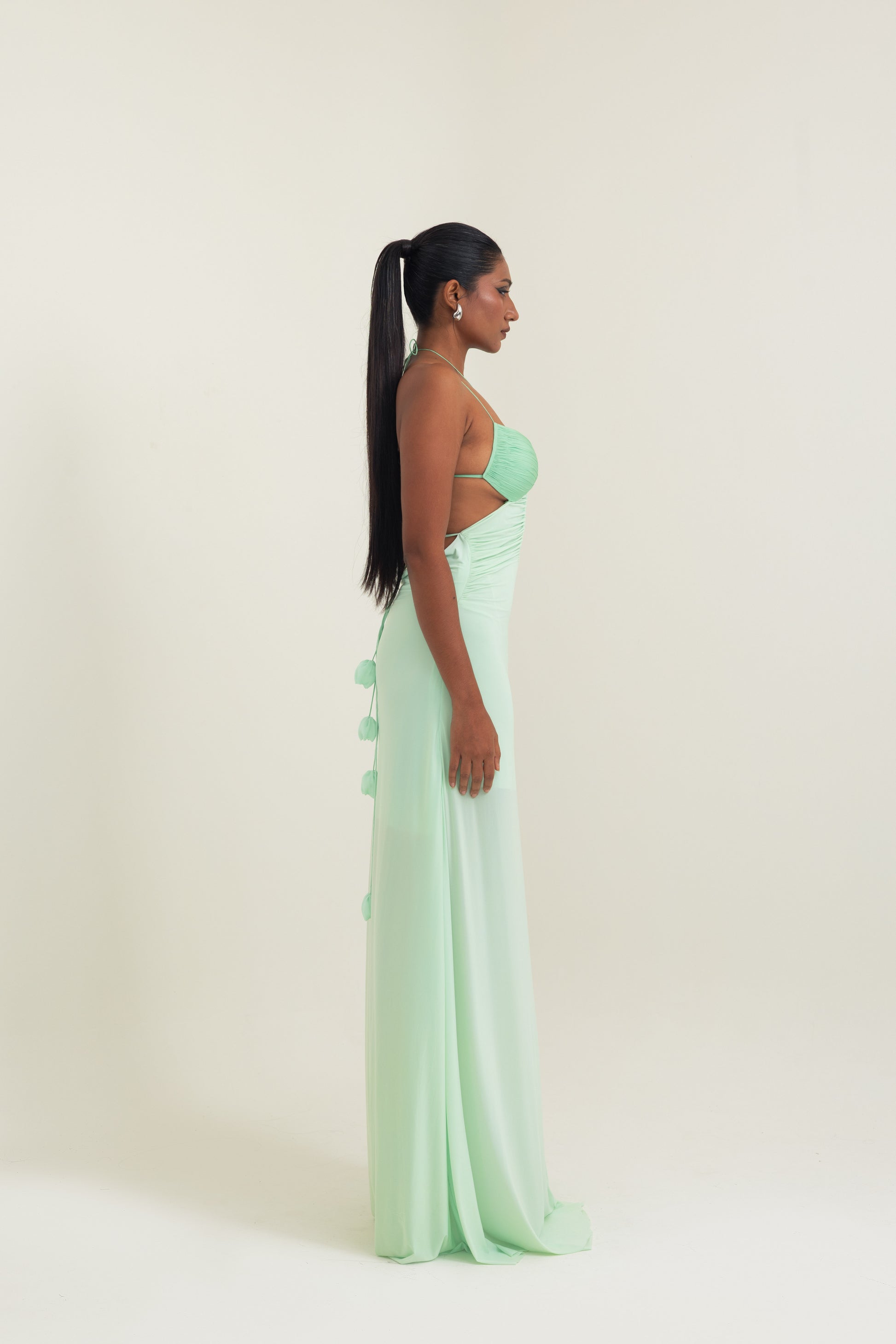 Bring a touch of playful sensuality to your wardrobe with this mint green gown, crafted in soft malai lycra with delicate hand rushing. The halter neckline with a bold front keyhole cut-out highlights the décolleté, while the body-contouring silhouette flows seamlessly into a floor-length drape. At the back, slender tie-ups cascade gracefully, adorned with handcrafted lily accents — adding a whimsical, romantic finish. A statement piece for sunset soirées, destination weddings, or glamorous summer nights.