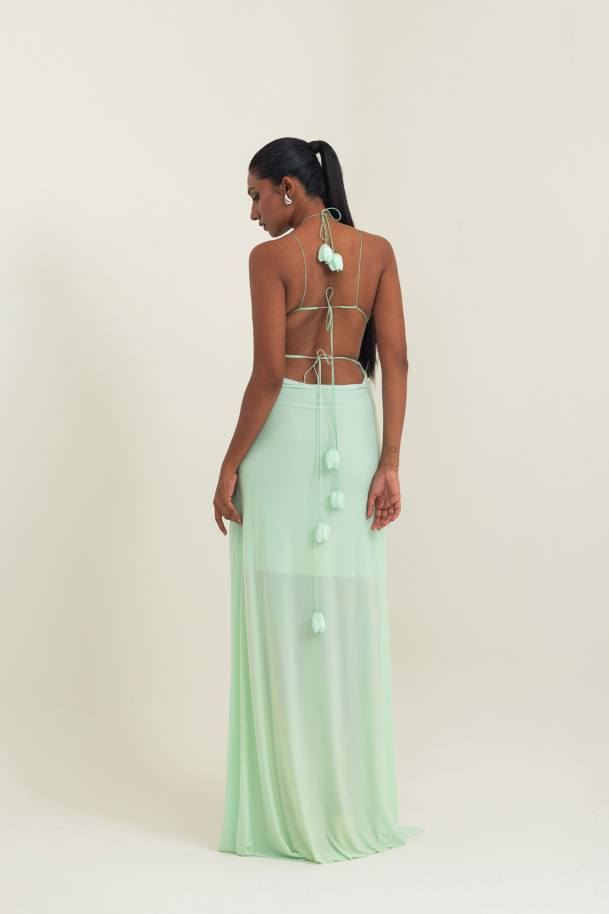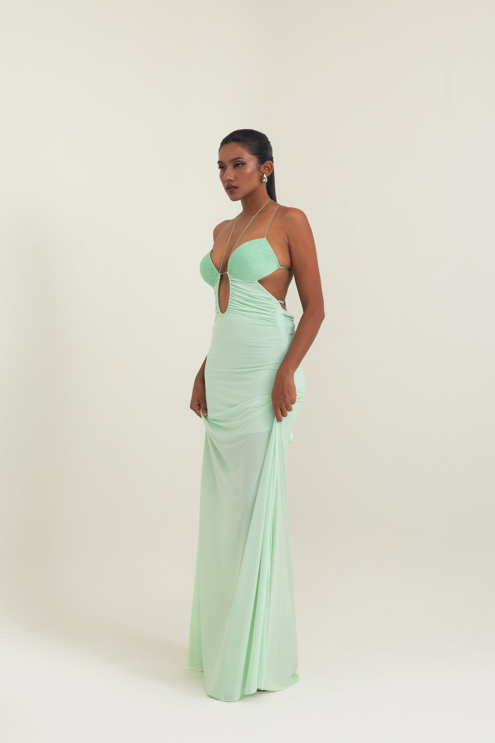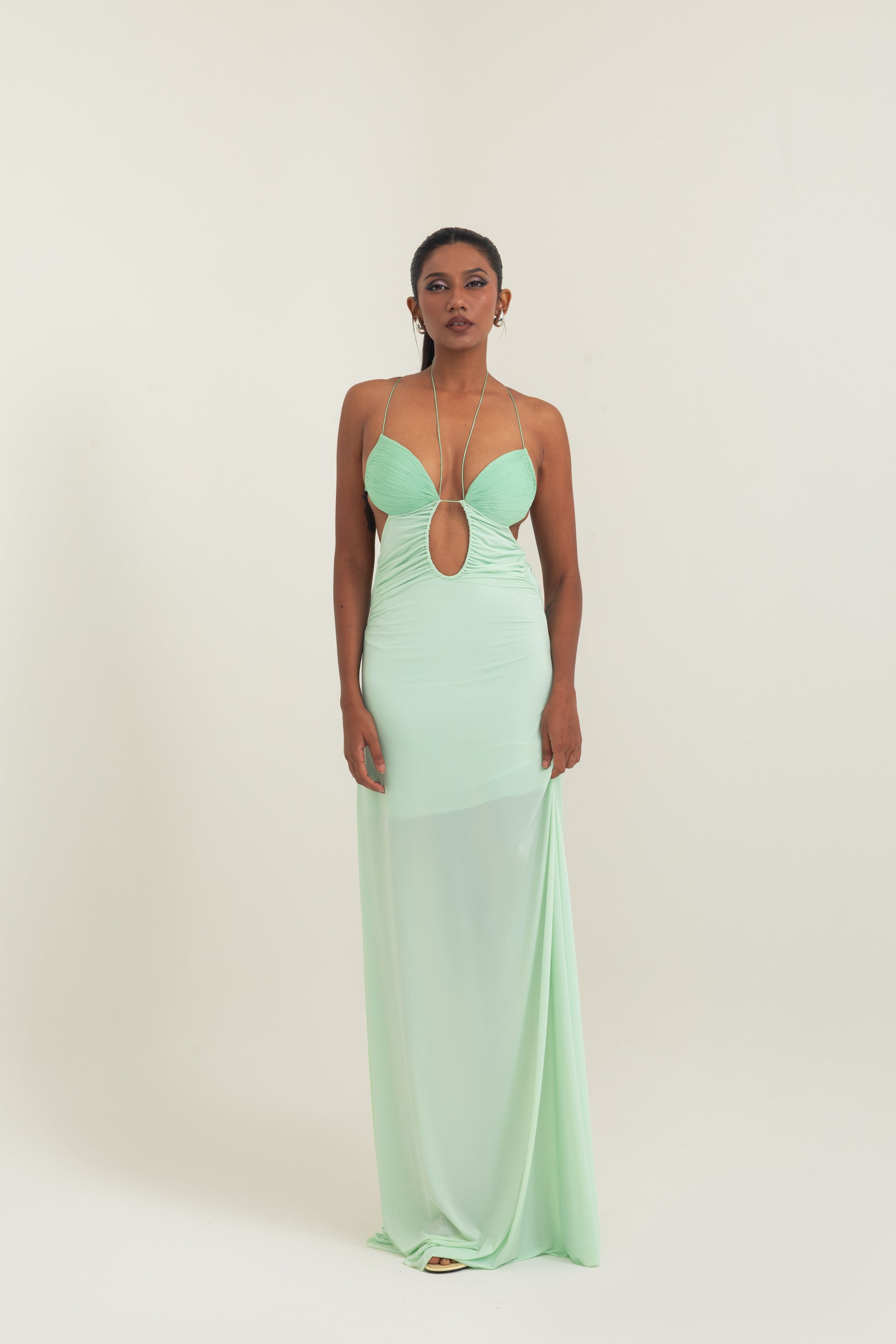 Bring a touch of playful sensuality to your wardrobe with this mint green gown, crafted in soft malai lycra with delicate hand rushing. The halter neckline with a bold front keyhole cut-out highlights the décolleté, while the body-contouring silhouette flows seamlessly into a floor-length drape. At the back, slender tie-ups cascade gracefully, adorned with handcrafted lily accents — adding a whimsical, romantic finish. A statement piece for sunset soirées, destination weddings, or glamorous summer nights.