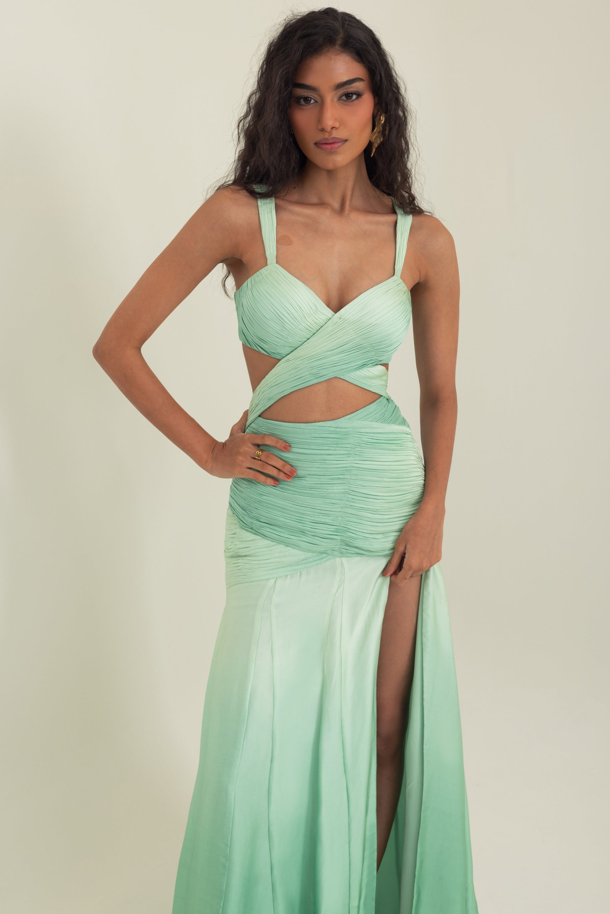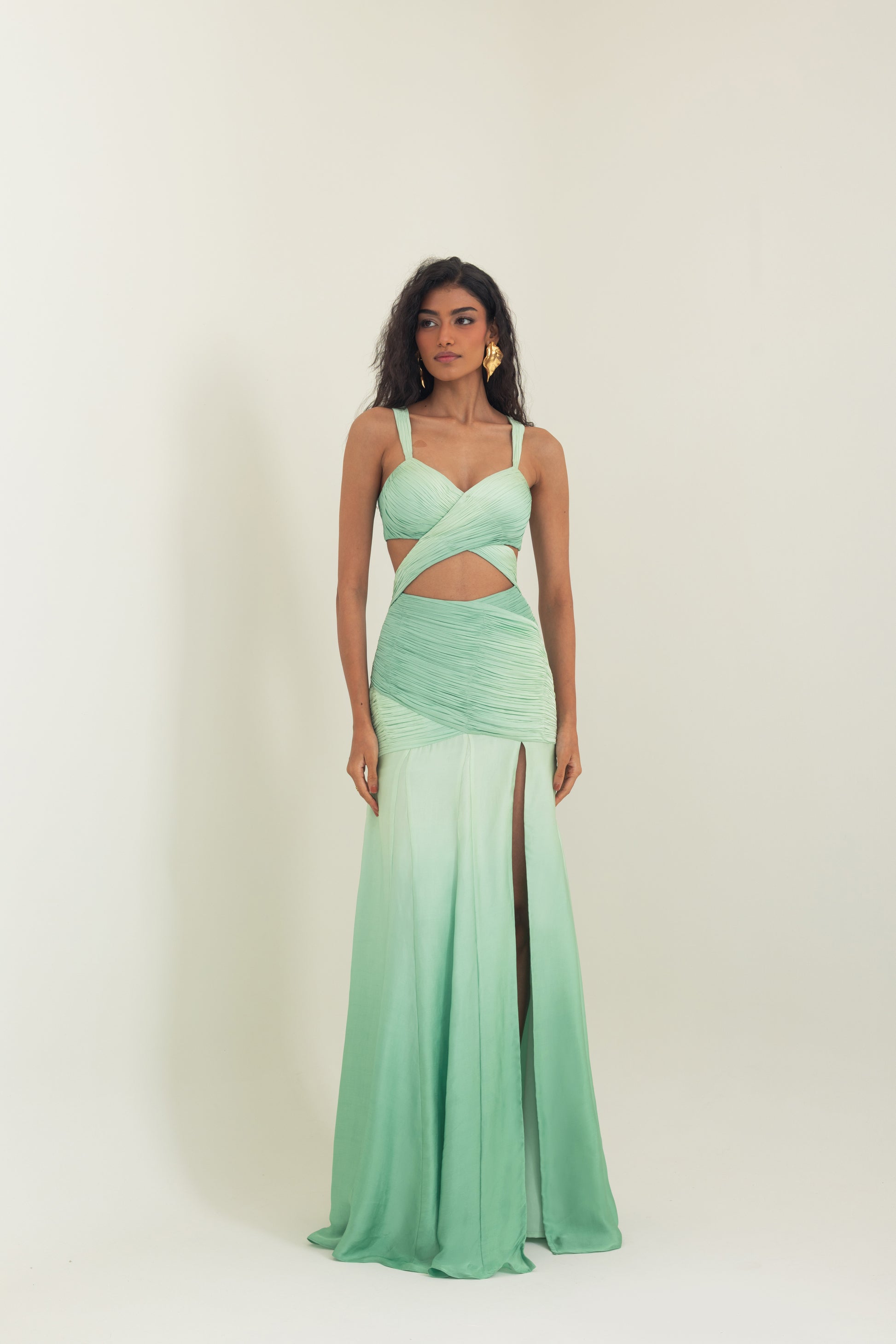 The subtle ombré of green tones flows into a fluid, floor-length skirt with a front slit for ease and movement. A perfect blend of sophistication and edge, ideal for destination weddings , evening soirees and special occasions , where effortless glamour is key, this gown merges timeless artistry with contemporary charm.