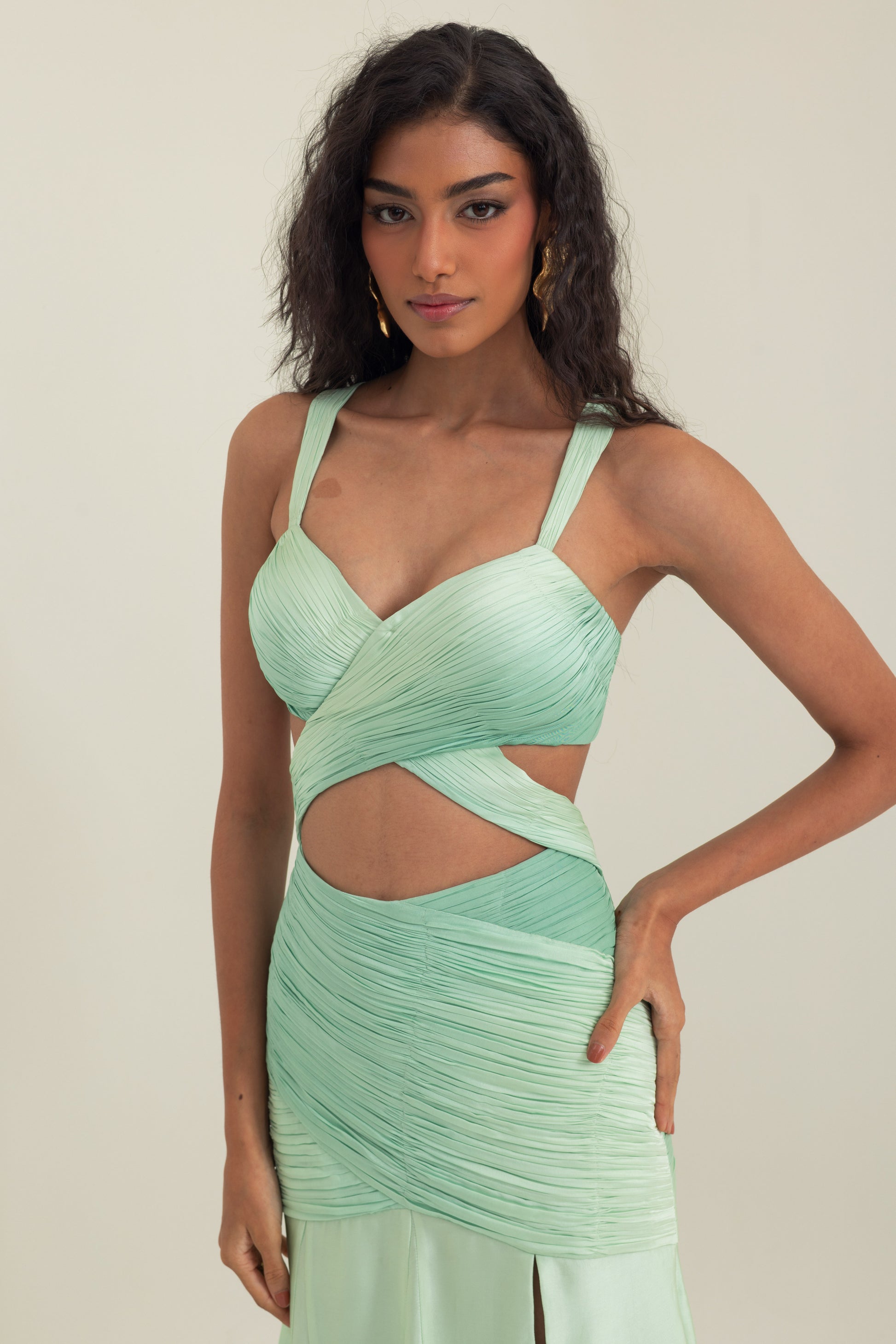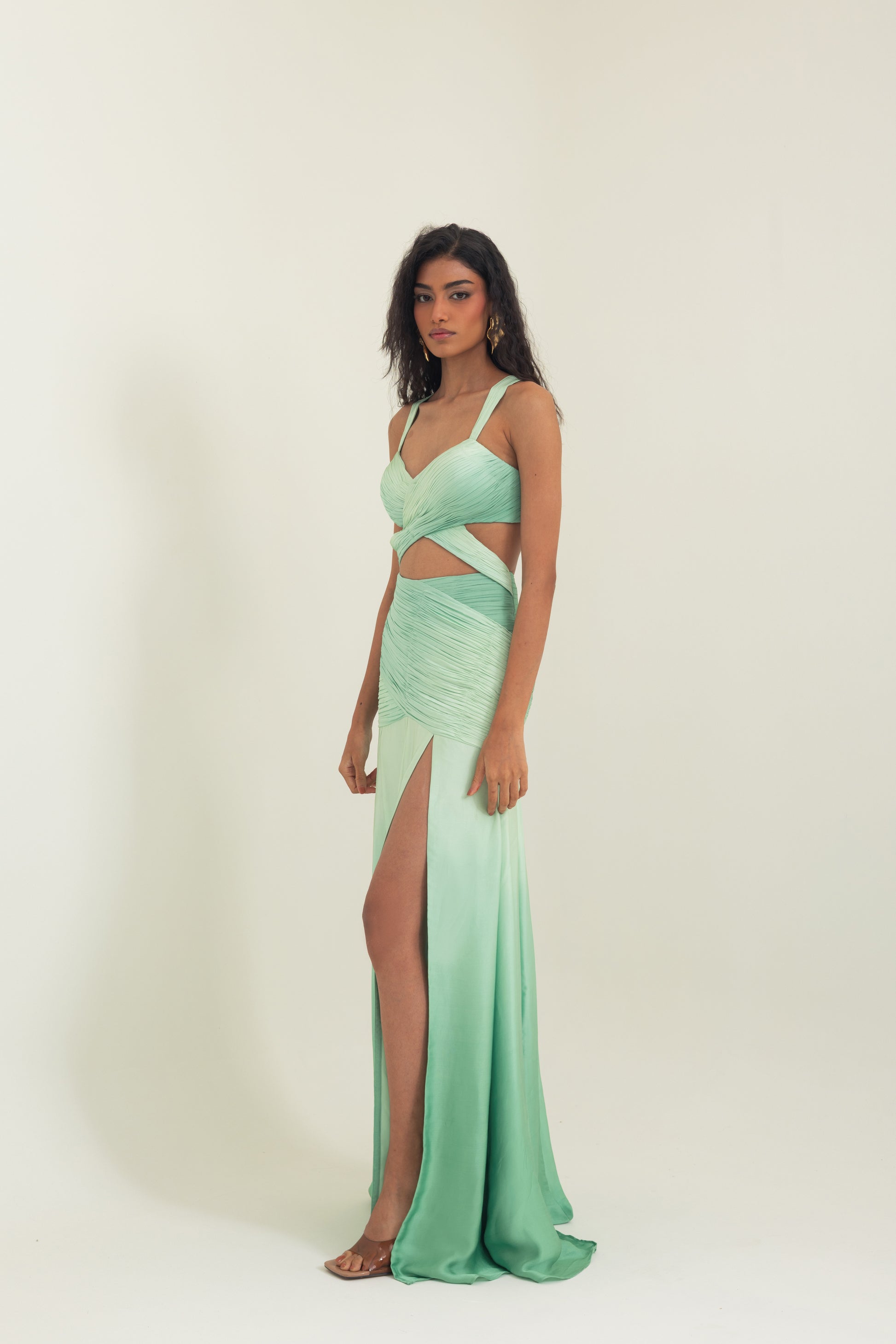 Inspired by the rich hues of Italian olives, this gown is crafted from luxurious satin georgette with a soft, elegant sheen. Hand-ruched detailing wraps around the bodice and waist, creating a flattering fit with a modern cut-out , floor-grazing skirt with a subtle slit, adding a whisper of allure.
